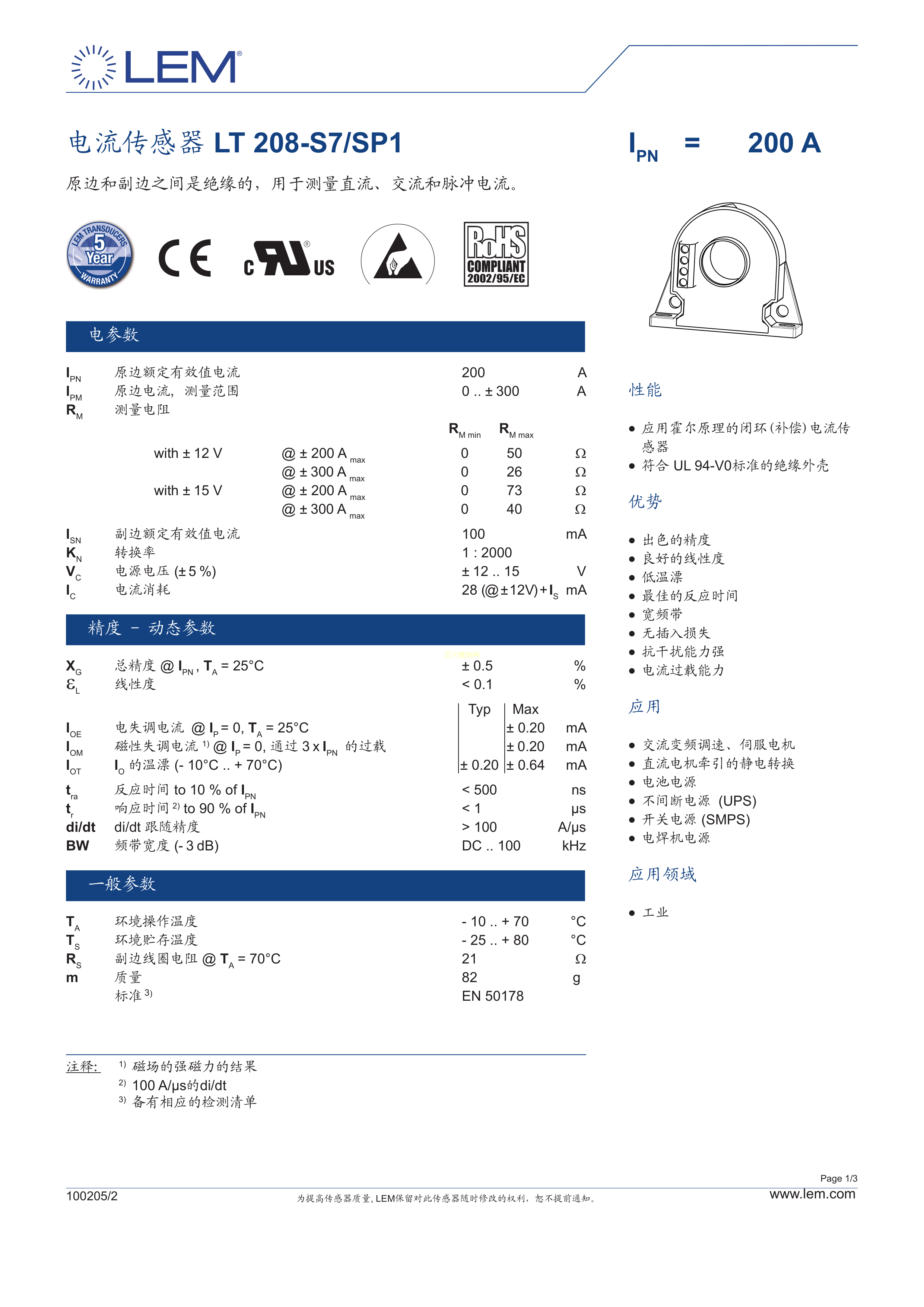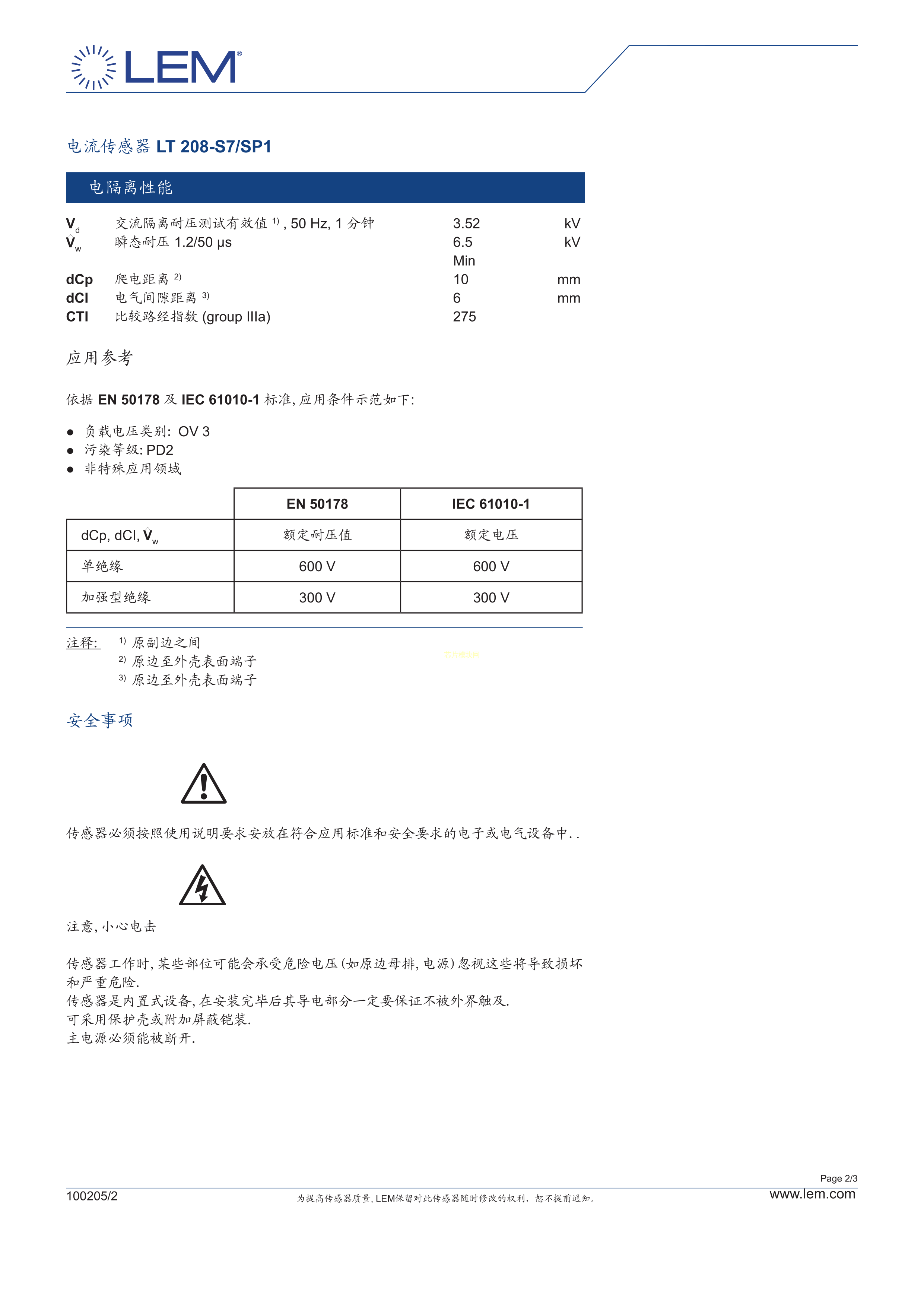 LT208-S7-SP1数据手册-封装LEM(莱姆)PDF规格书,中英文下载