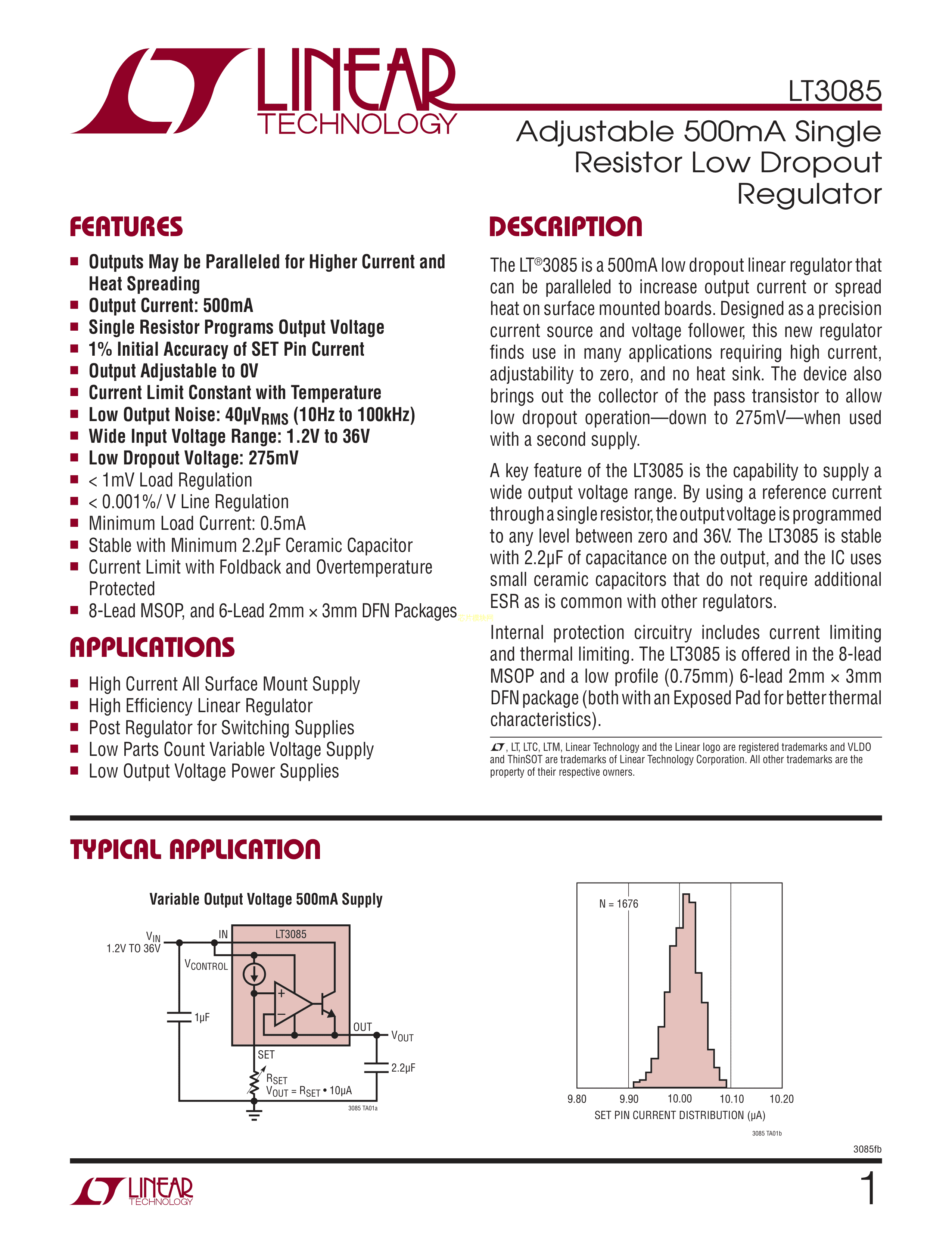 LT3085IMS8E#pbf数据手册MSOP-8EP封装ADI(亚德诺)-LINEARPDF规格书