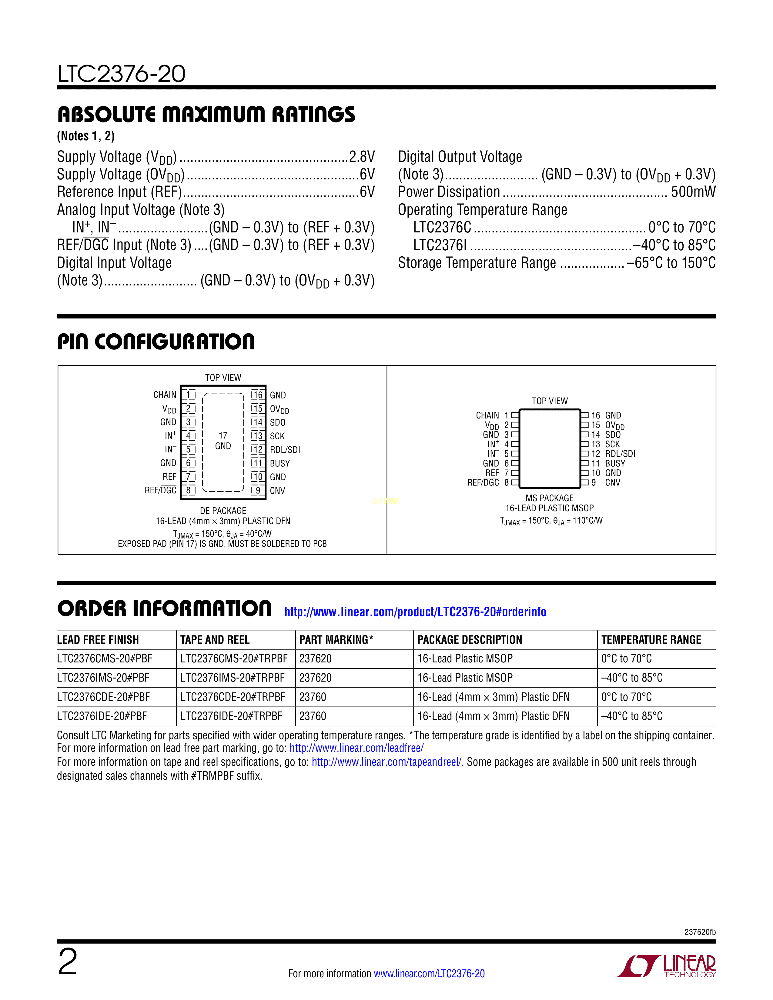 LTC2376CMS-20#PBF数据手册MSOP-16封装ADI(亚德诺)-LINEARPDF规格