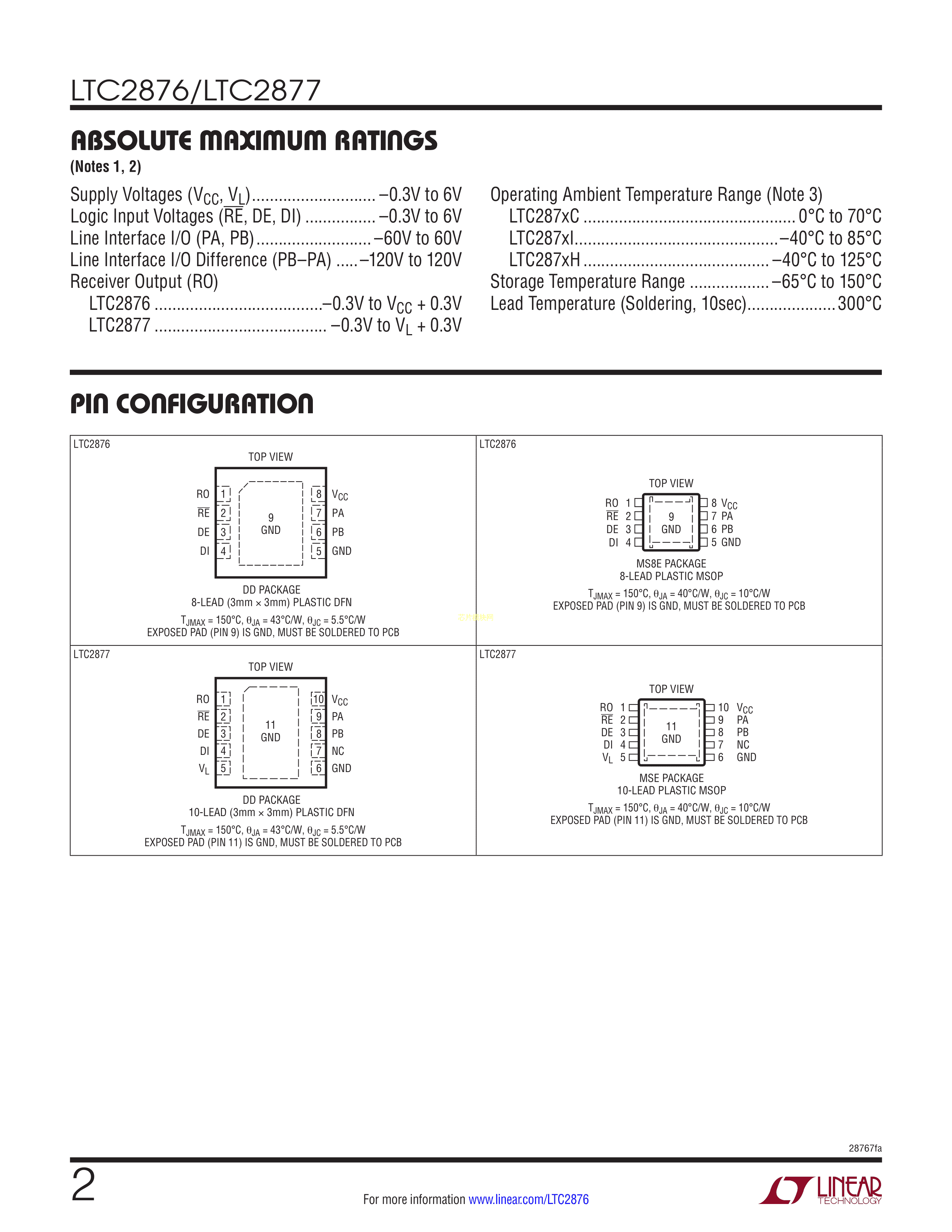 LTC2876IMS8E#PBF数据手册MSOP-8封装ADI(亚德诺)-LINEARPDF规格书,