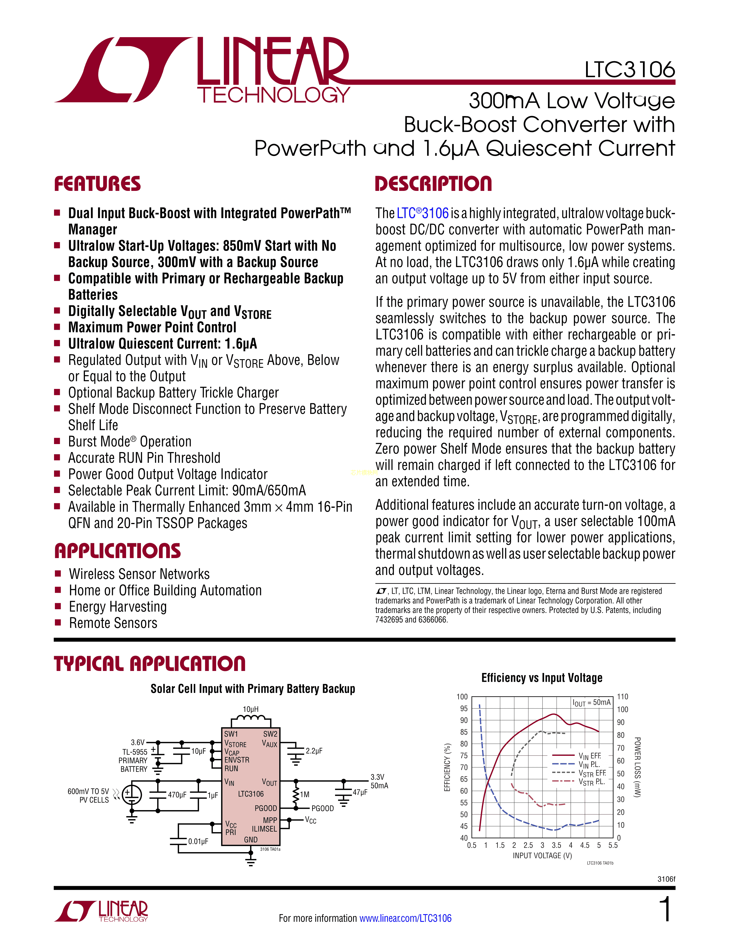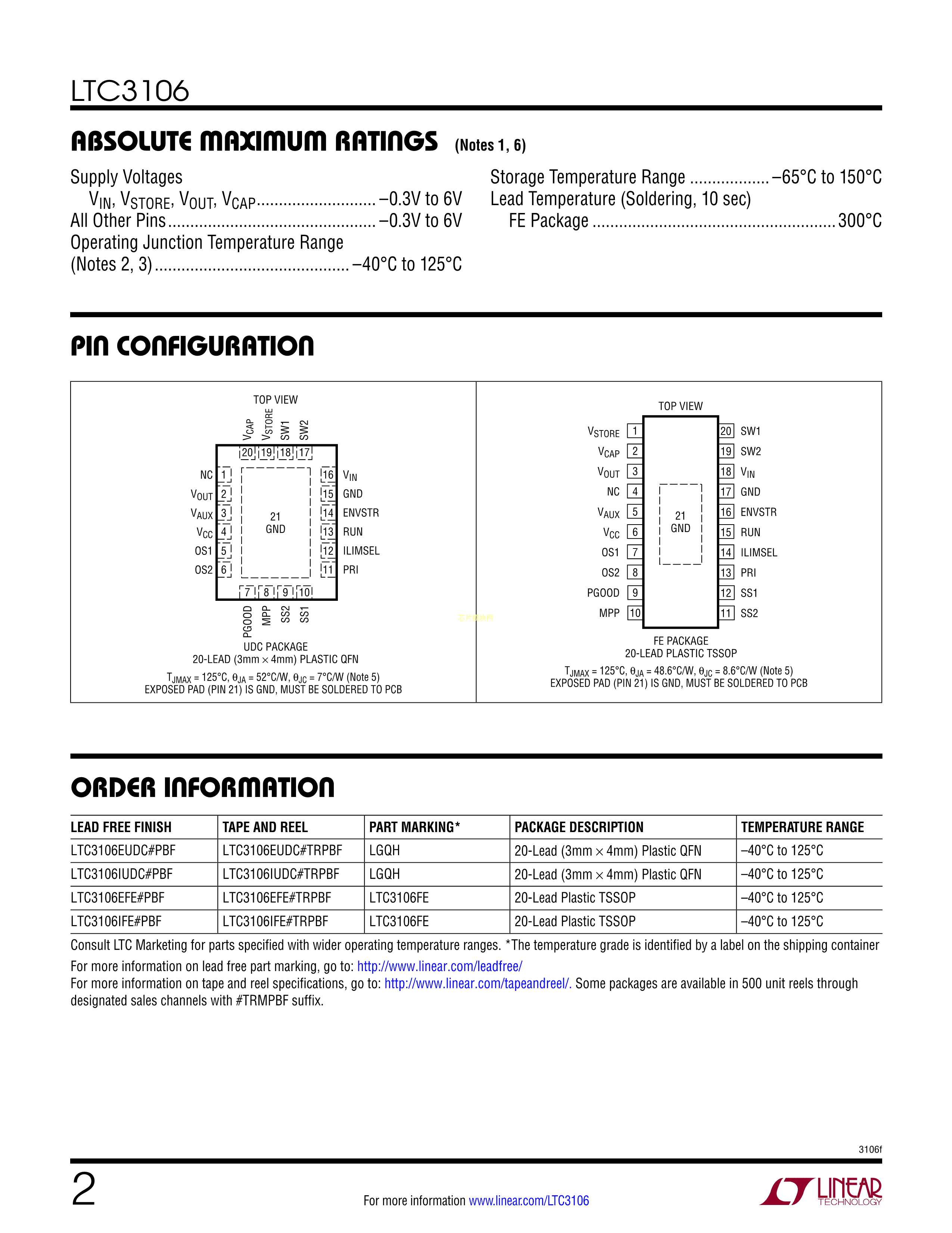 LTC3106IUDC#PBF数据手册QFN-20封装ADI(亚德诺)-LINEARPDF规格书,中