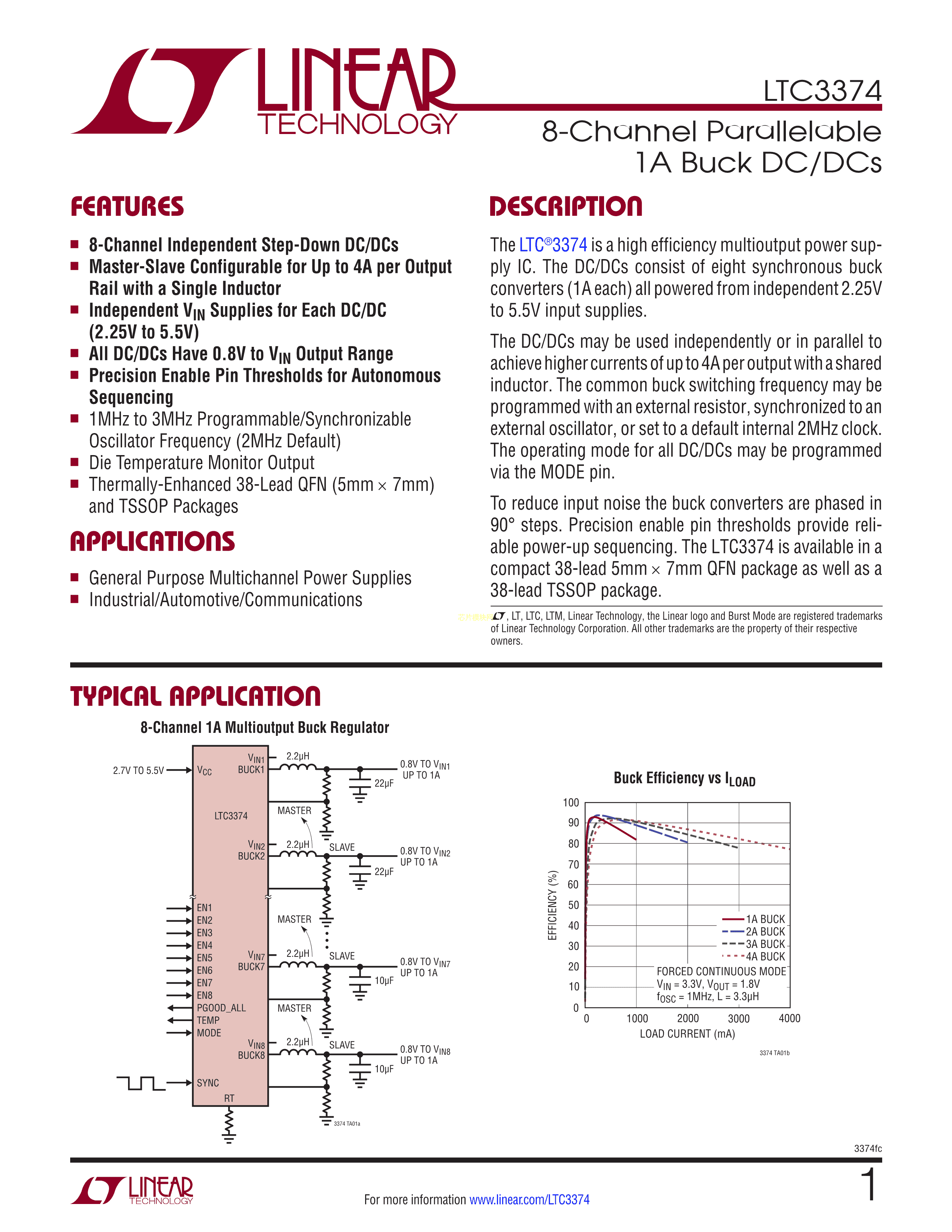 LTC3374HUHF#PBF数据手册QFN-38封装ADI(亚德诺)-LINEARPDF规格书,中