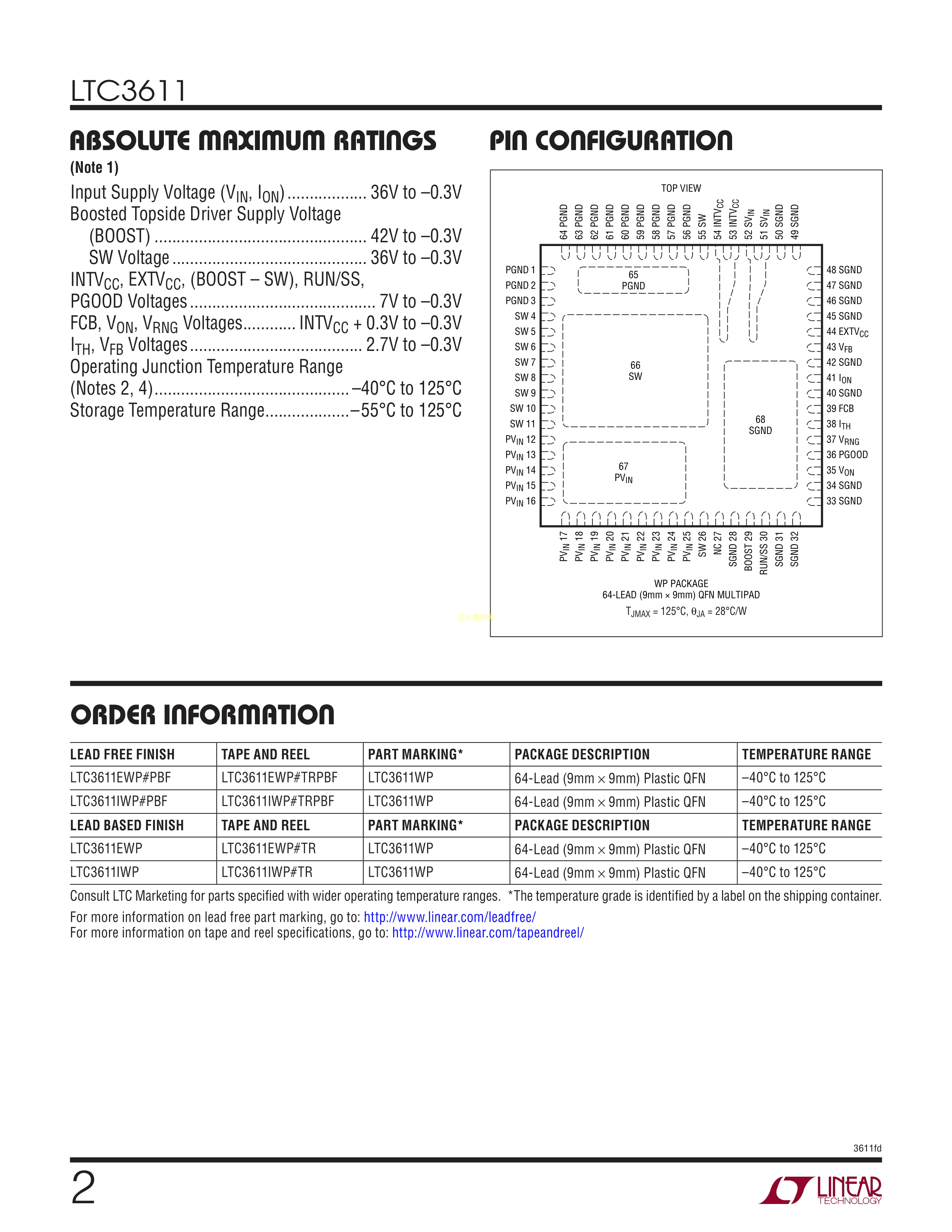 LTC3611IWP#PBF数据手册QFN-64封装ADI(亚德诺)-LINEARPDF规格书,中英