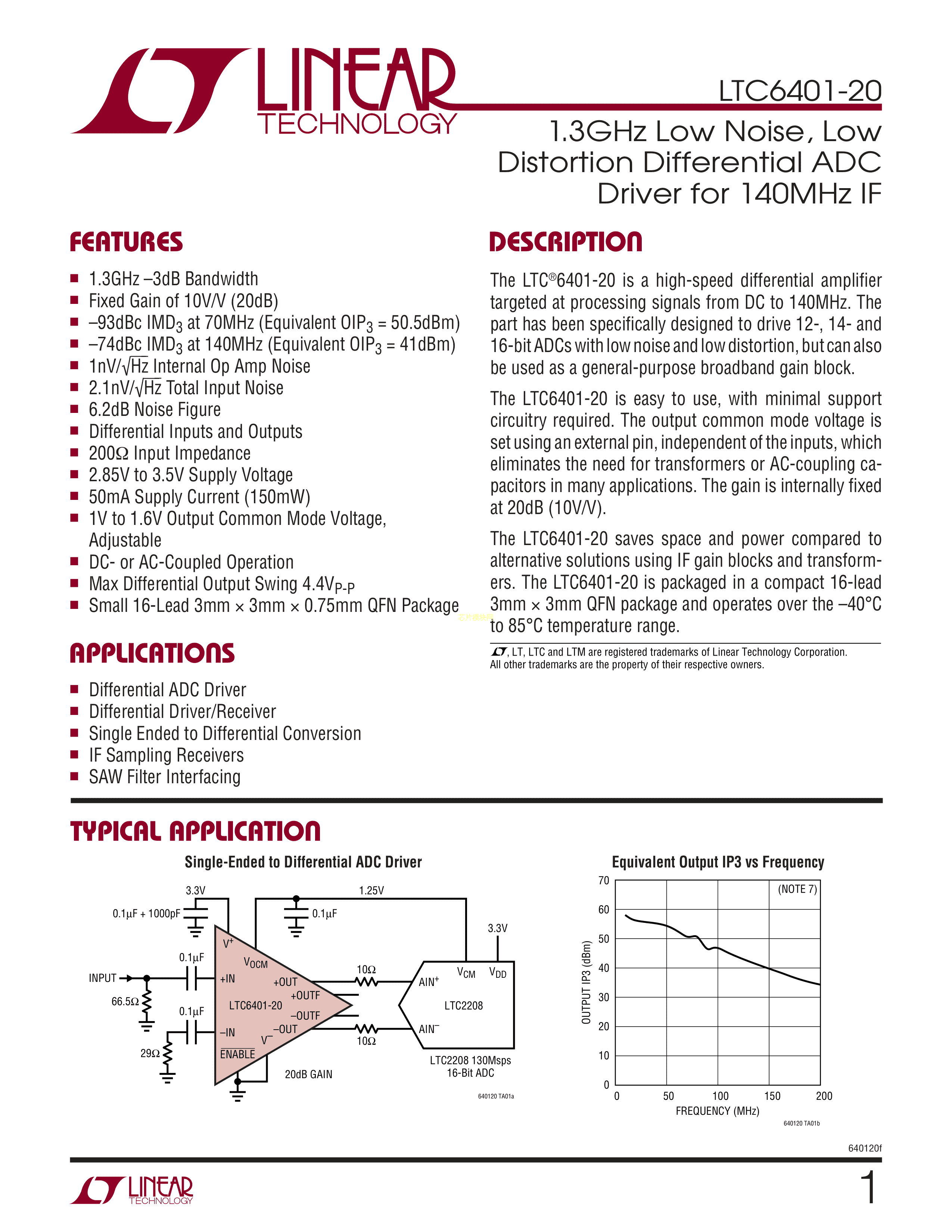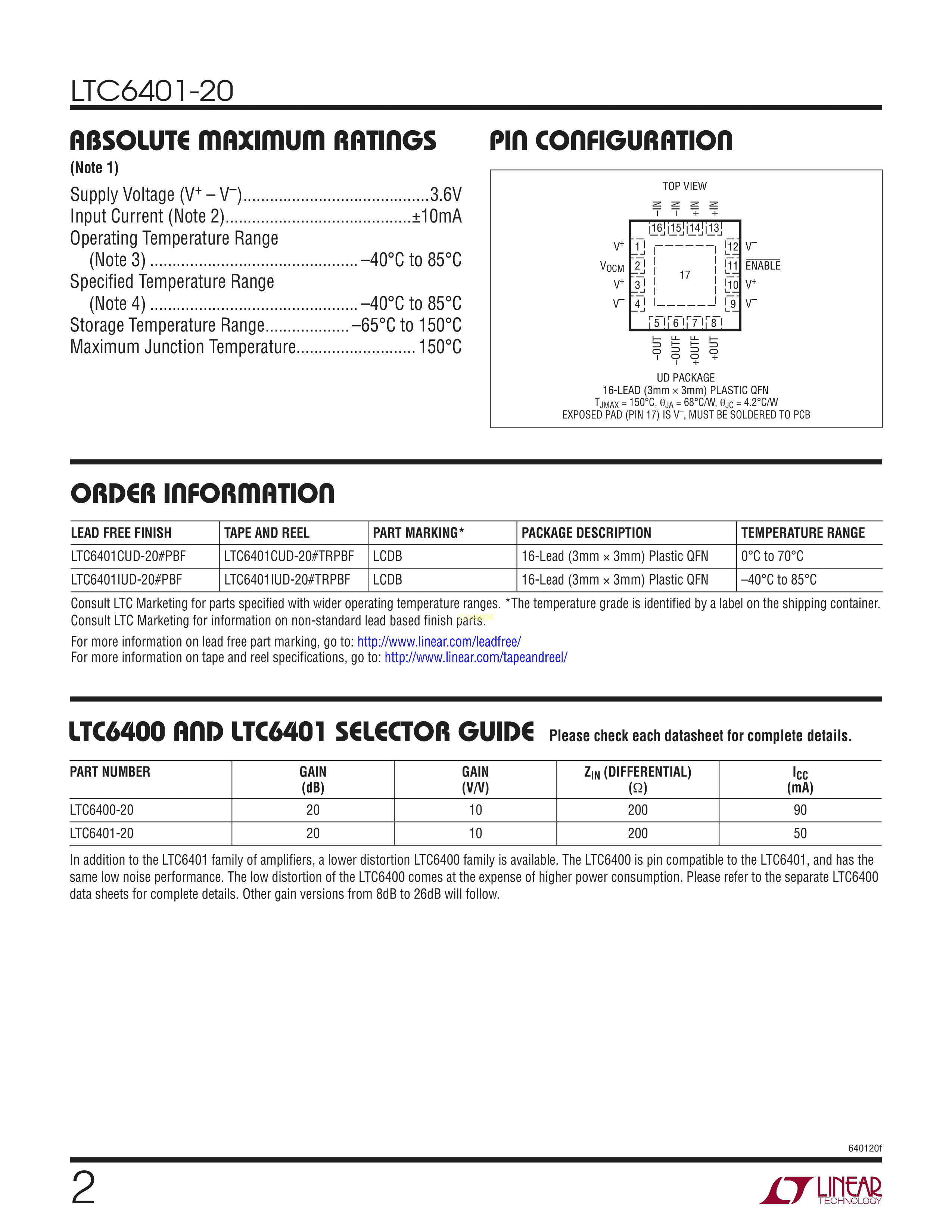 LTC6401IUD-20#TRPBF数据手册QFN-16封装ADI(亚德诺)-LINEARPDF规