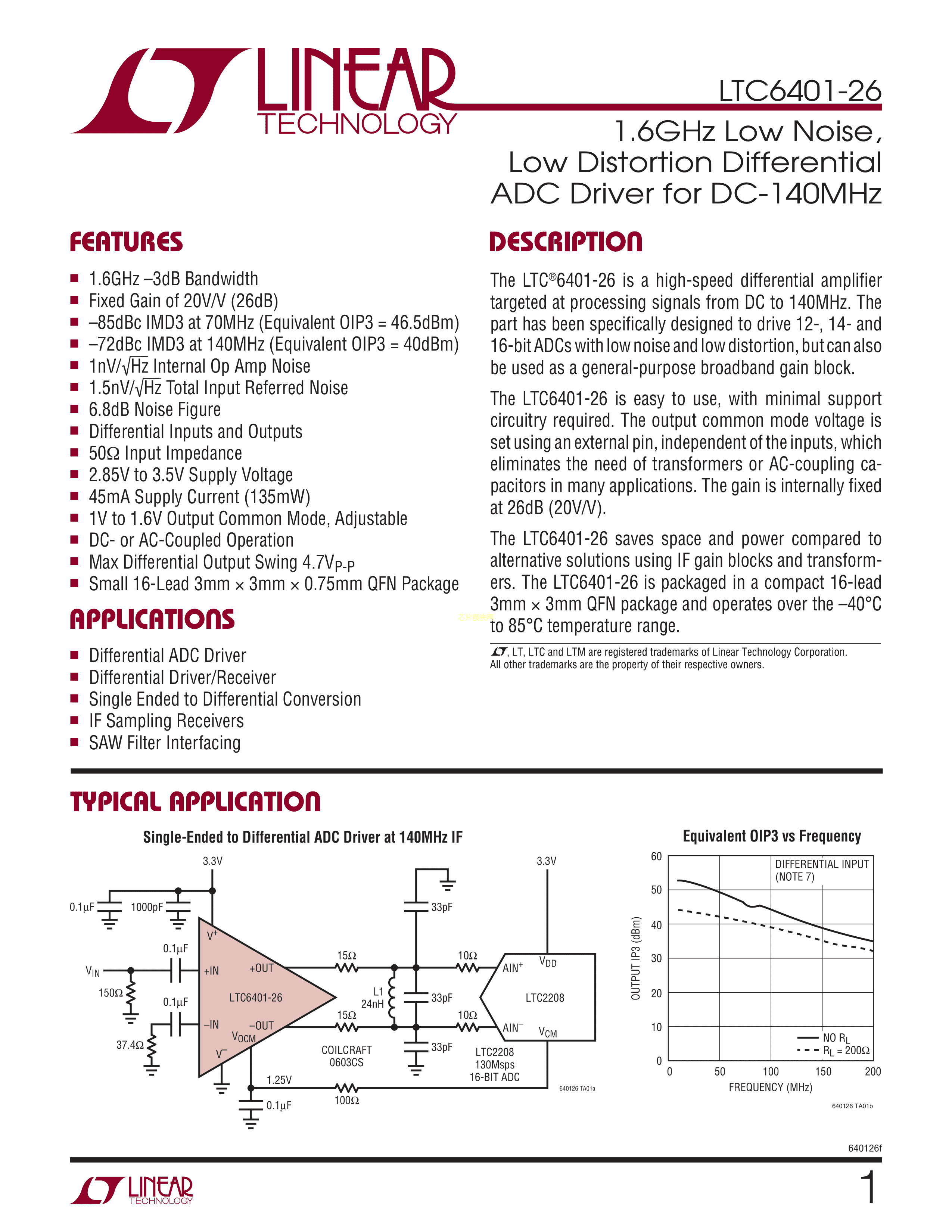 LTC6401IUD-26#PBF数据手册QFN-16封装ADI(亚德诺)-LINEARPDF规格书