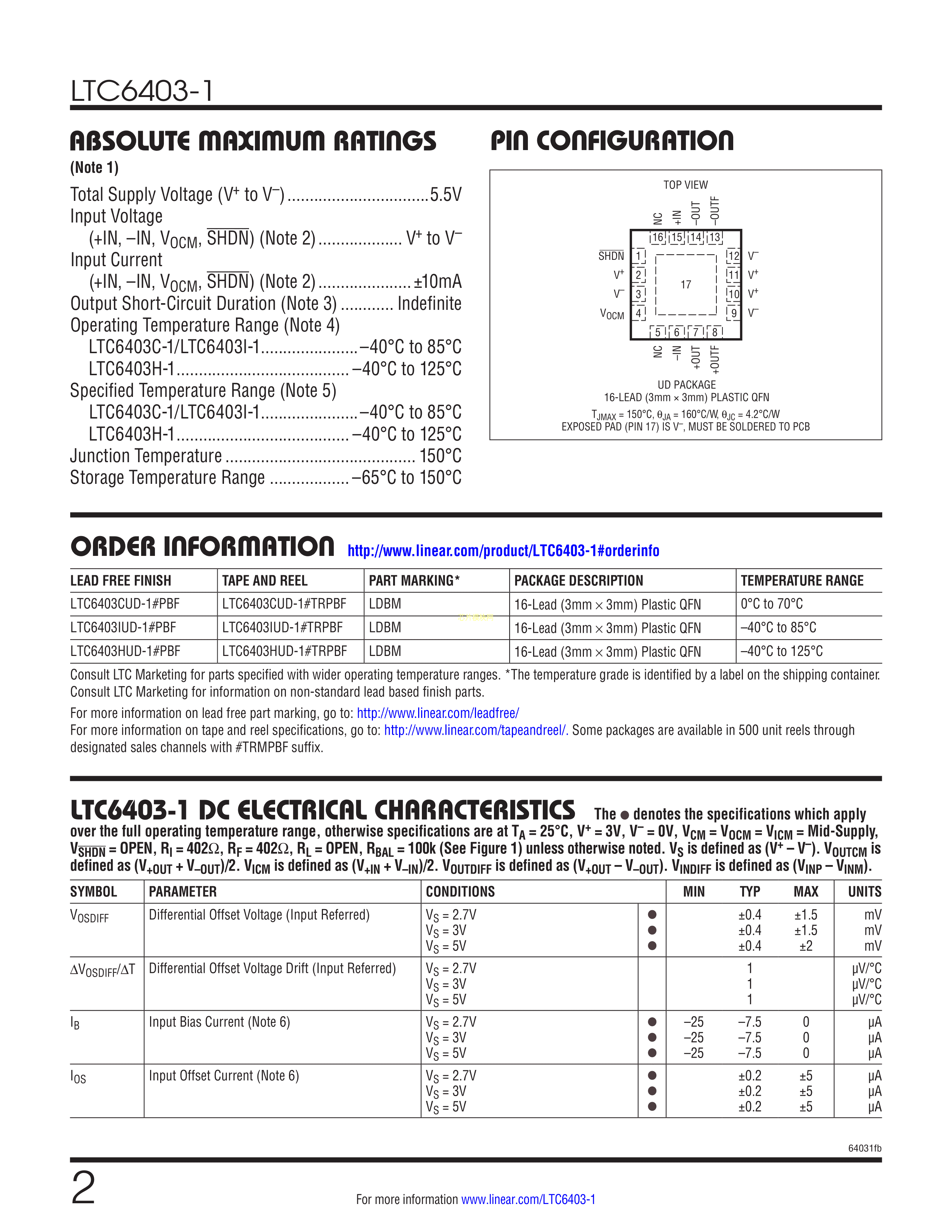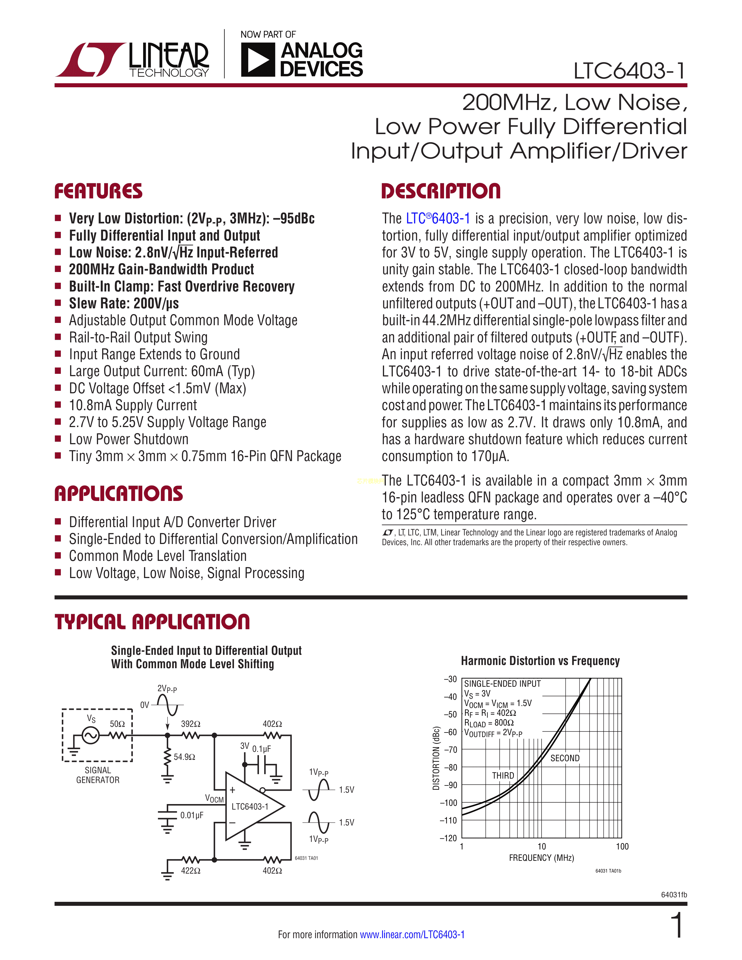 LTC6403HUD-1#PBF数据手册QFN-16封装ADI(亚德诺)-LINEARPDF规格书,