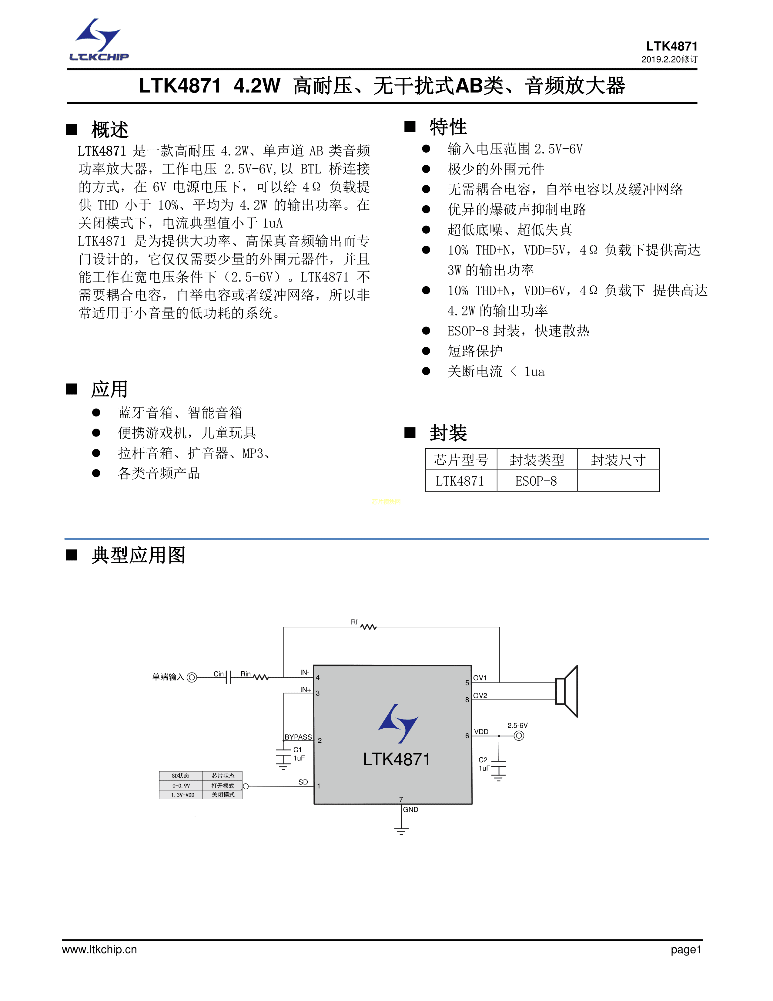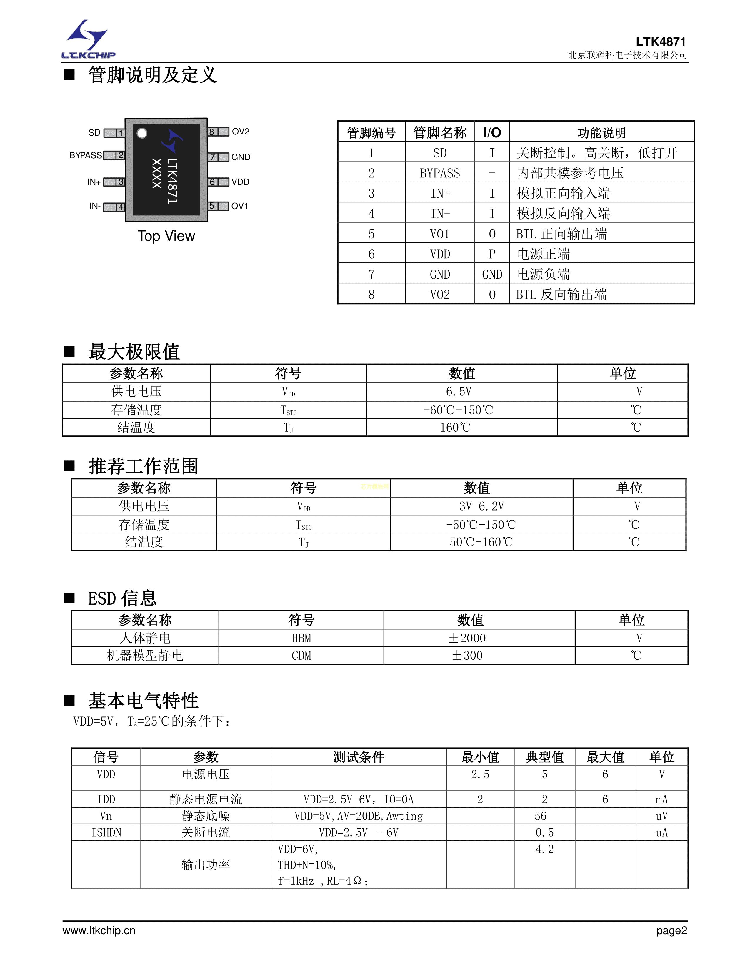 LTK4871数据手册ESOP-8封装LTKCHIP(联辉科)PDF规格书,中英文下载