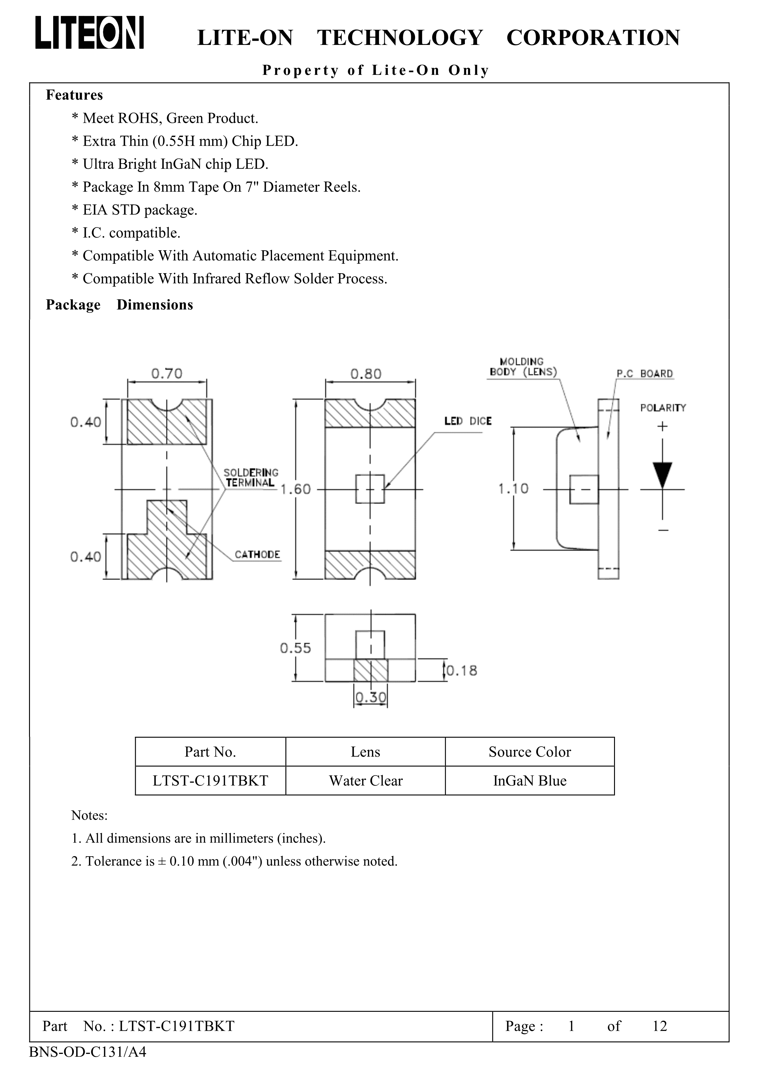 LTST-C191TBKT数据手册0603封装LITEON(台湾光宝)PDF规格书,中英文下载