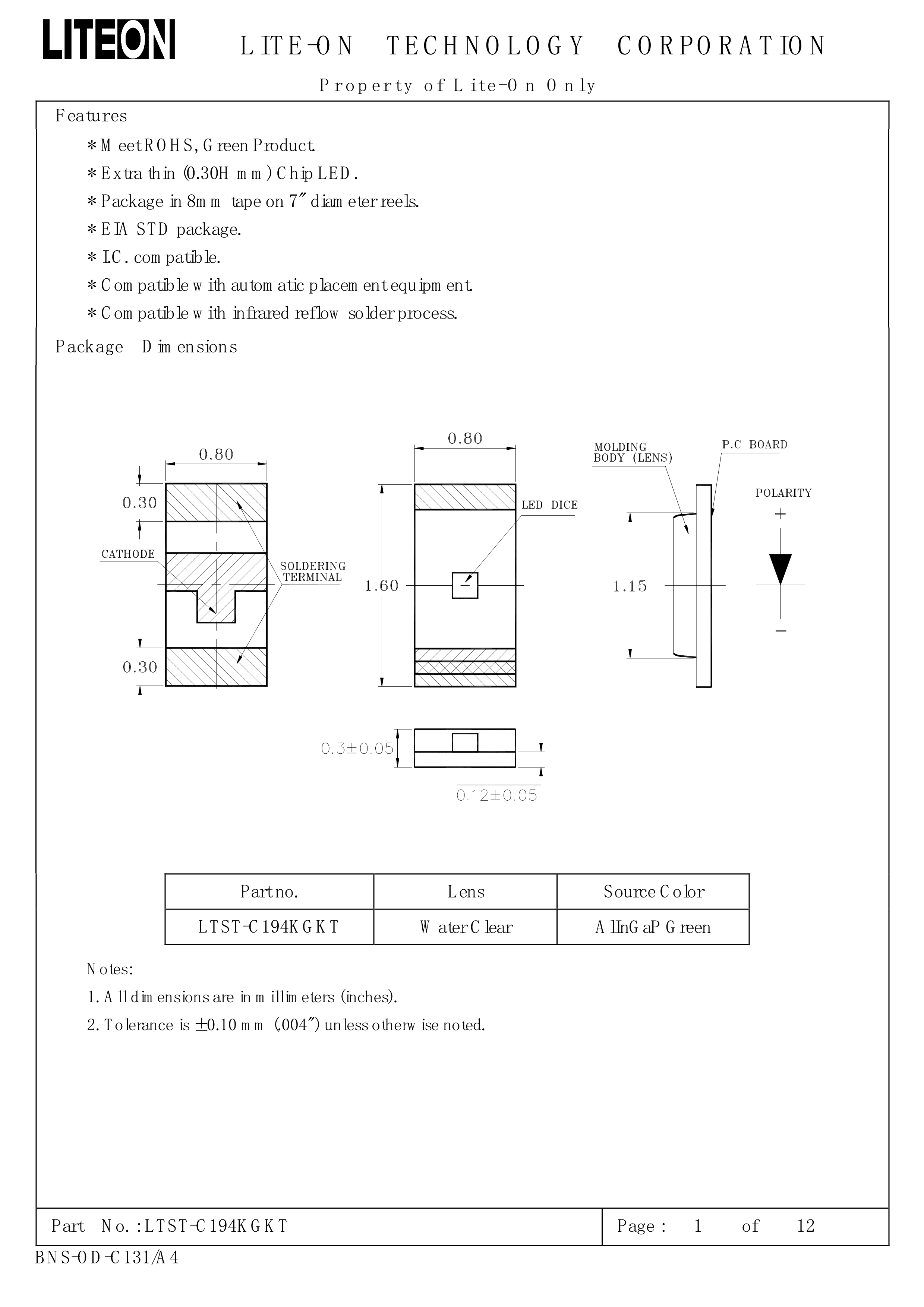LTST-C194KGKT数据手册0603封装LITEON(台湾光宝)PDF规格书,中英文下载