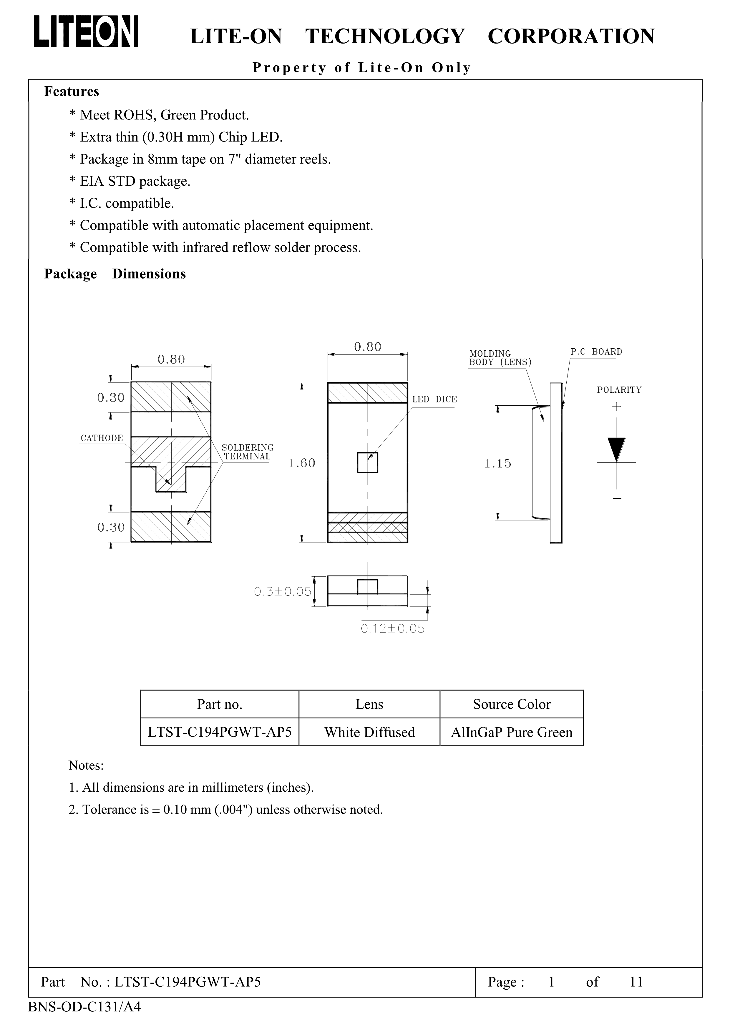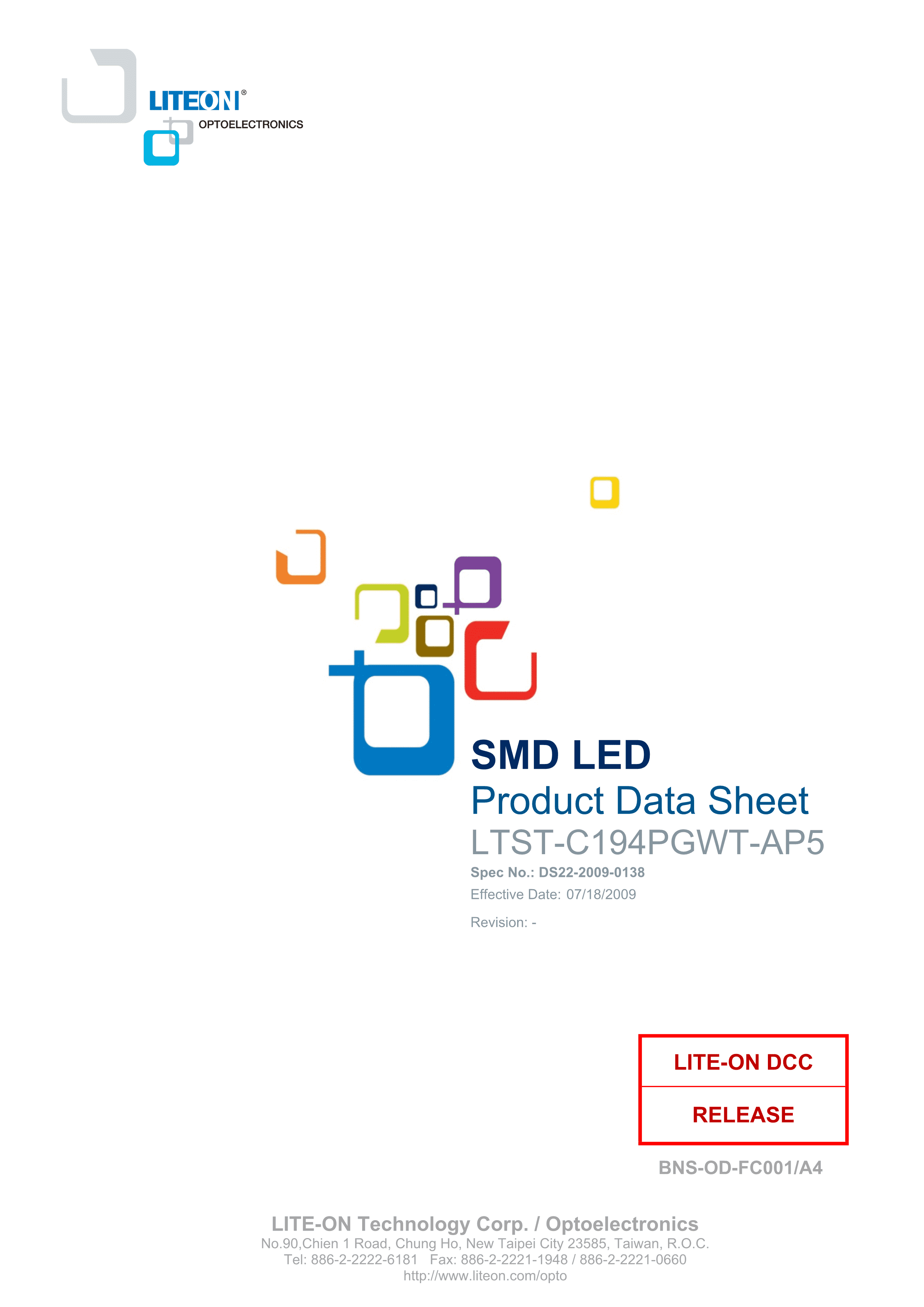 LTST-C194PGWT-AP5数据手册0603封装LITEON(台湾光宝)PDF规格书,中英文下