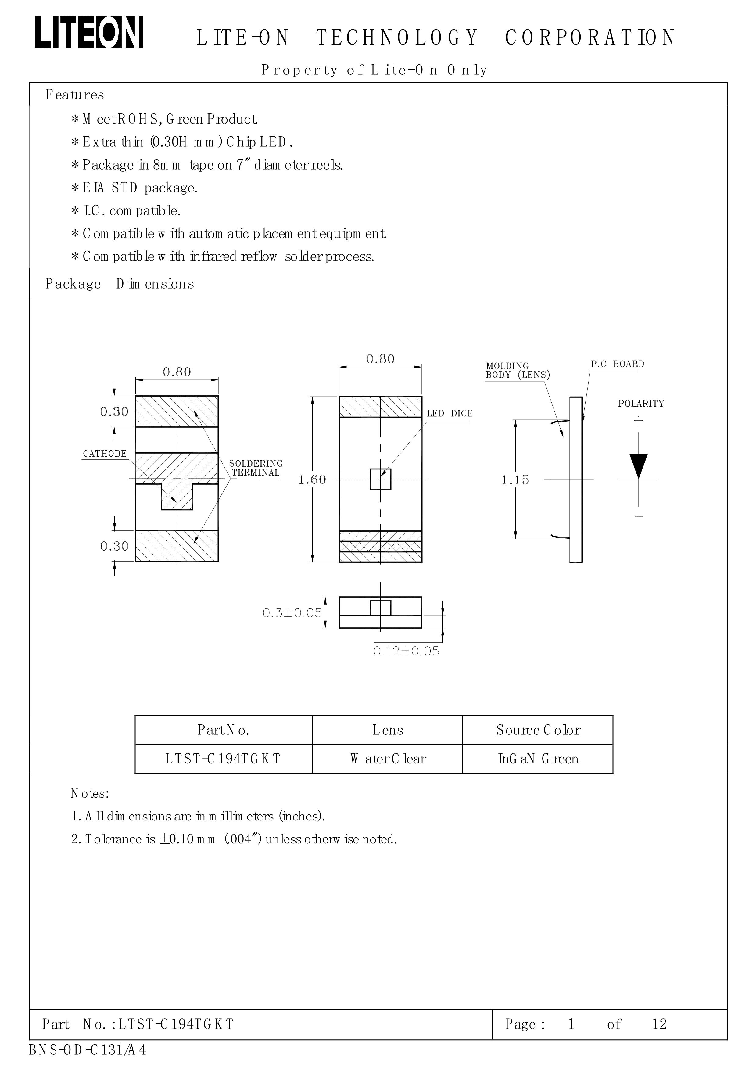 LTST-C194TGKT数据手册0603封装LITEON(台湾光宝)PDF规格书,中英文下载