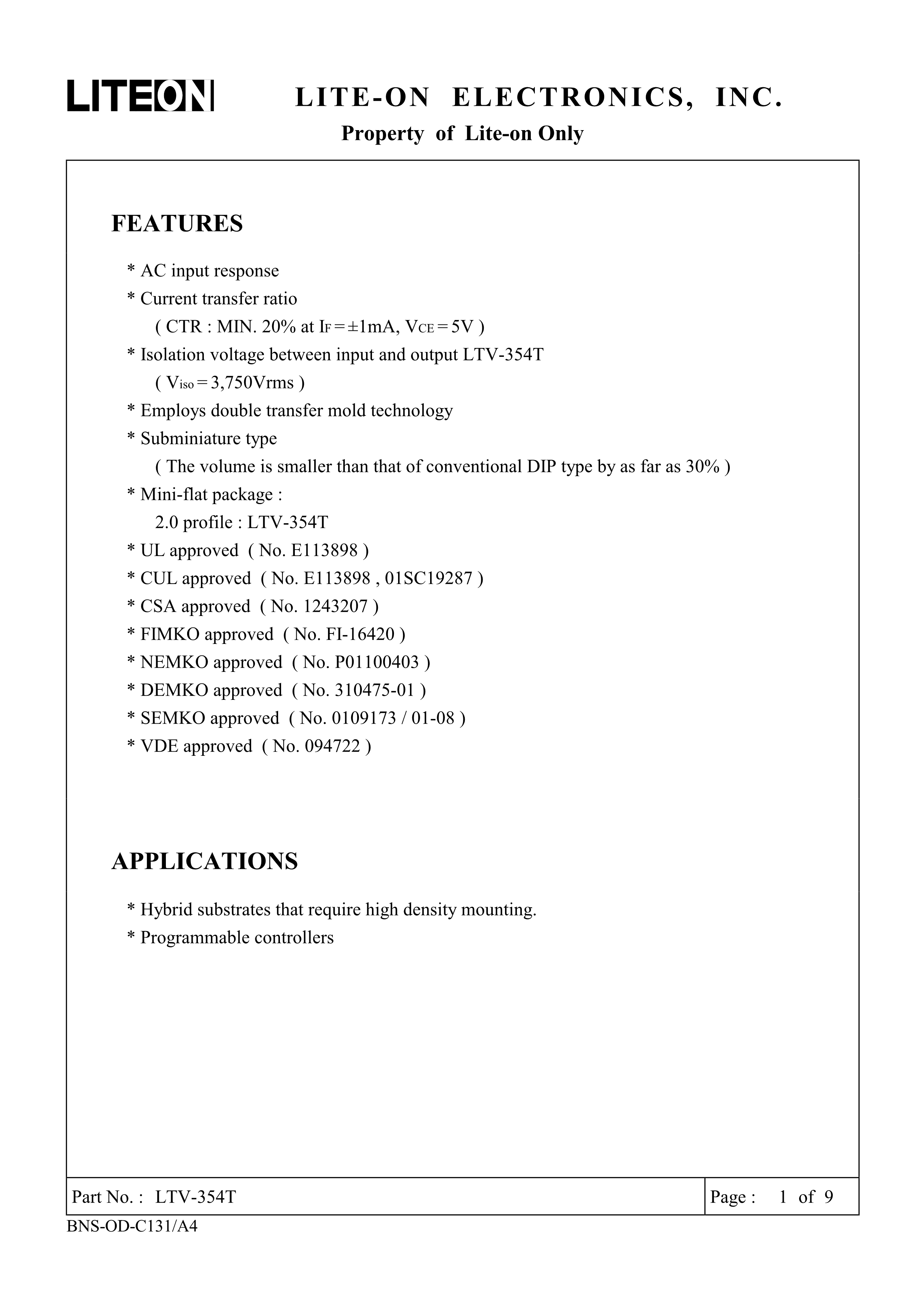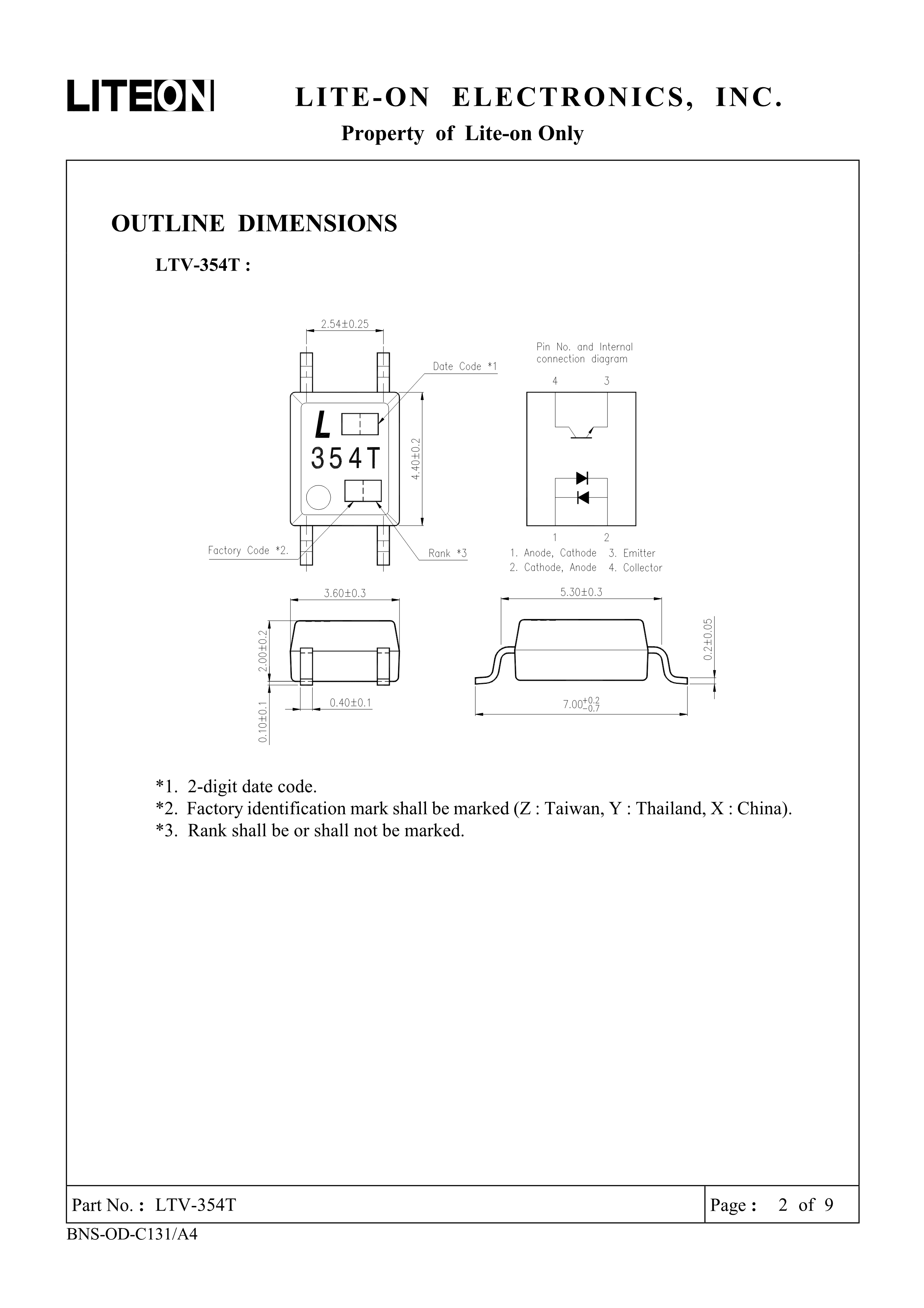 LTV-354T数据手册SOP-4_2.54封装LITEON(台湾光宝)PDF规格书,中英文下载
