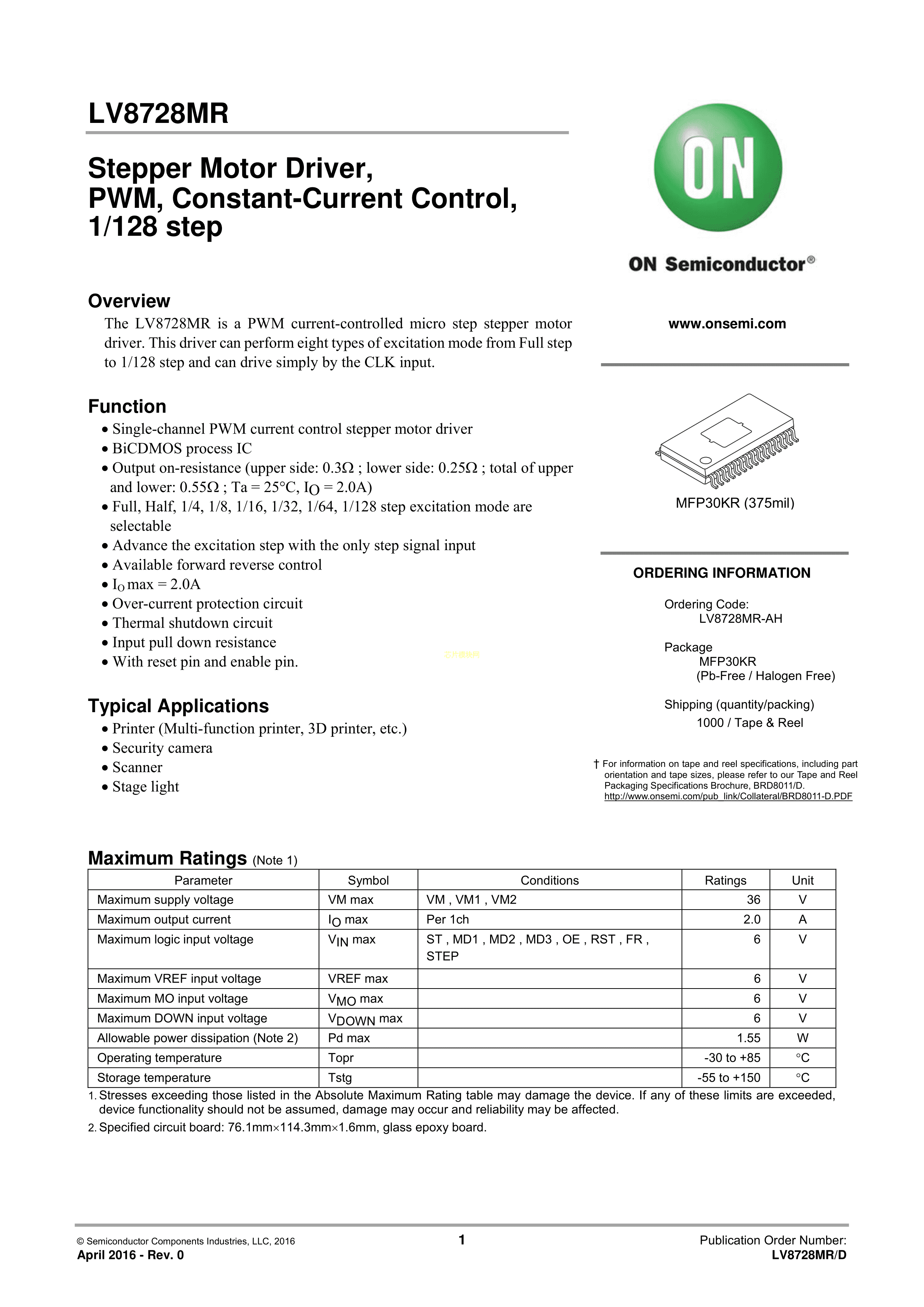 LV8728MR-AH数据手册MFP30KR封装onsemi(安森美)PDF规格书,中英文下载