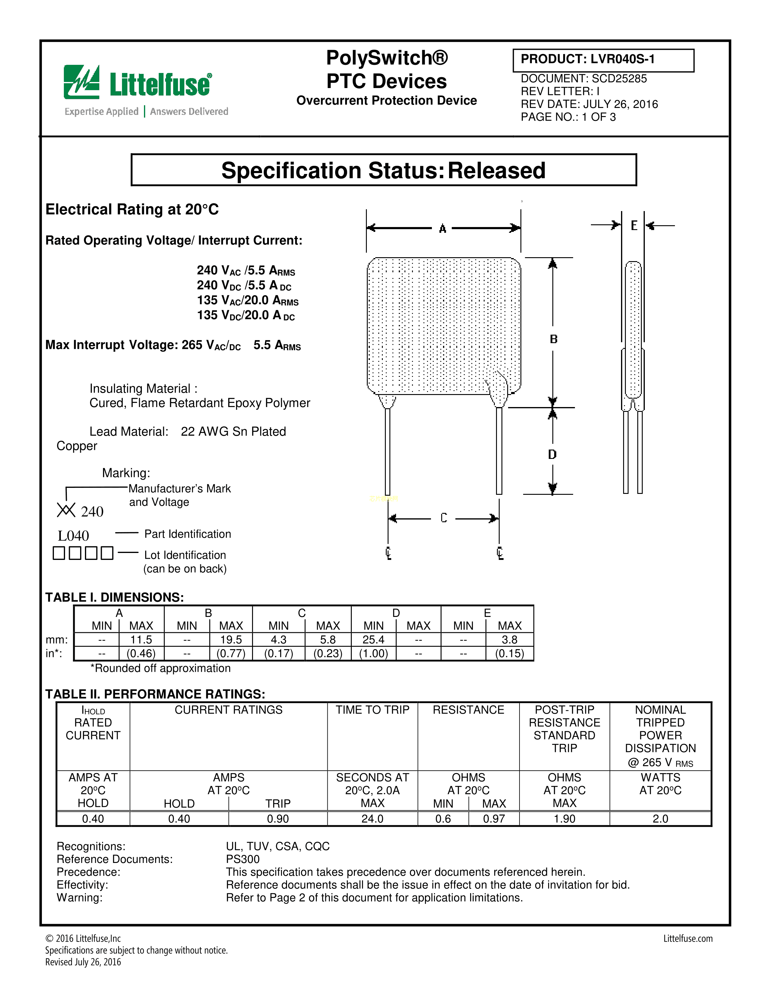 LVR040S-1数据手册径向引线封装Littelfuse(美国力特)PDF规格书,中英文下载