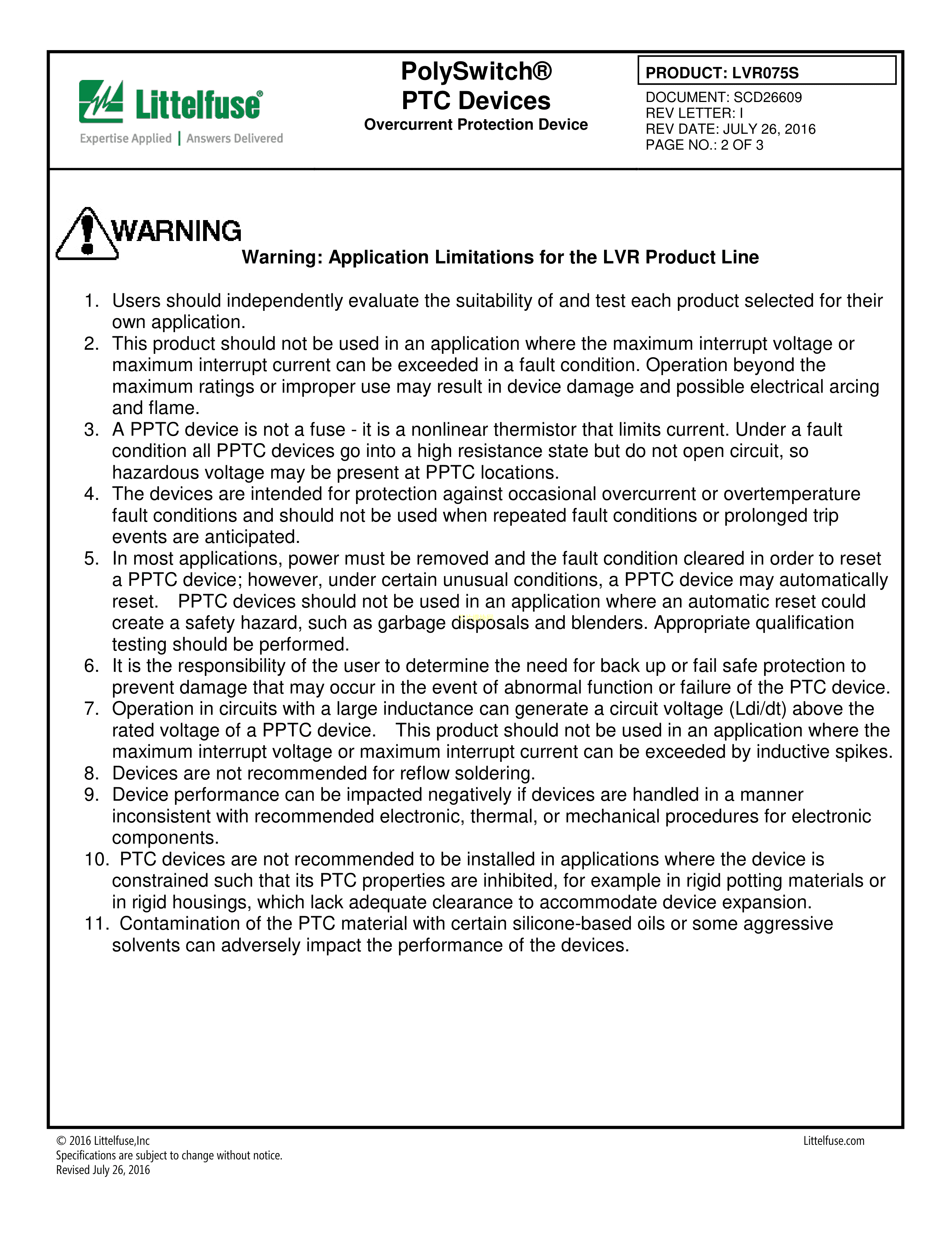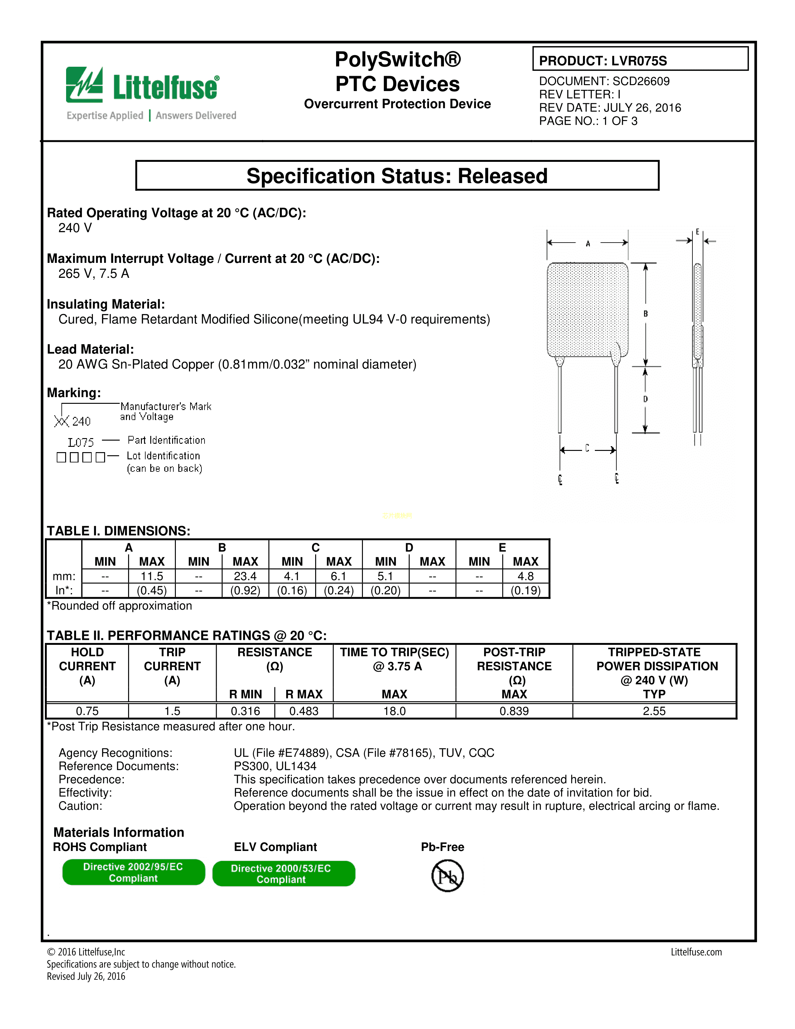 LVR075S数据手册径向引线P5.08mm封装Littelfuse(美国力特)PDF规格书,中英文下载