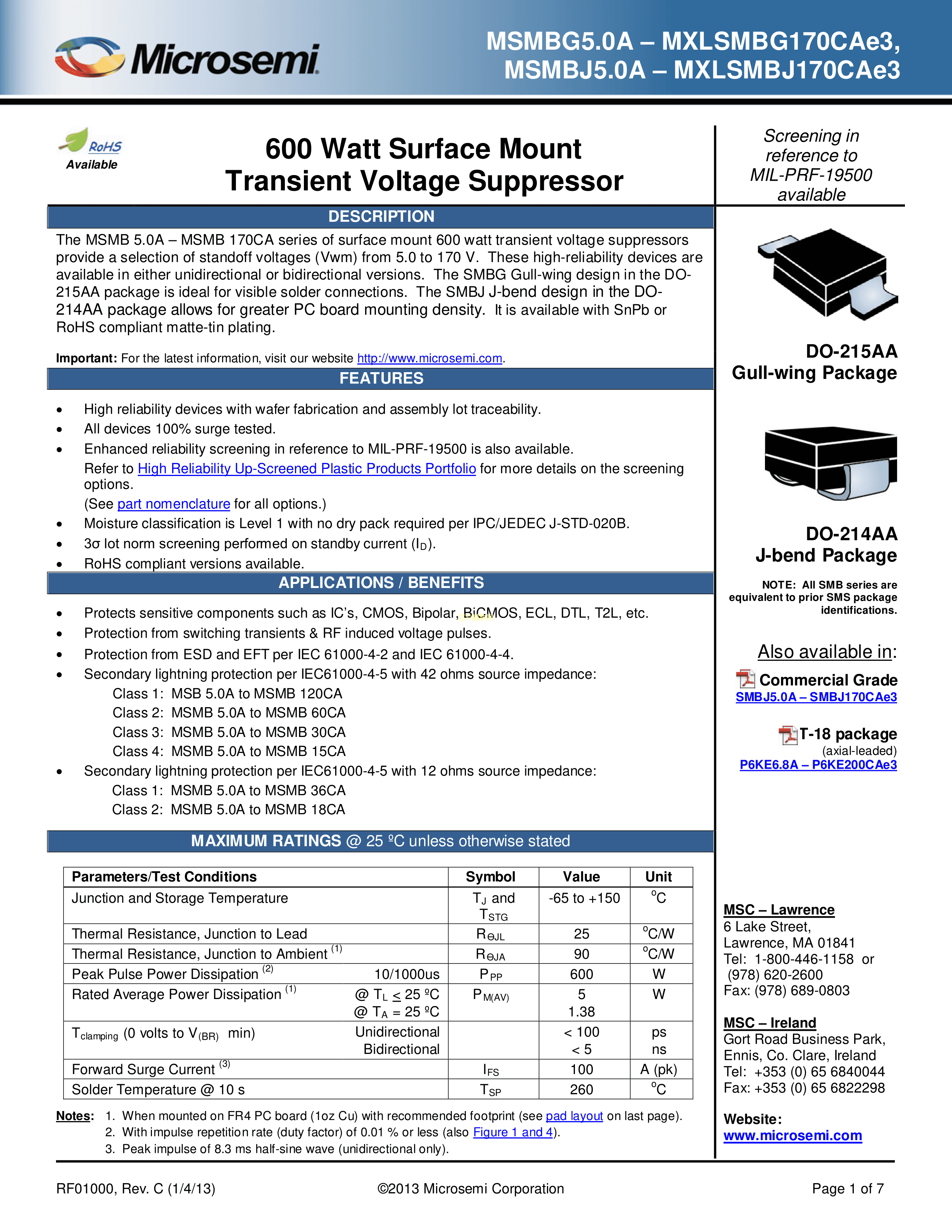 MASMBG30CAE3数据手册DO-215AA(SMBG)封装Microsemi(美高森美)PDF