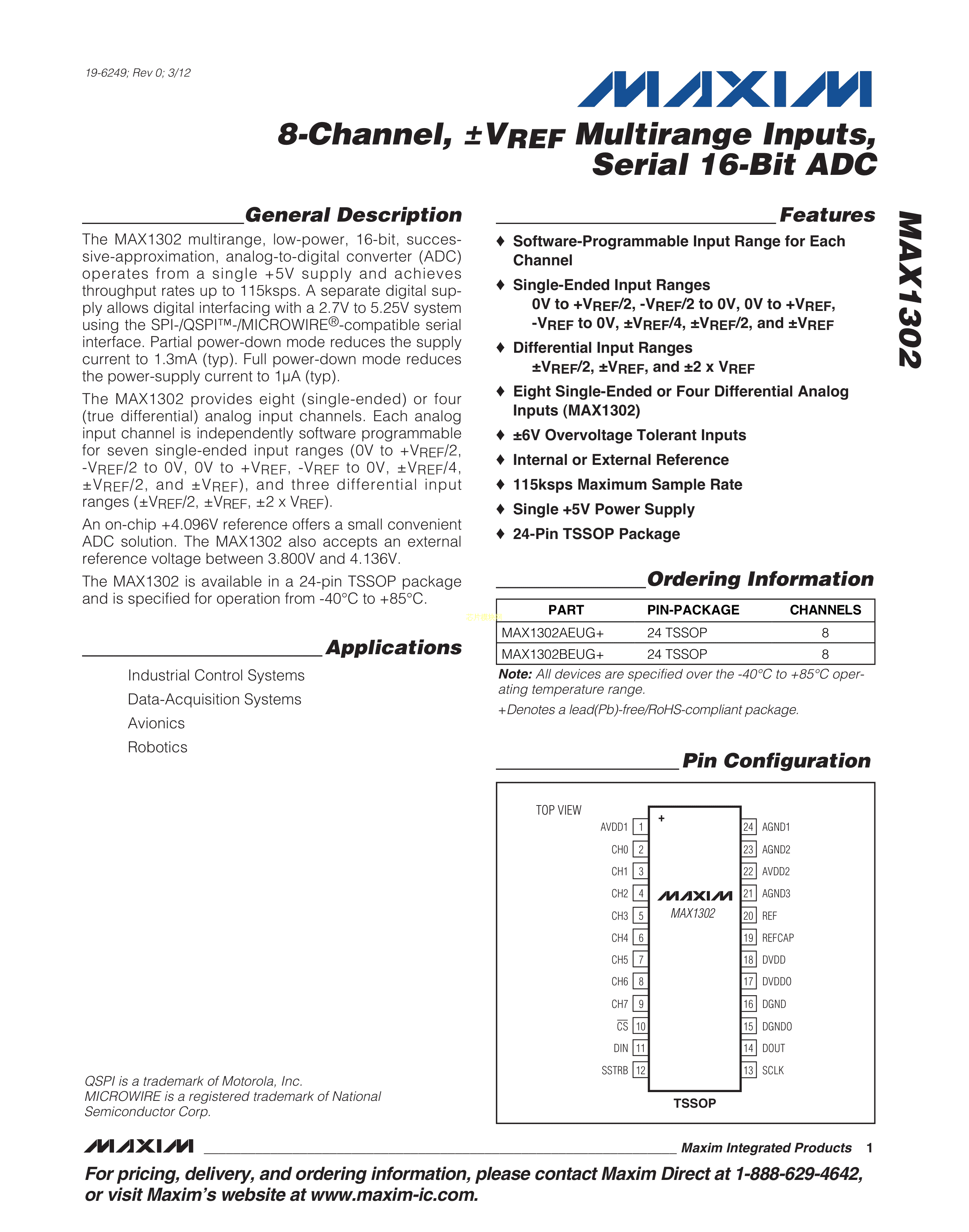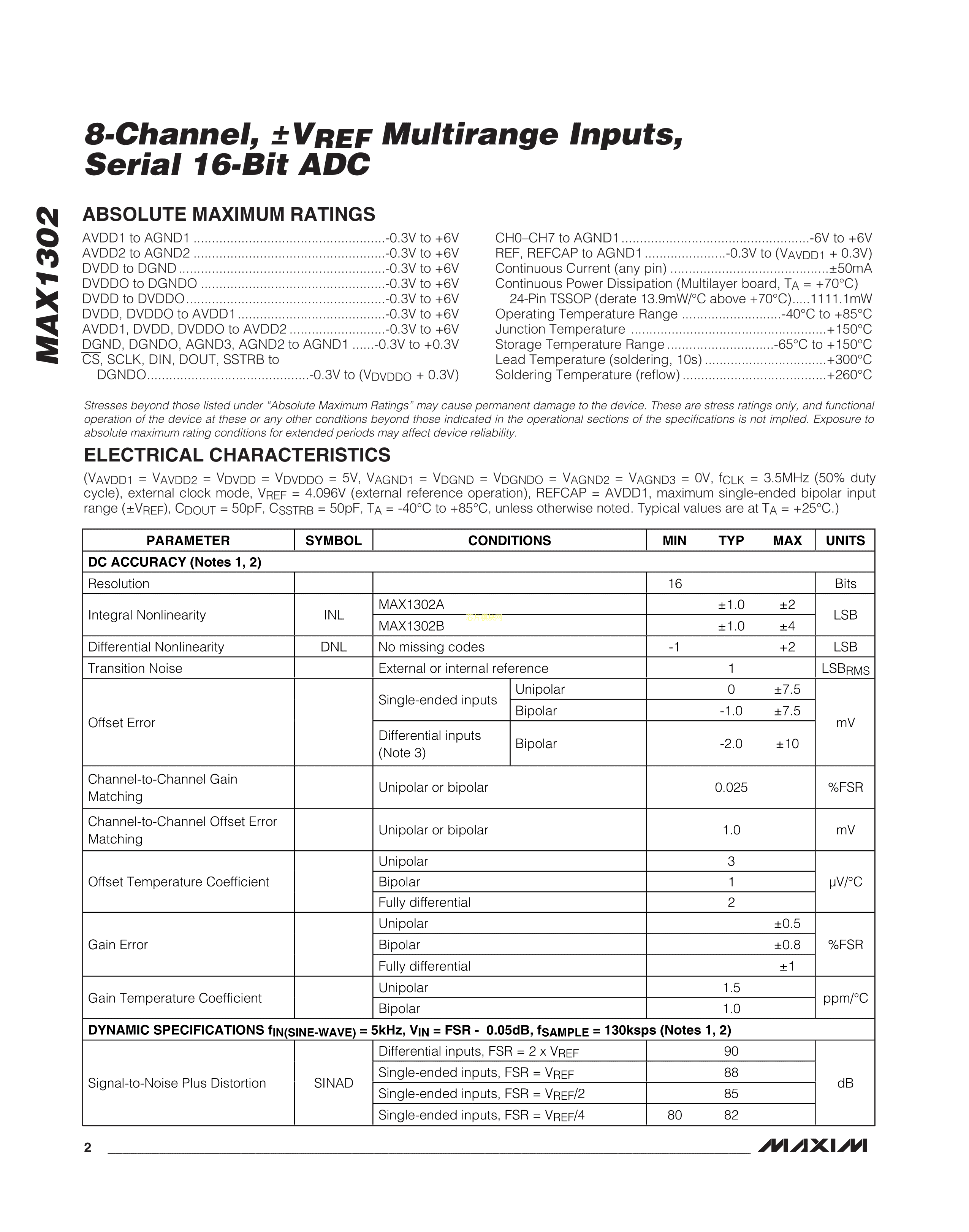 MAX1302AEUG+数据手册TSSOP-24封装MAXIM(美信)PDF规格书,中英文下载