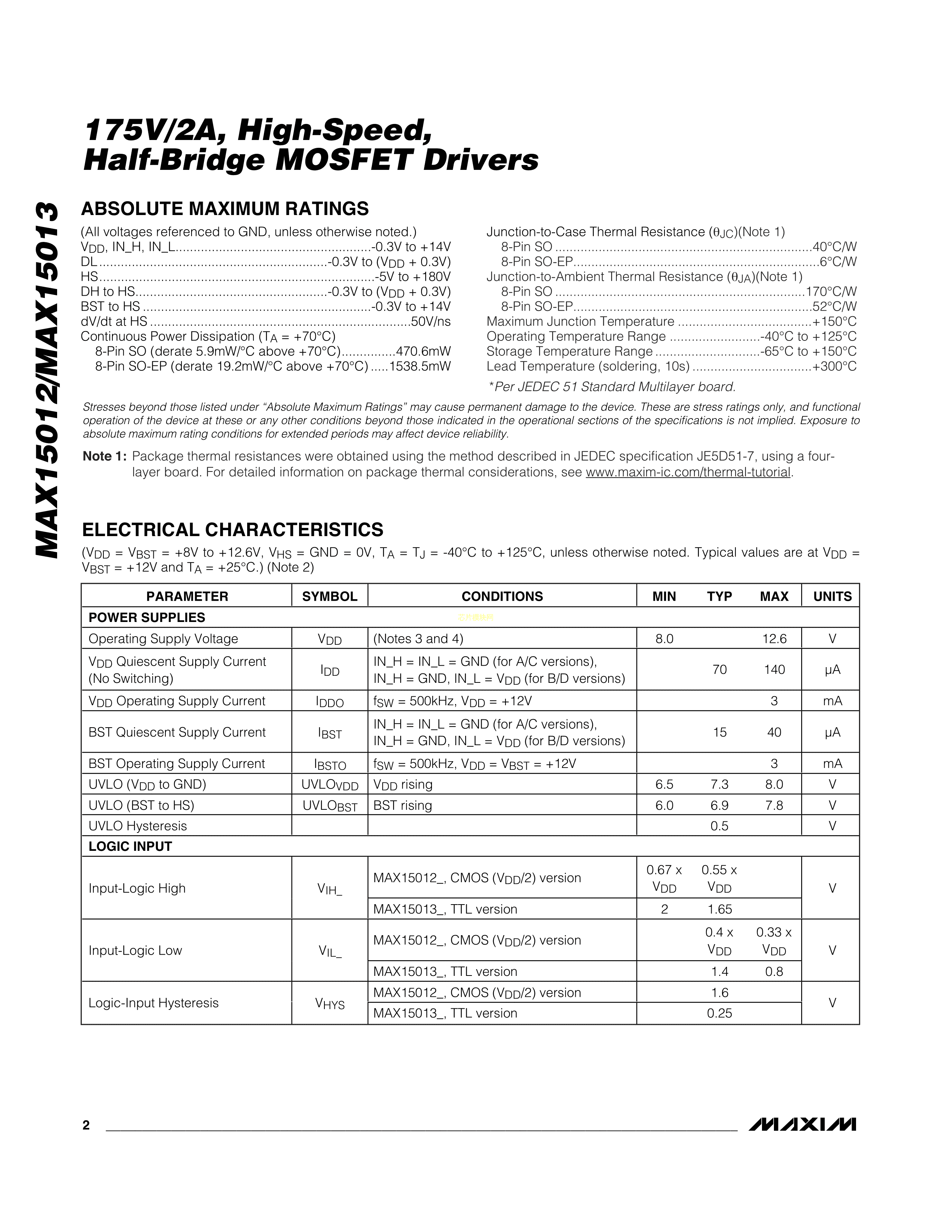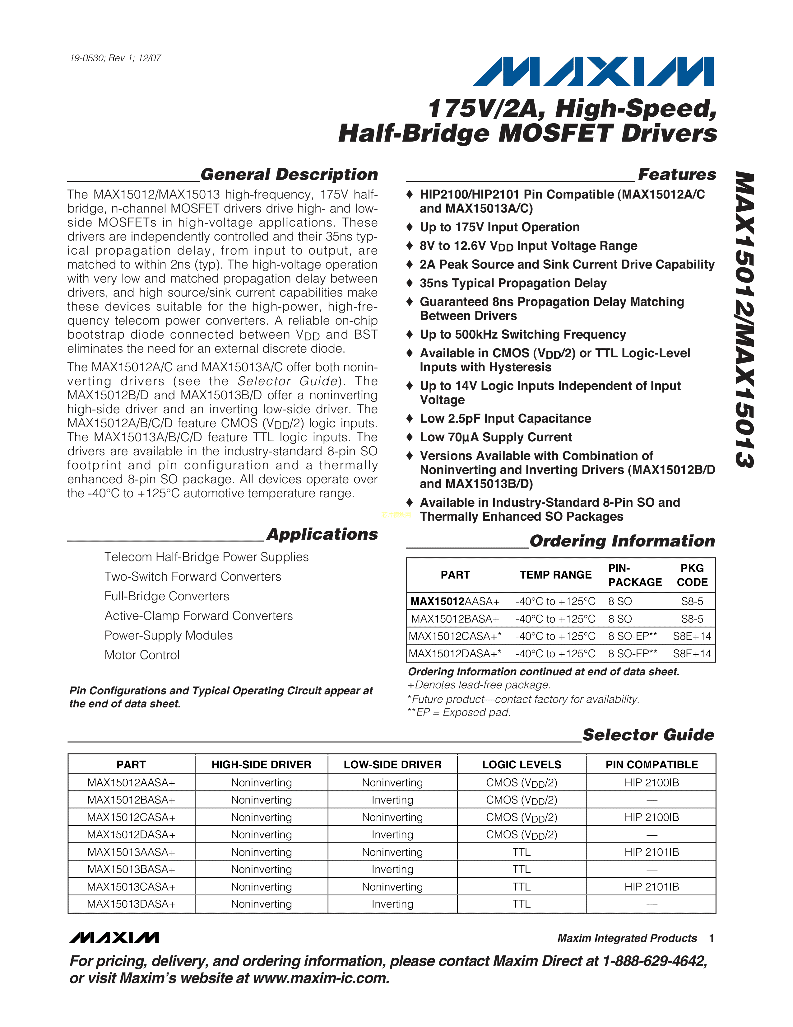 MAX15013BASA+T数据手册SOIC-8封装MAXIM(美信)PDF规格书,中英文下载