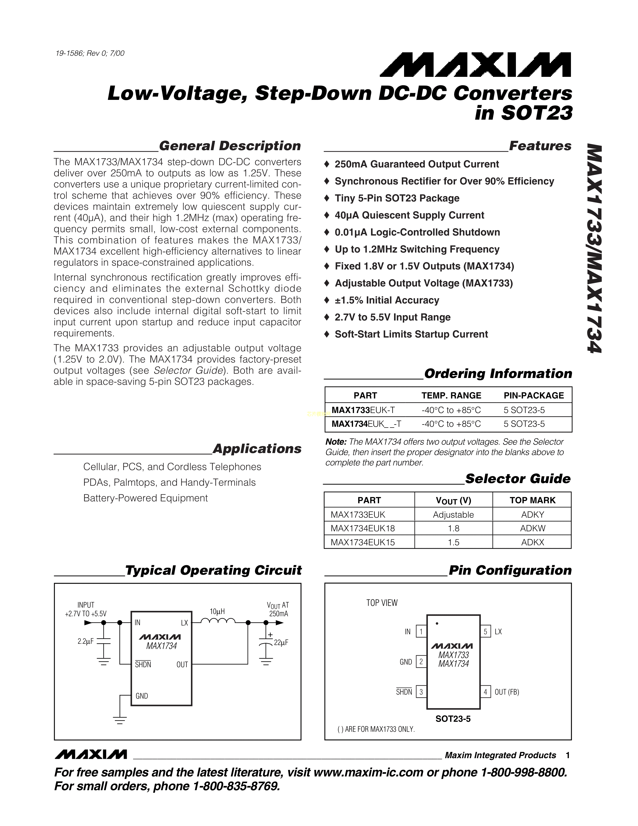 MAX1734EUK18+T数据手册SOT-23-5封装MAXIM(美信)PDF规格书,中英文下载