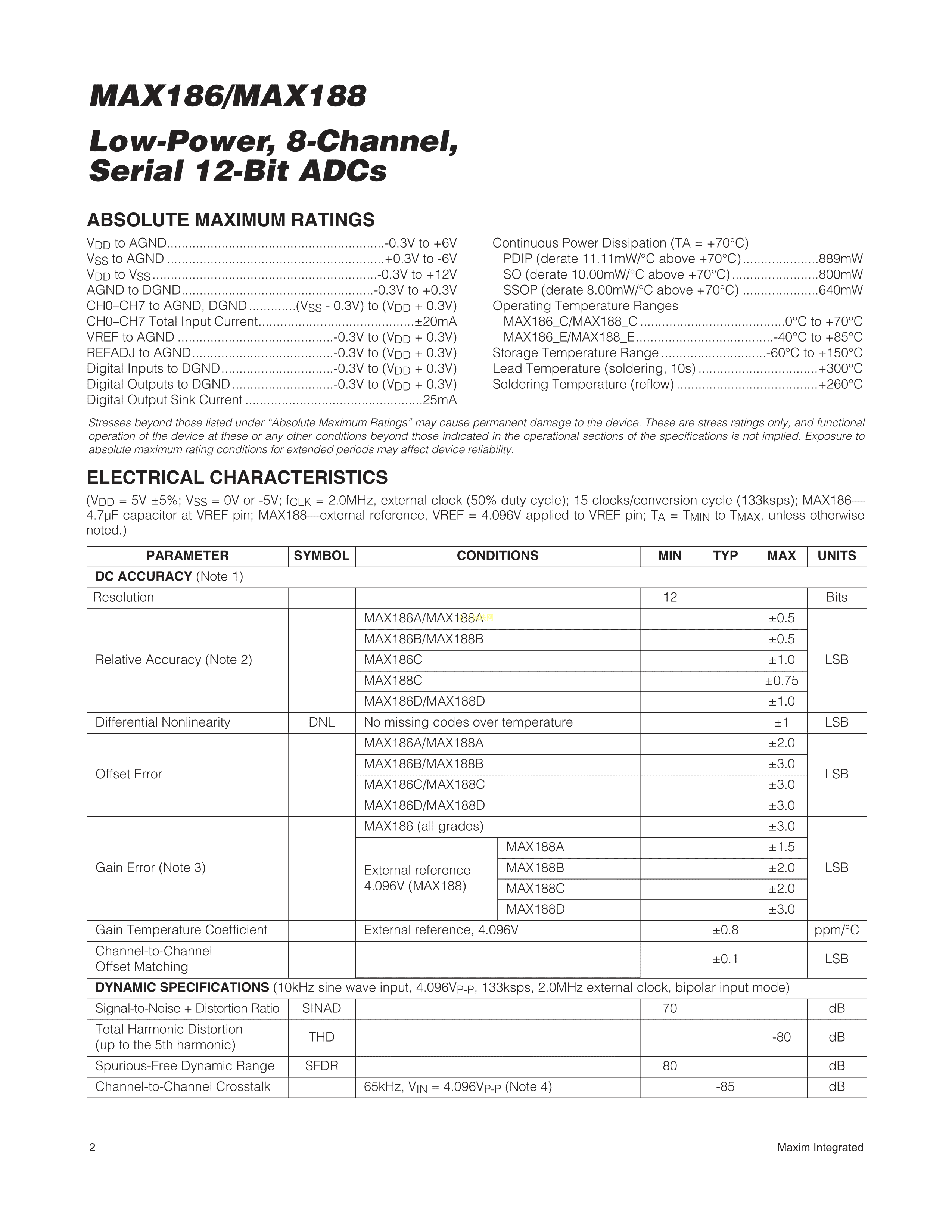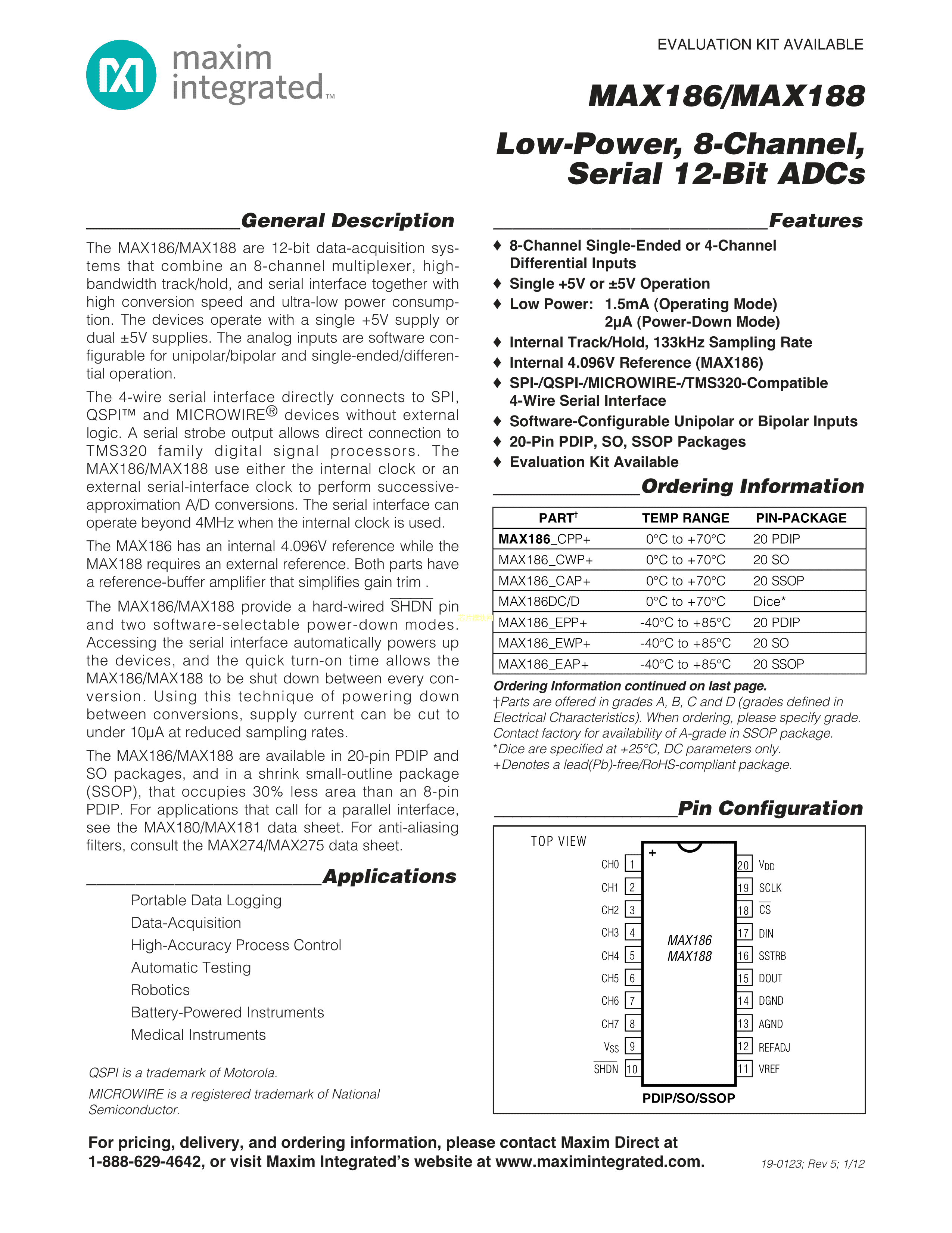 MAX186DEWP+数据手册SOIC-20封装MAXIM(美信)PDF规格书,中英文下载