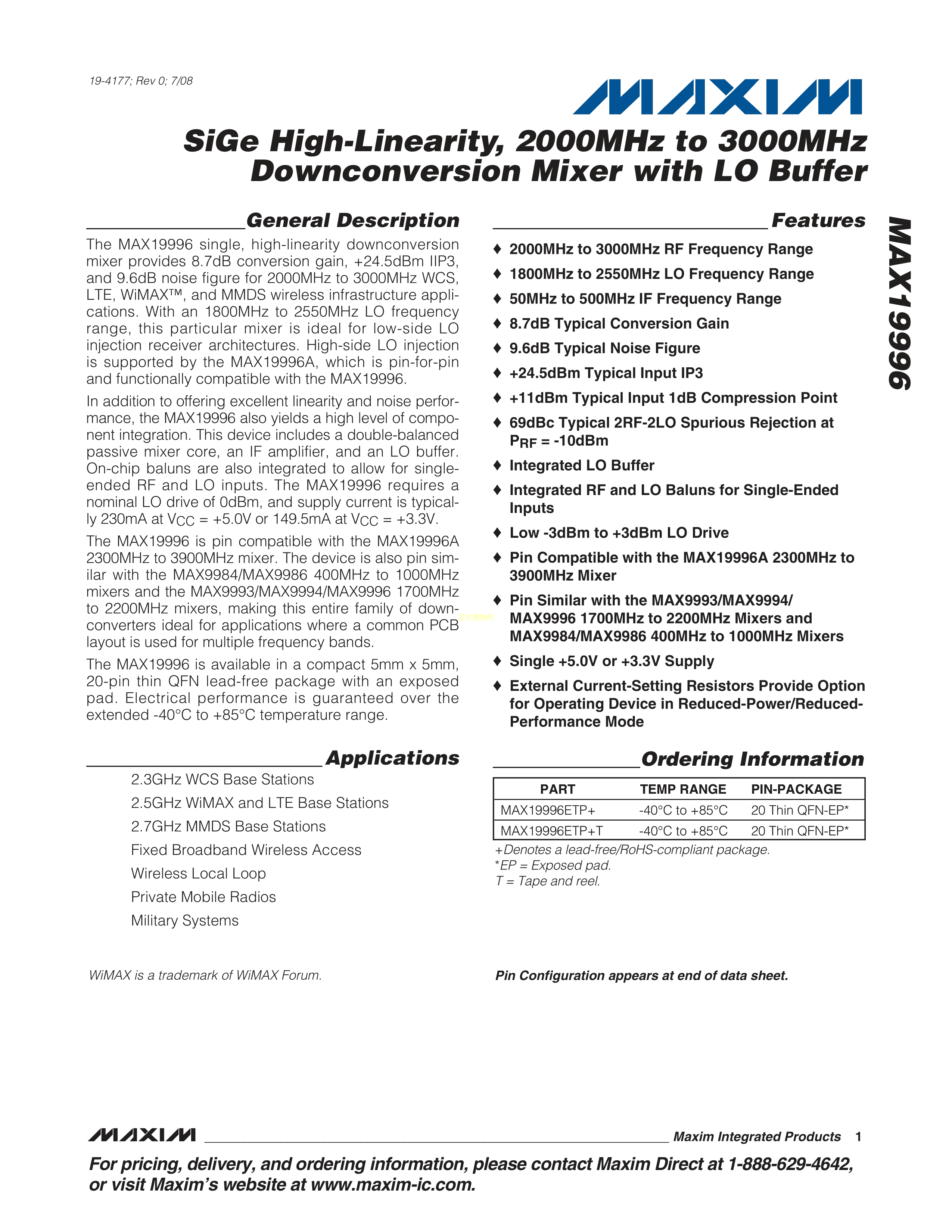 MAX19996ETP+数据手册TQFN-20(5x5)封装MAXIM(美信)PDF规格书,中英文下