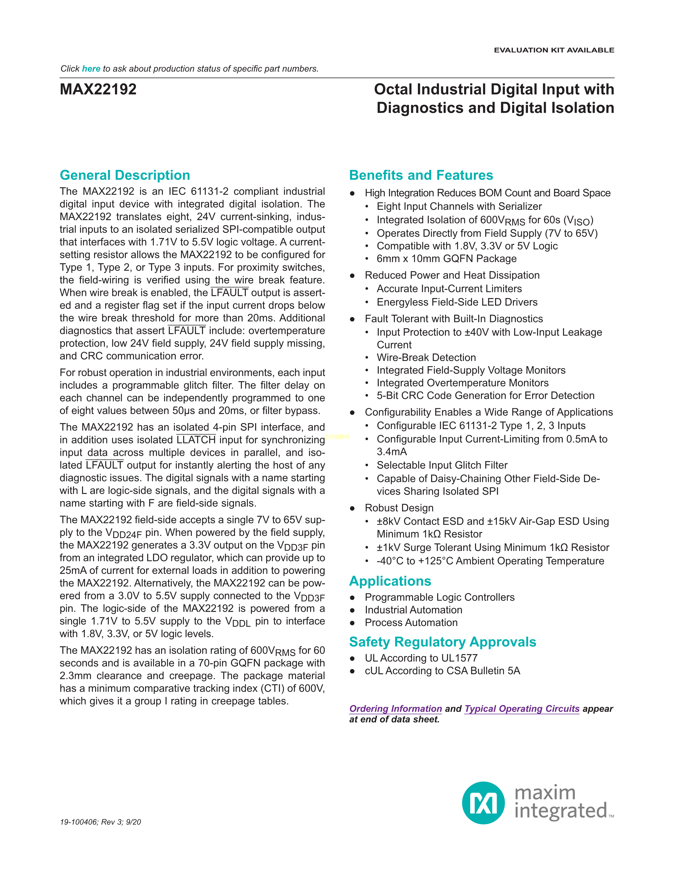 MAX22192ARC+T数据手册GQFN-70(6x10)封装MAXIM(美信)PDF规格书,中英