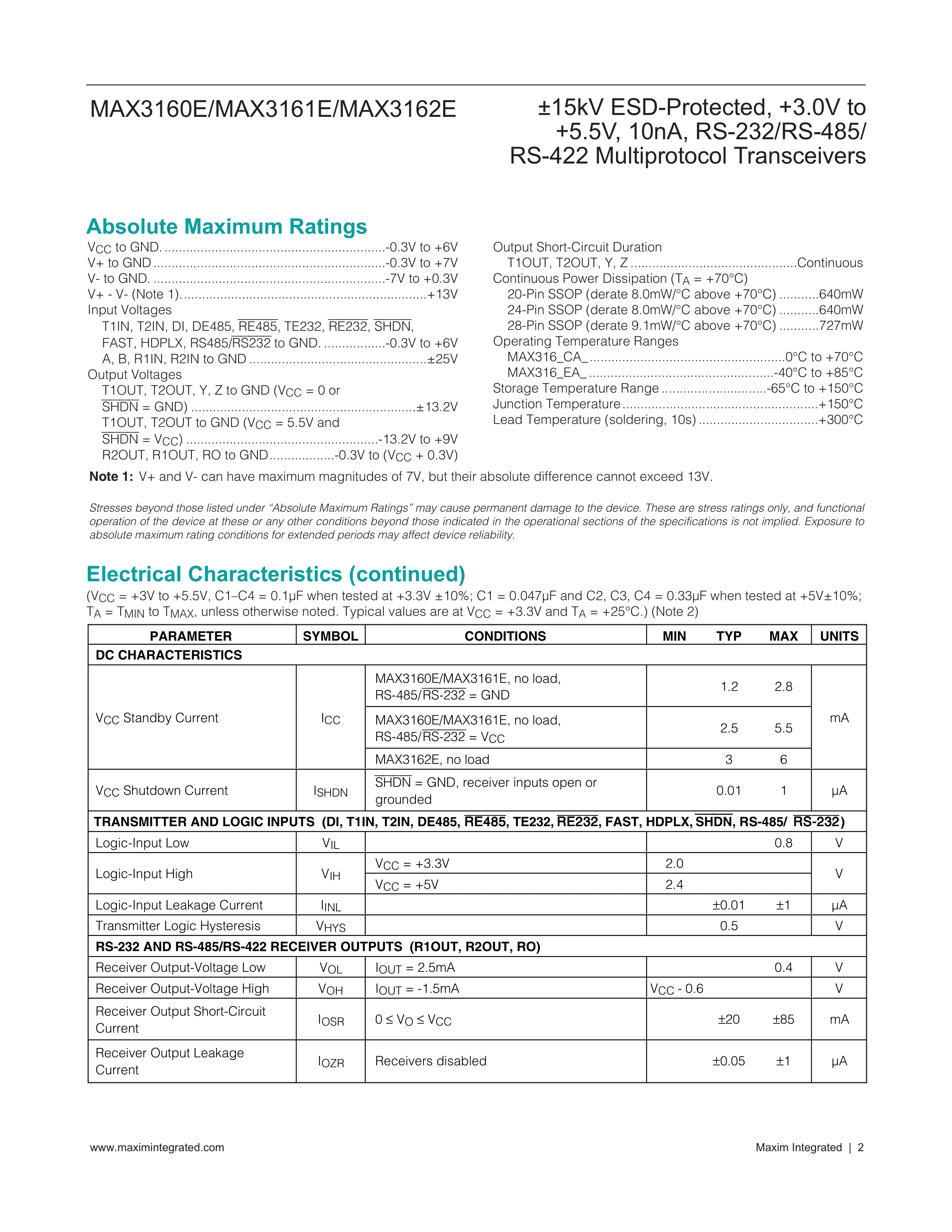 MAX3161EEAG+数据手册SSOP-24封装MAXIM(美信)PDF规格书,中英文下载