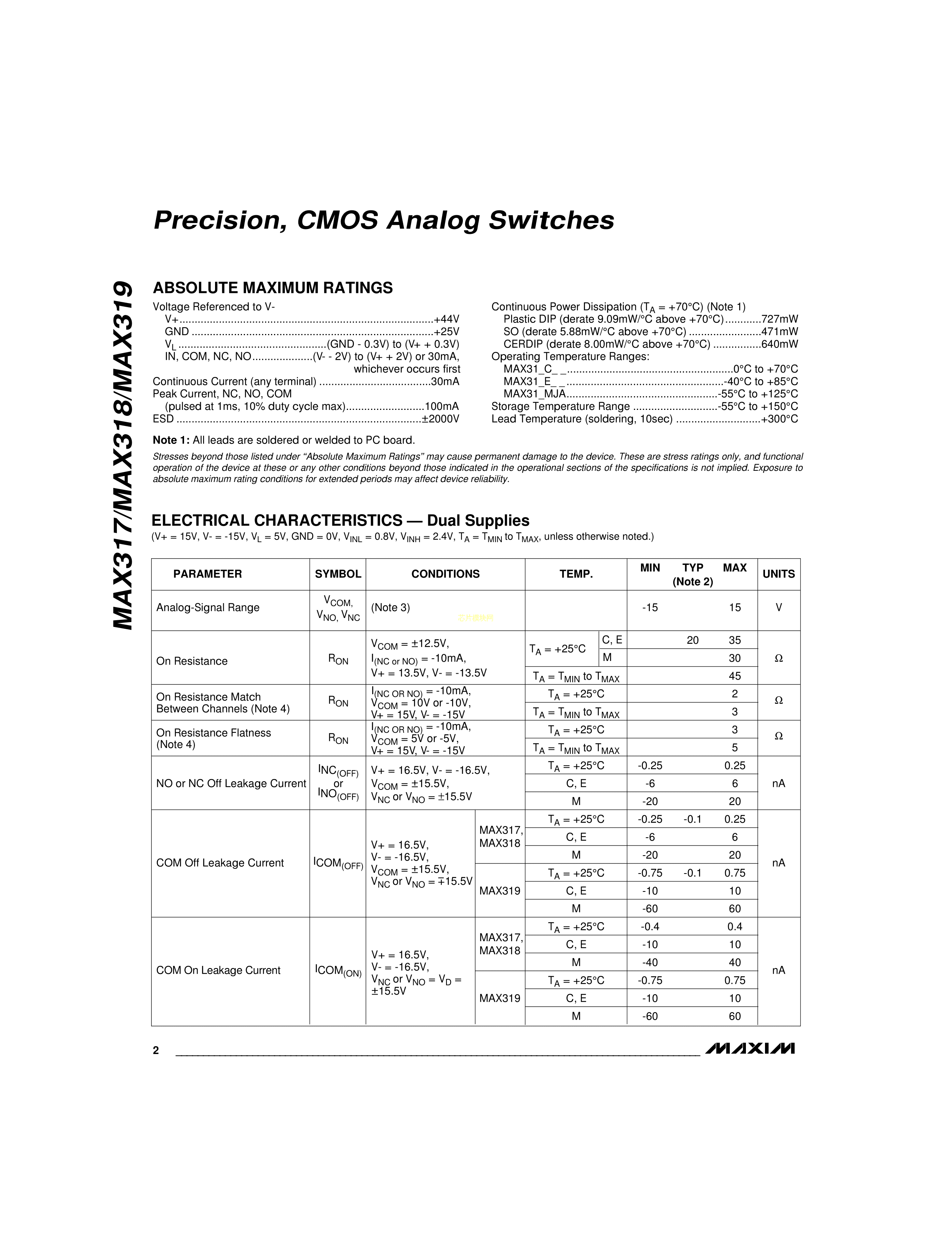 MAX318CSA+数据手册SOIC-8封装MAXIM(美信)PDF规格书,中英文下载