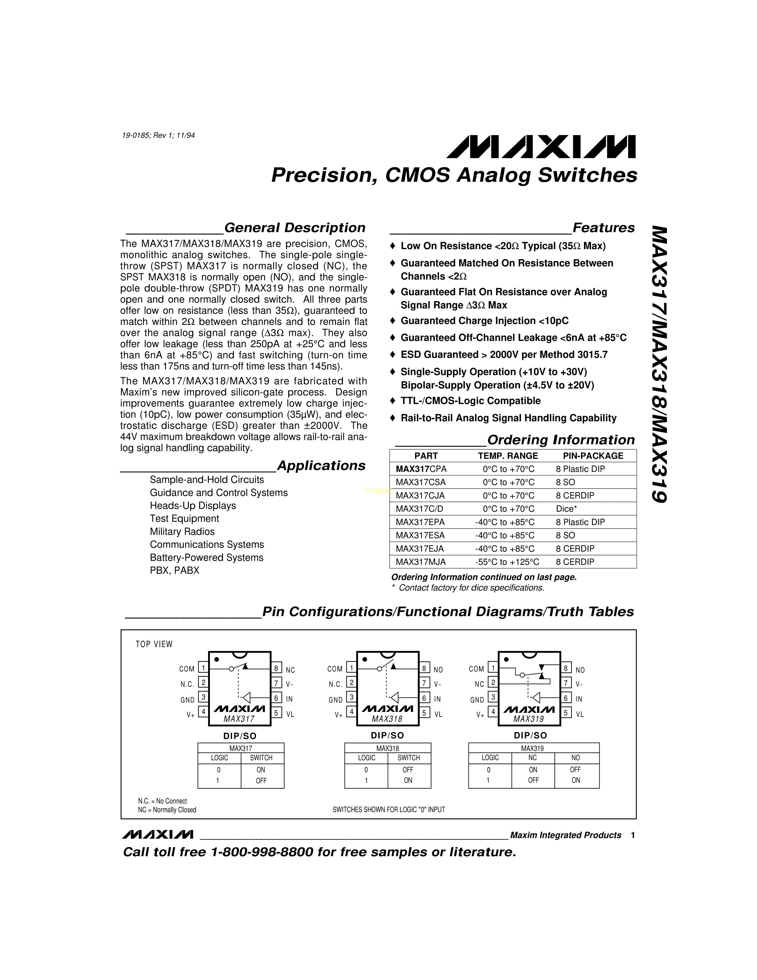 MAX318CSA+T数据手册SOIC-8封装MAXIM(美信)PDF规格书,中英文下载