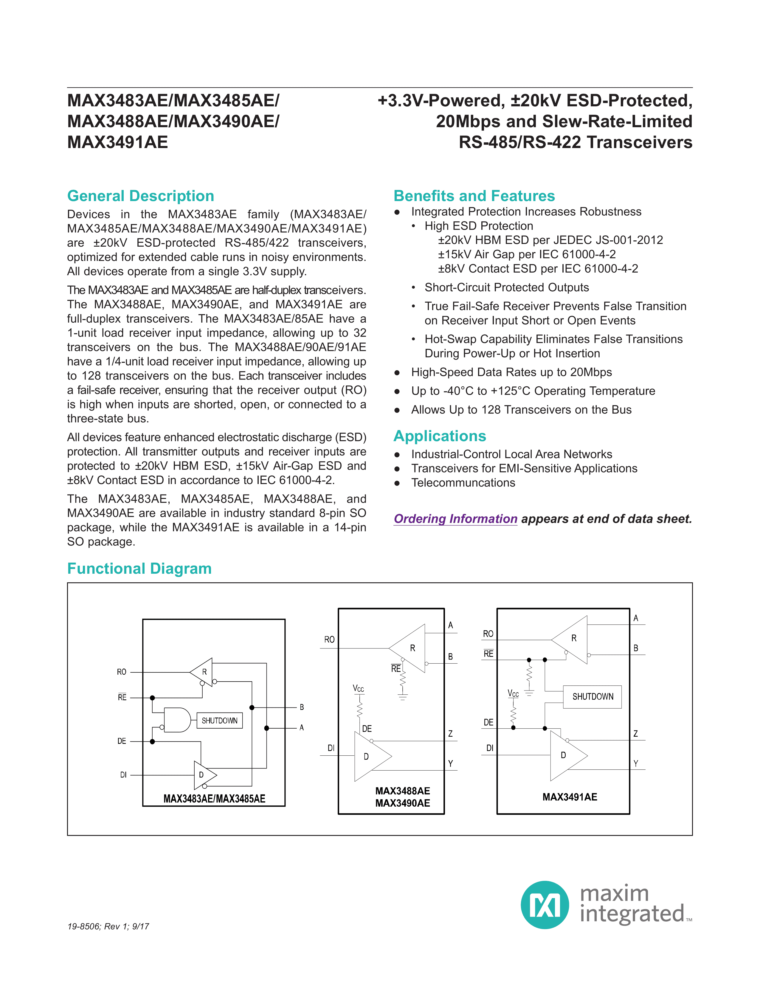 MAX3485AEASA+T数据手册SO-8封装MAXIM(美信)PDF规格书,中英文下载
