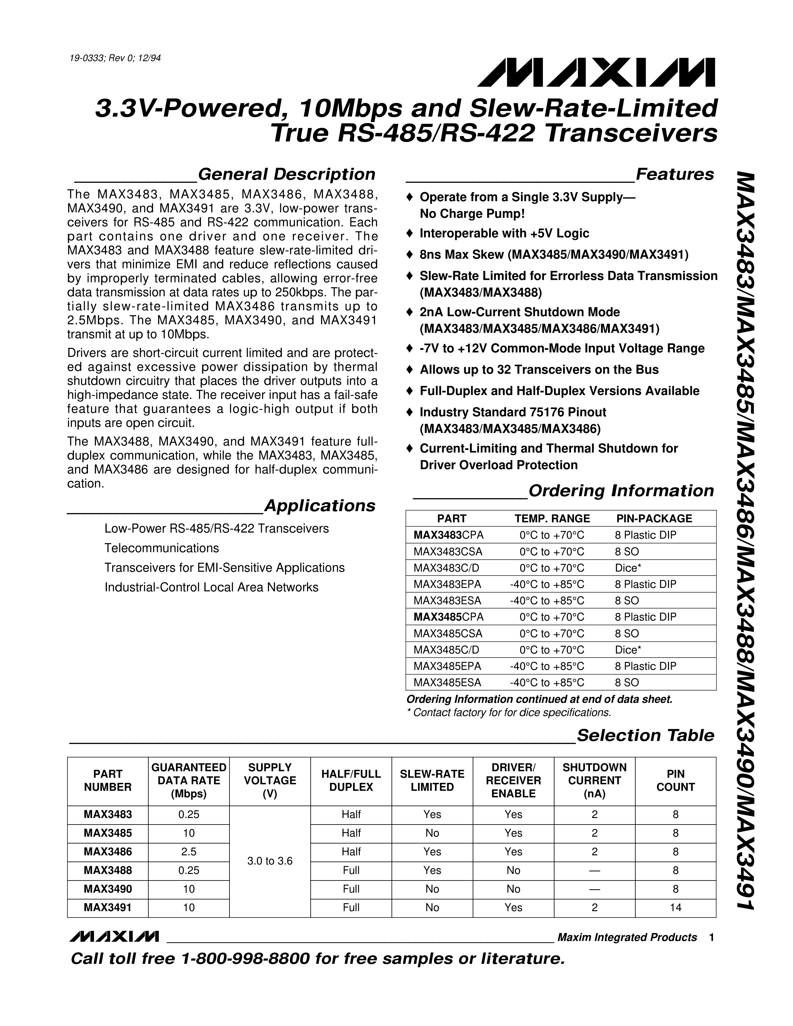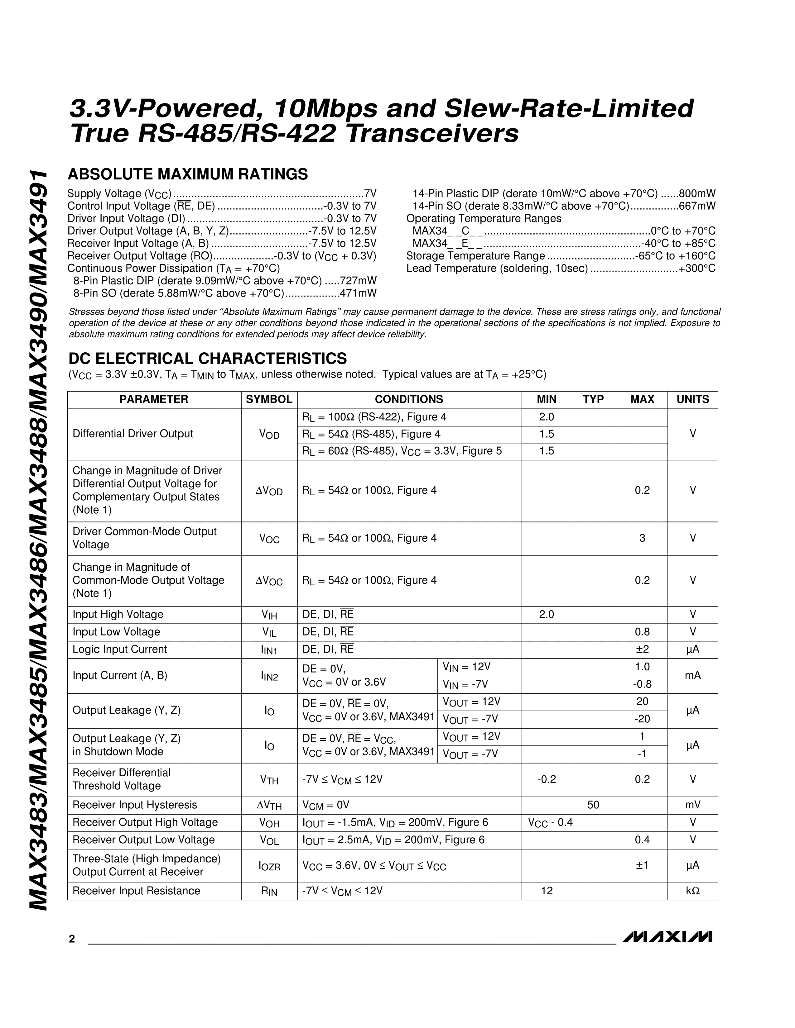 MAX3485CPA数据手册DIP-8封装MAXIM(美信)PDF规格书,中英文下载