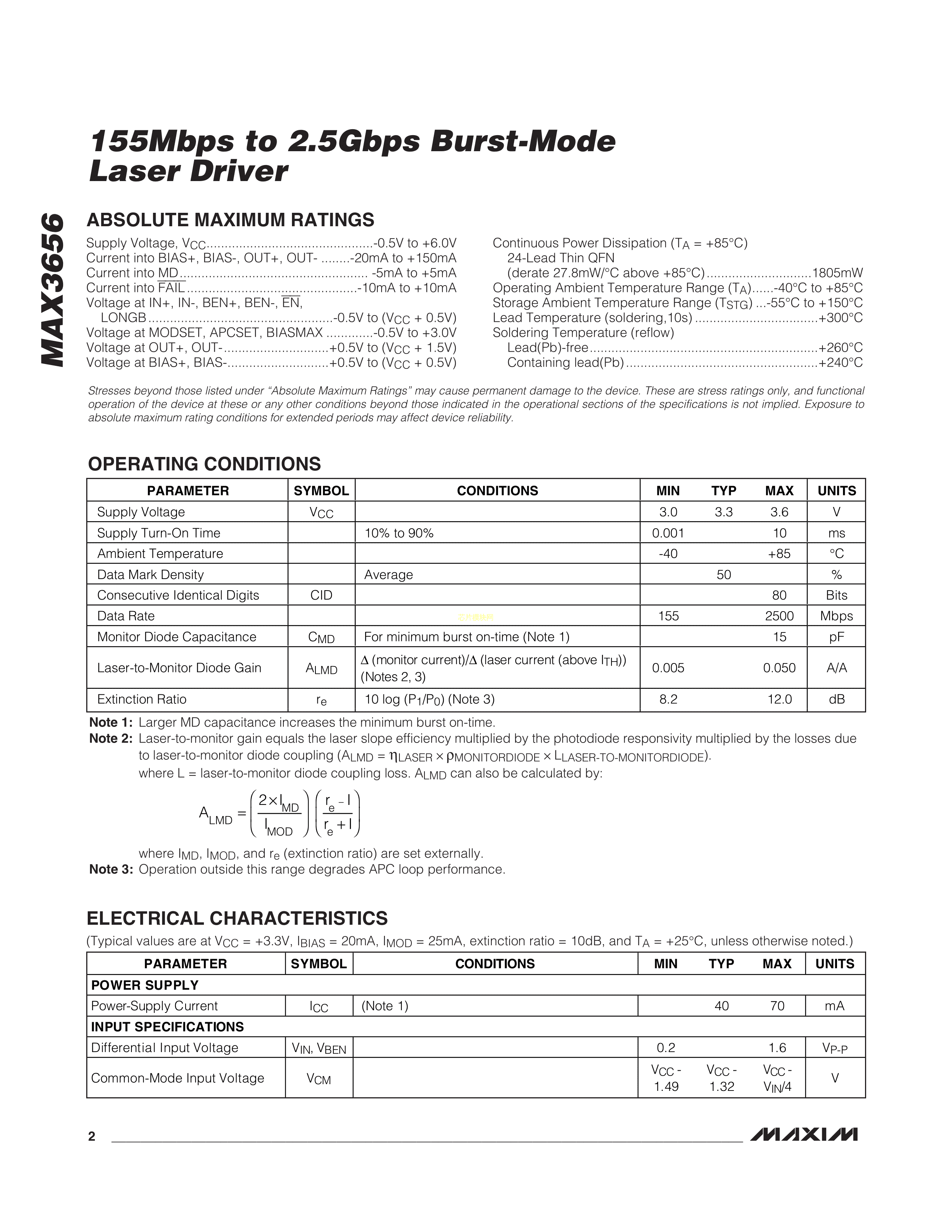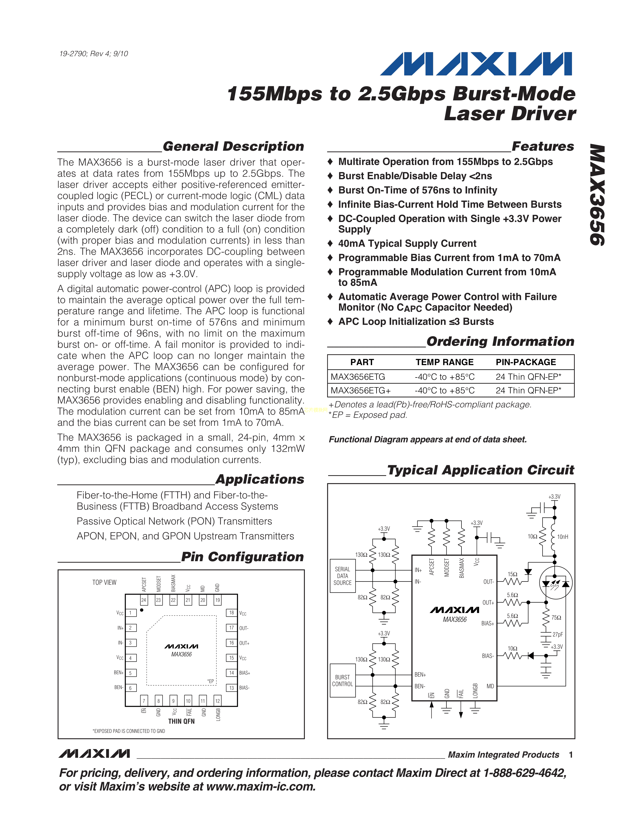 MAX3656ETG+T数据手册TQFN-24(4x4)封装MAXIM(美信)PDF规格书,中英文下