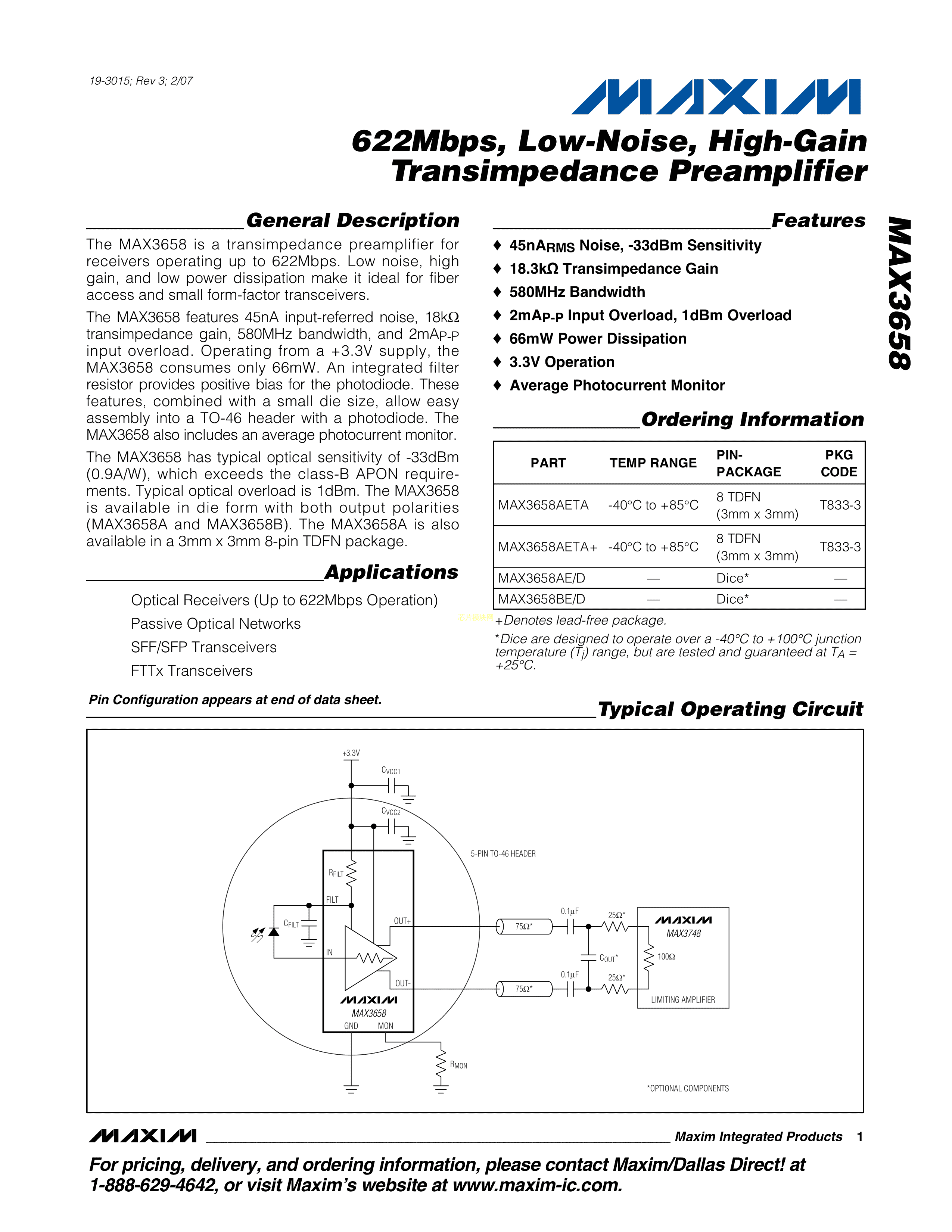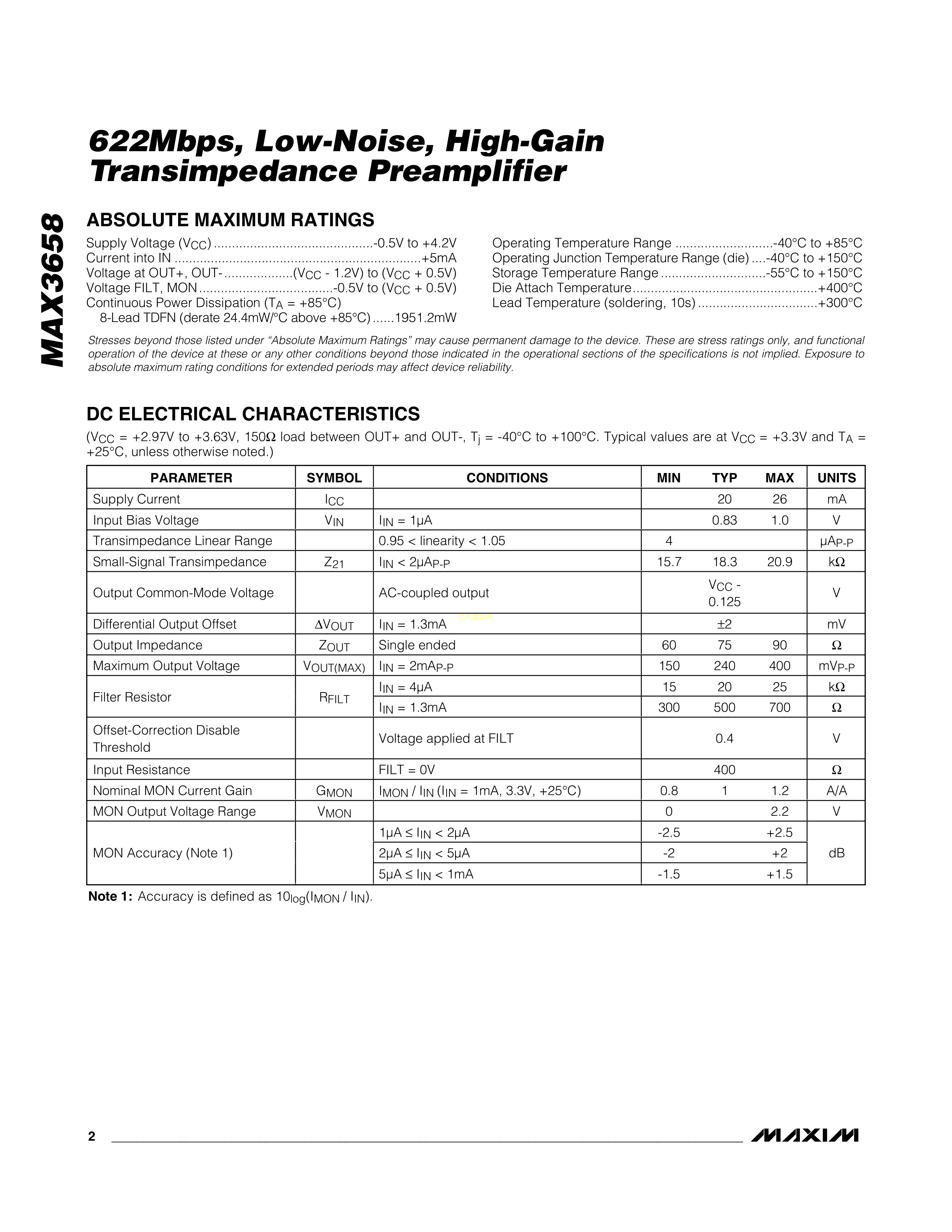 MAX3658AETA+数据手册TDFN-8封装MAXIM(美信)PDF规格书,中英文下载