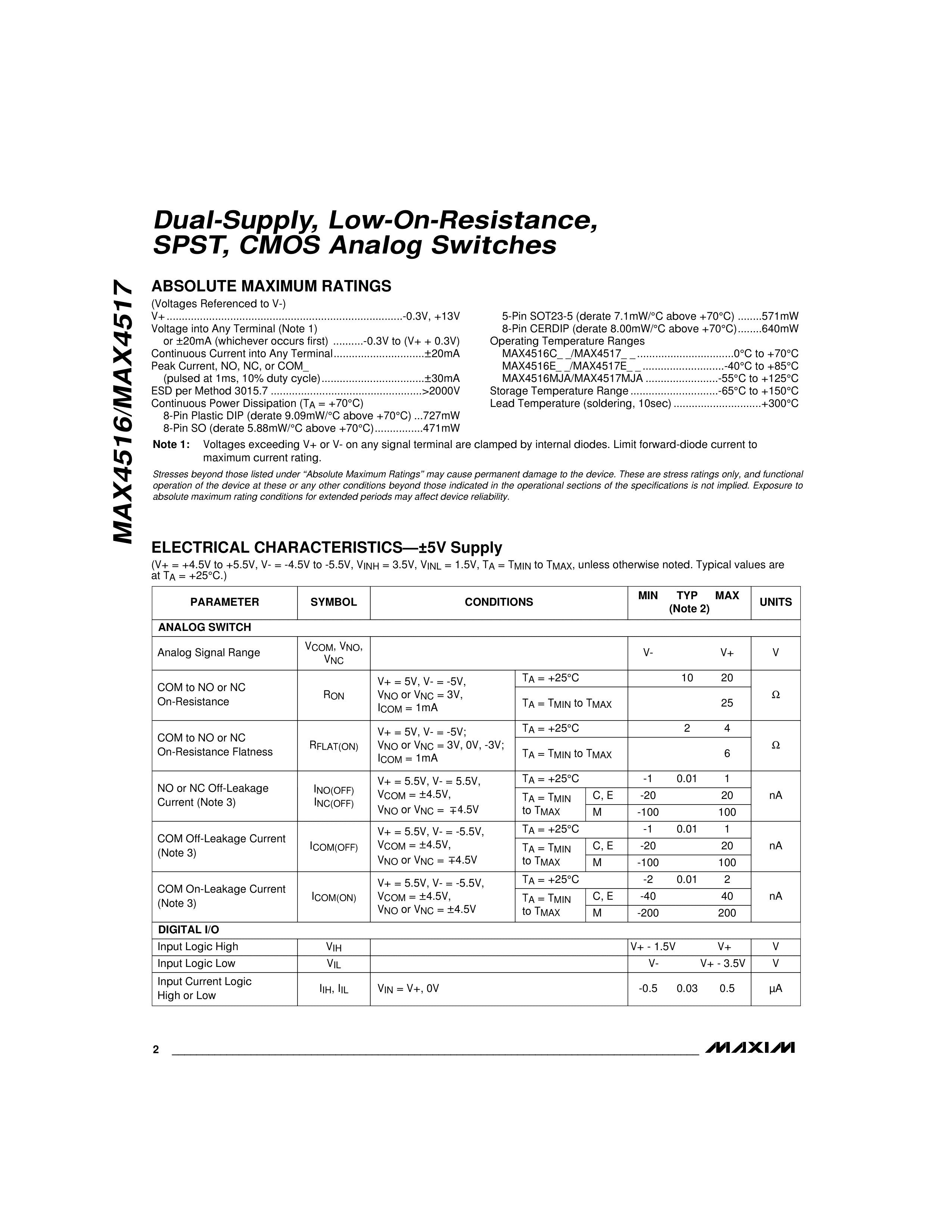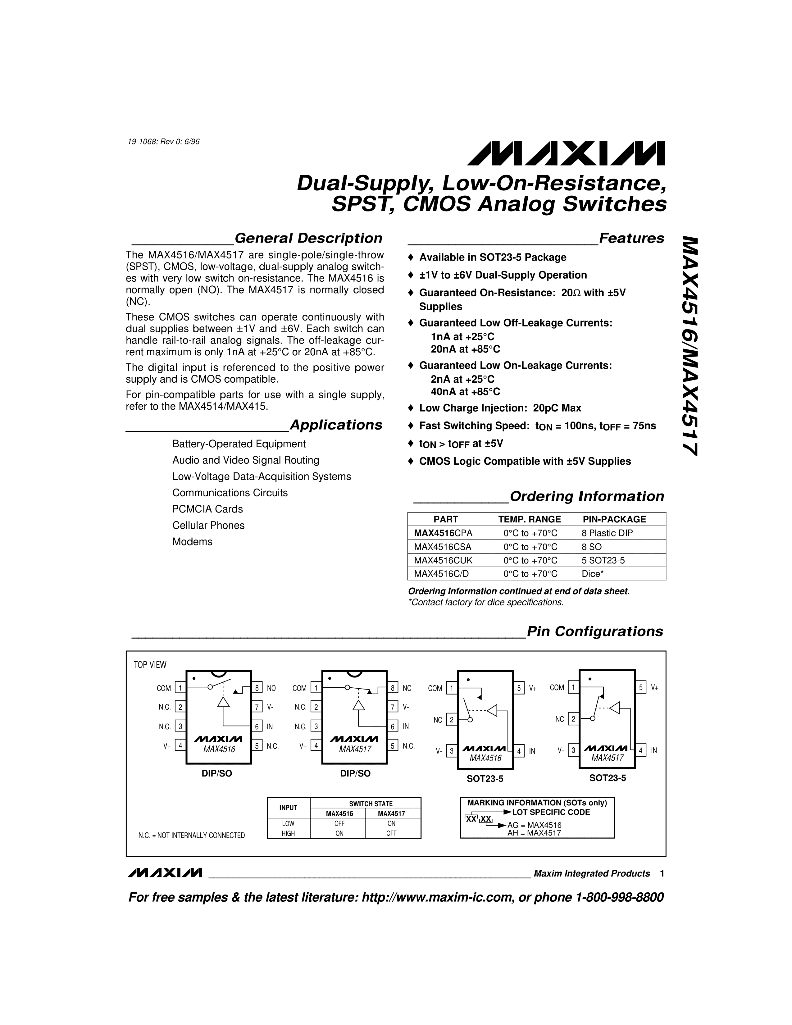 MAX4516EUK+T数据手册SOT-23-5封装MAXIM(美信)PDF规格书,中英文下载