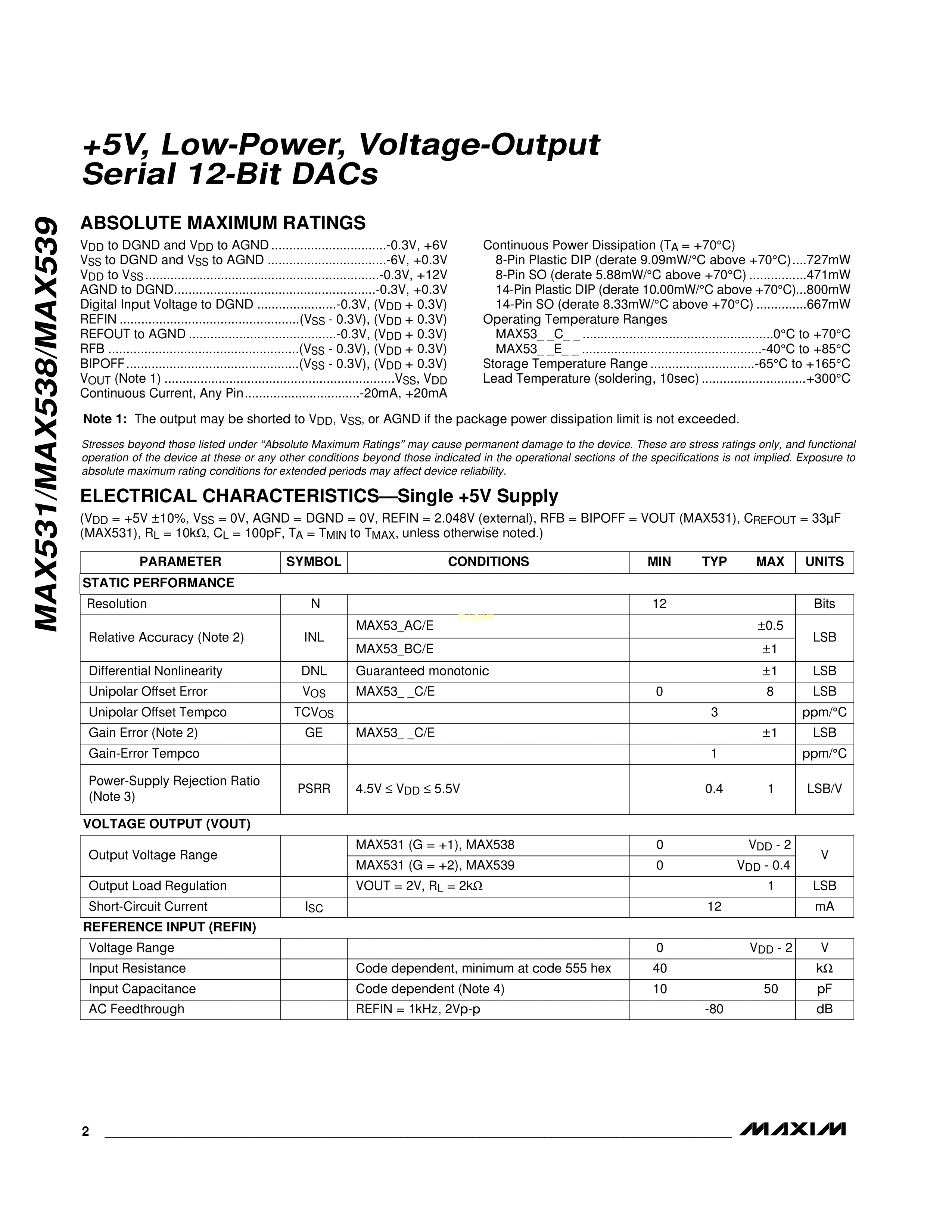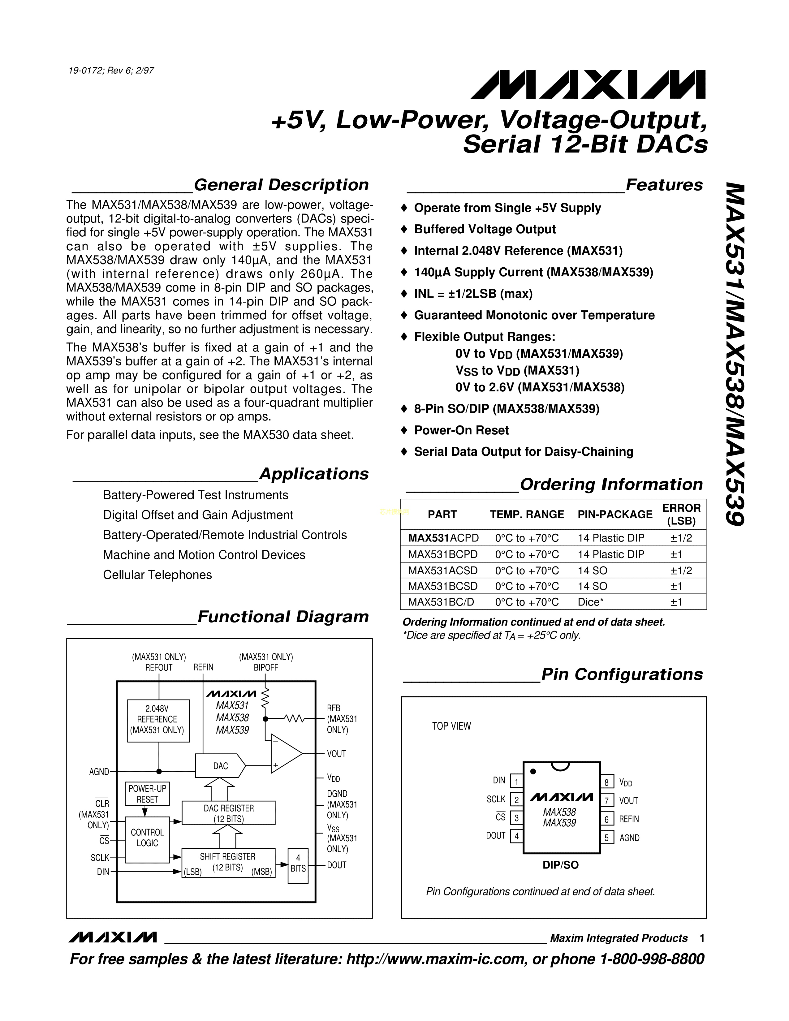 MAX531BCPD+数据手册DIP-14封装MAXIM(美信)PDF规格书,中英文下载