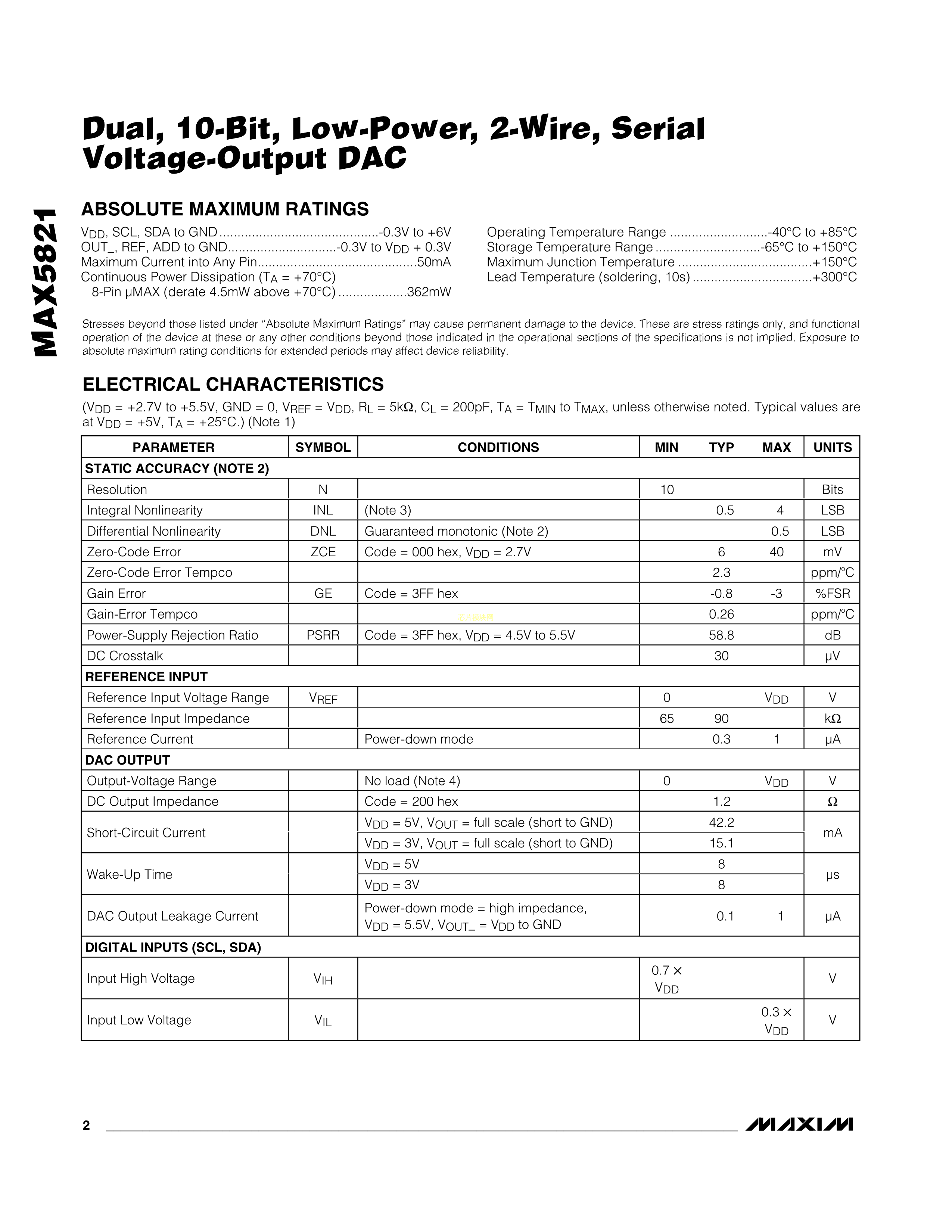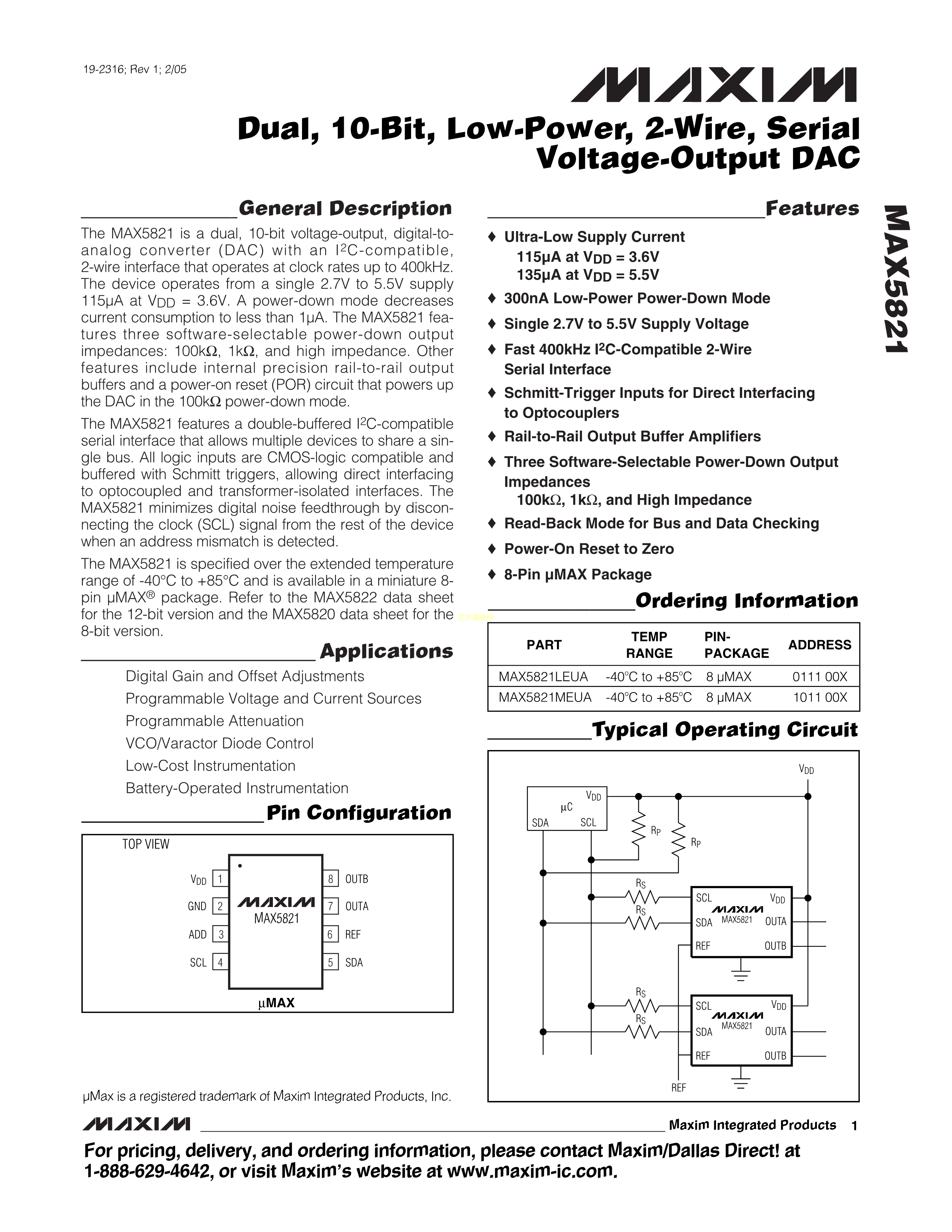 MAX5821LEUA+T数据手册uMAX-8封装MAXIM(美信)PDF规格书,中英文下载