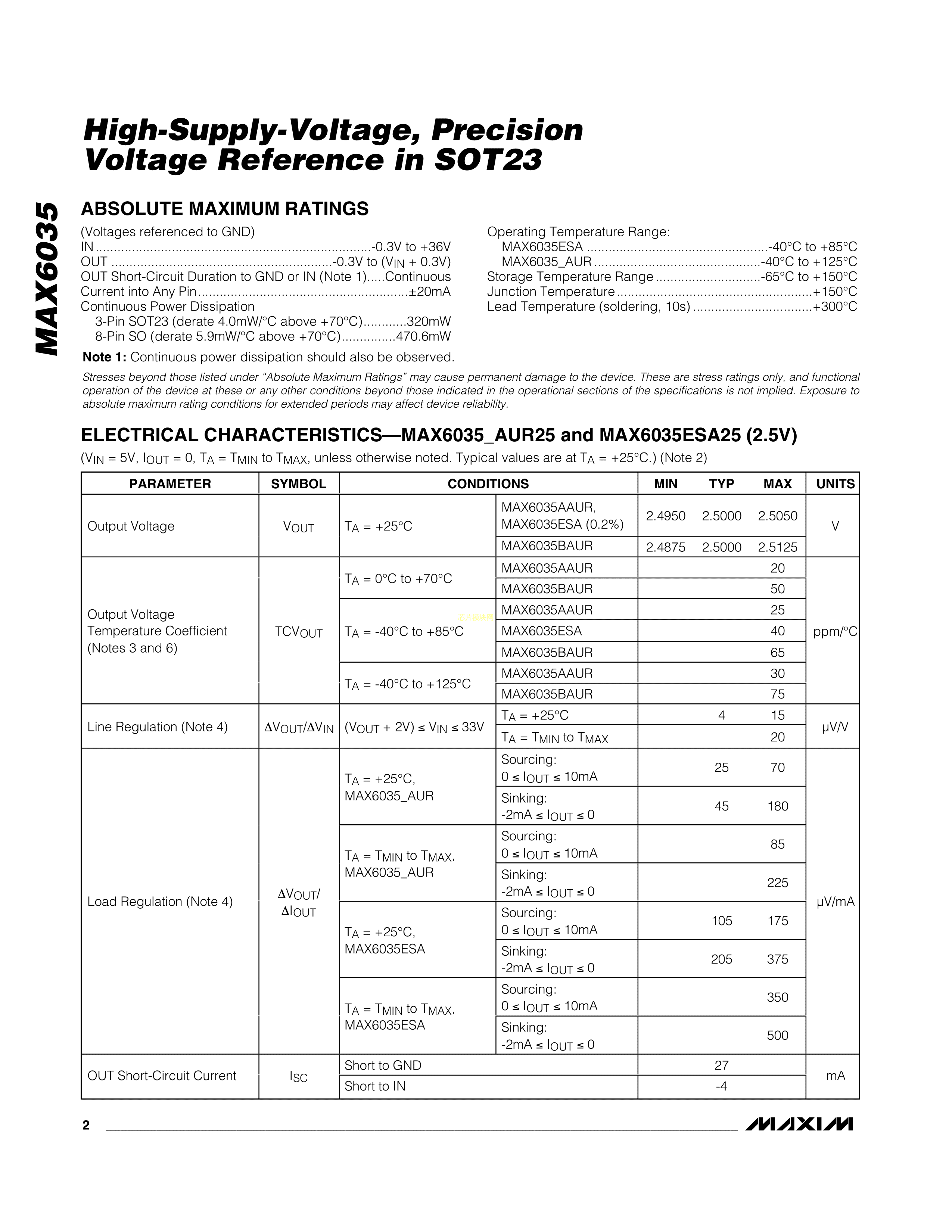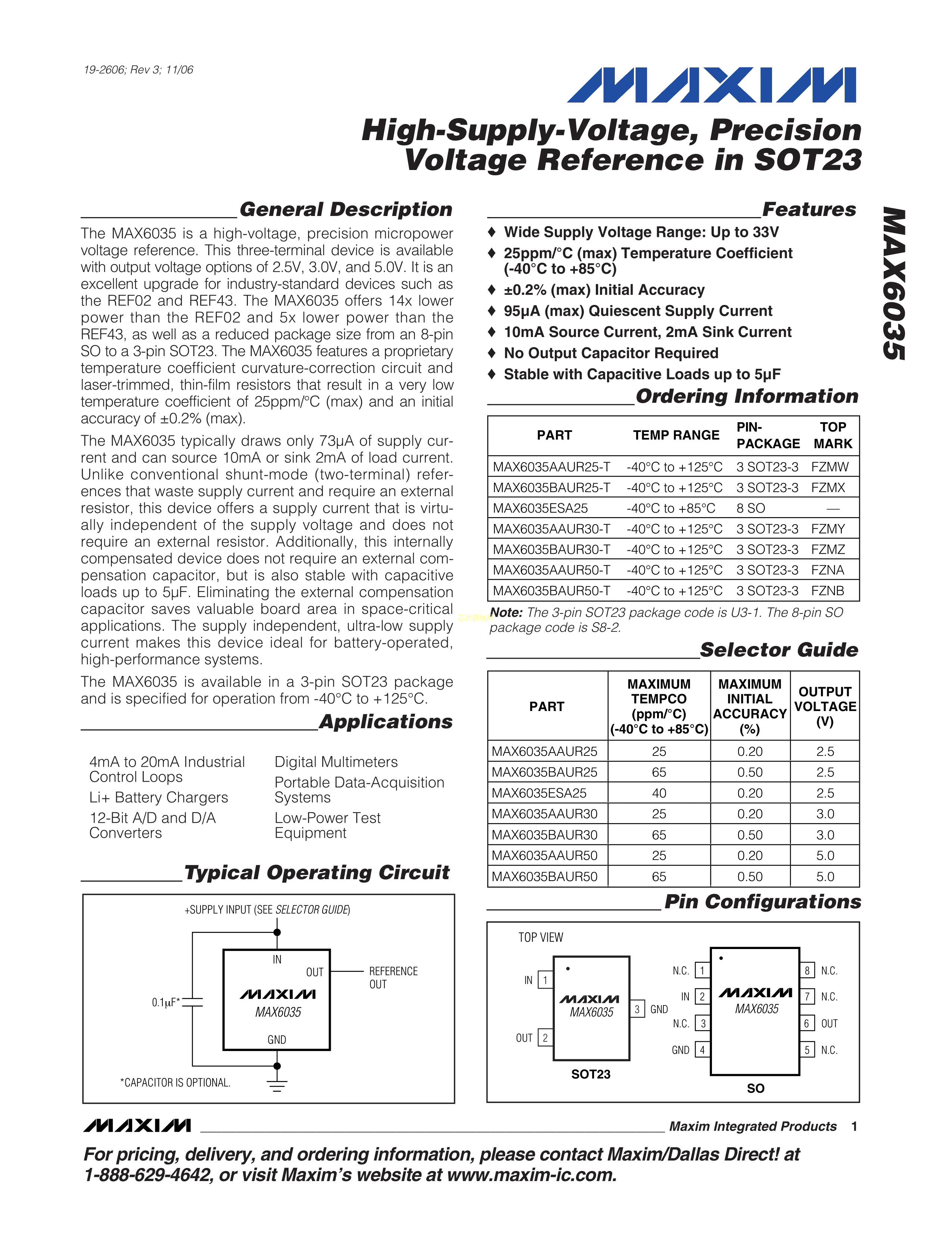MAX6035AAUR50+T数据手册SOT-23-3封装MAXIM(美信)PDF规格书,中英文下载
