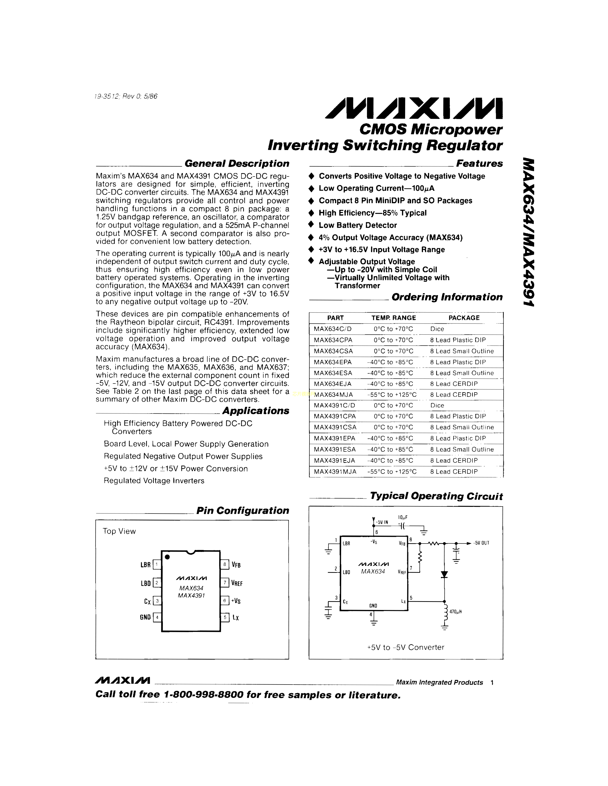 MAX634CSA+数据手册SOIC-8封装MAXIM(美信)PDF规格书,中英文下载