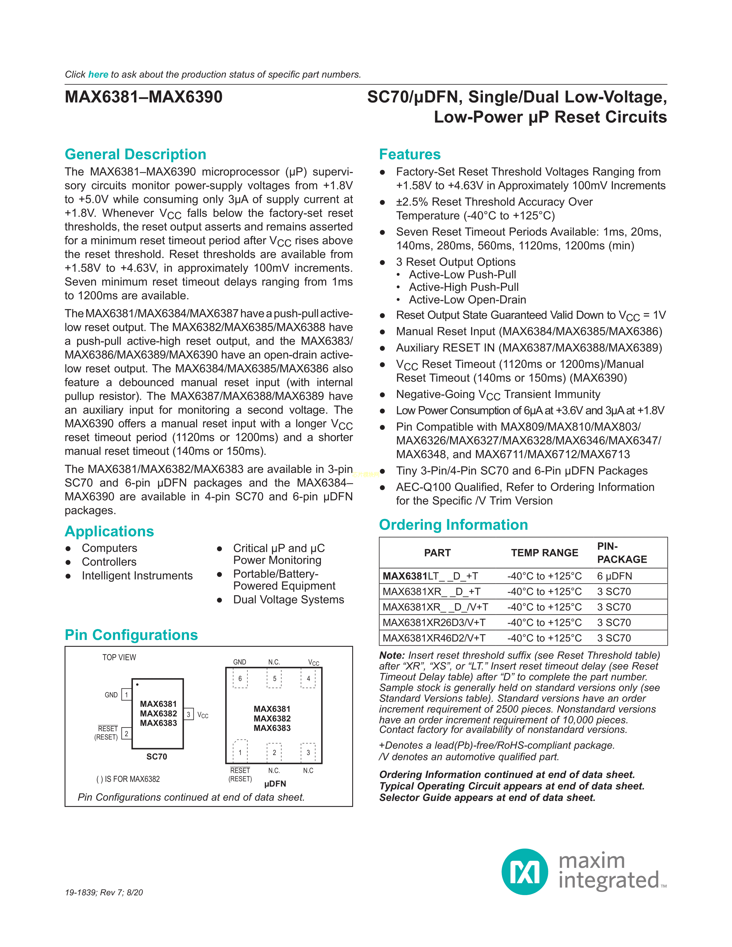 MAX6387XS29D3+T数据手册SC-70-4封装MAXIM(美信)PDF规格书,中英文下载