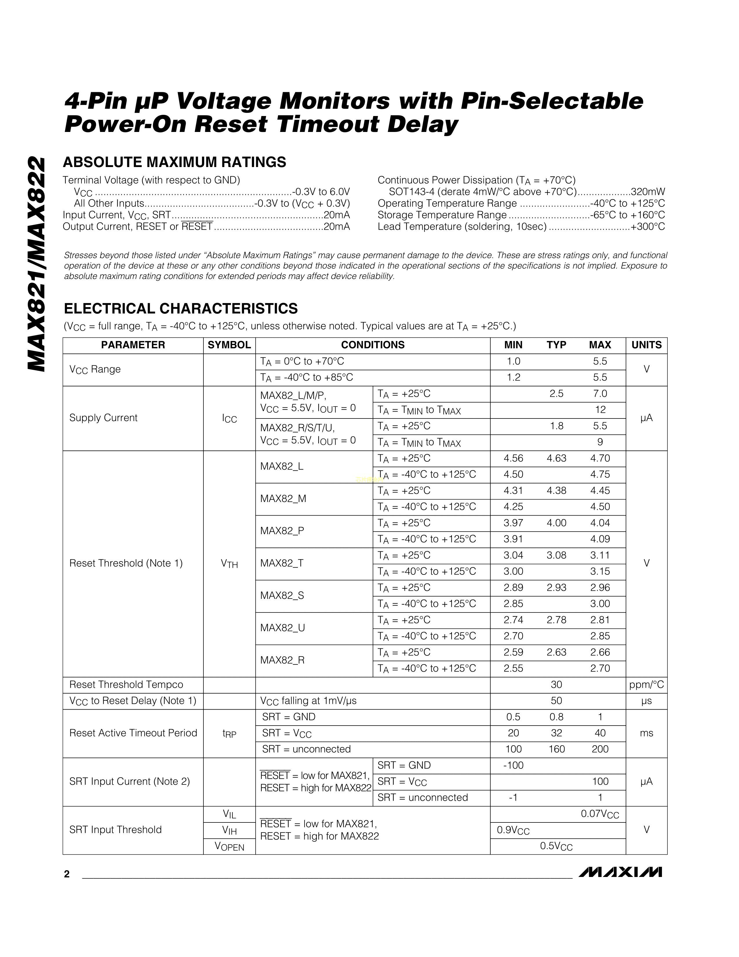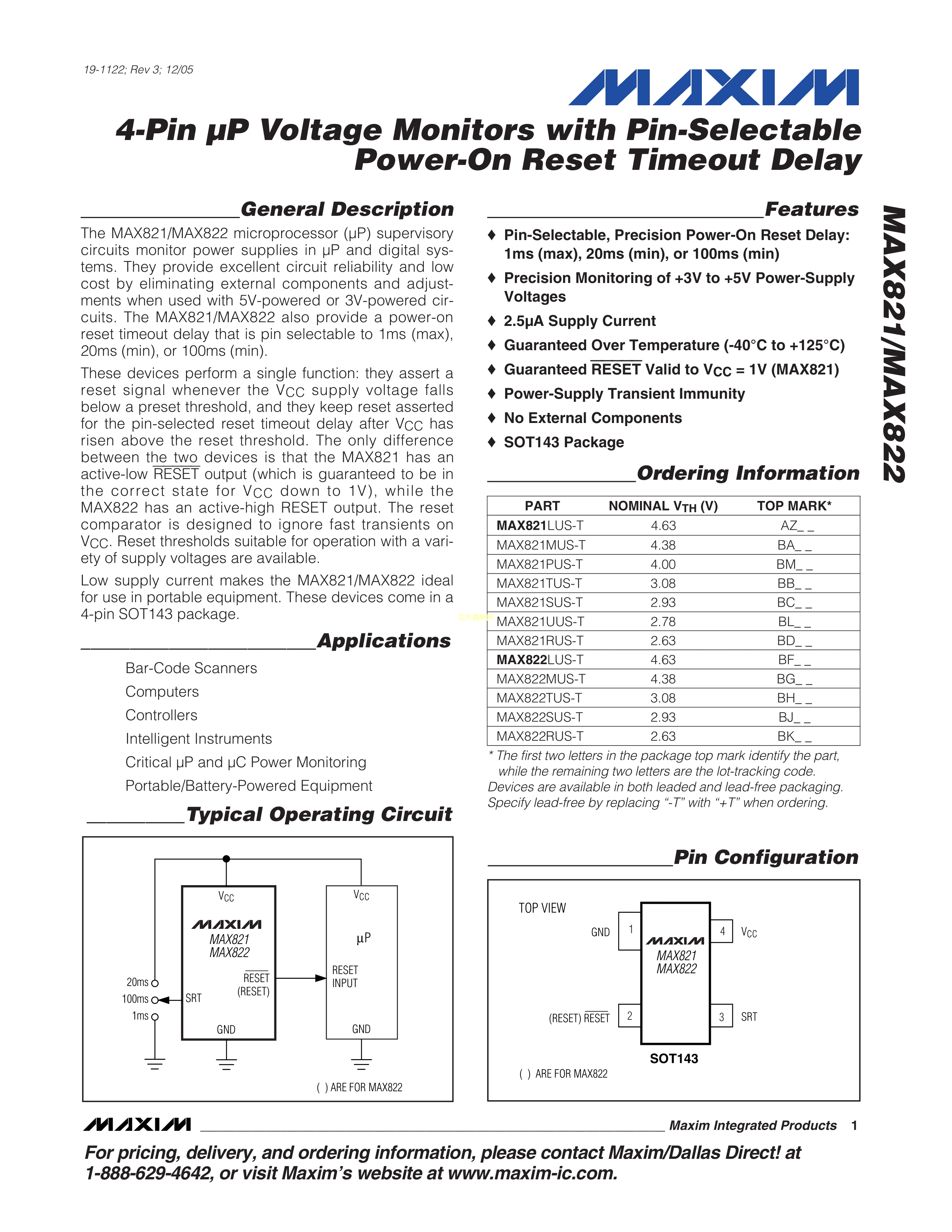 MAX821LUS+T数据手册SOT-143封装MAXIM(美信)PDF规格书,中英文下载