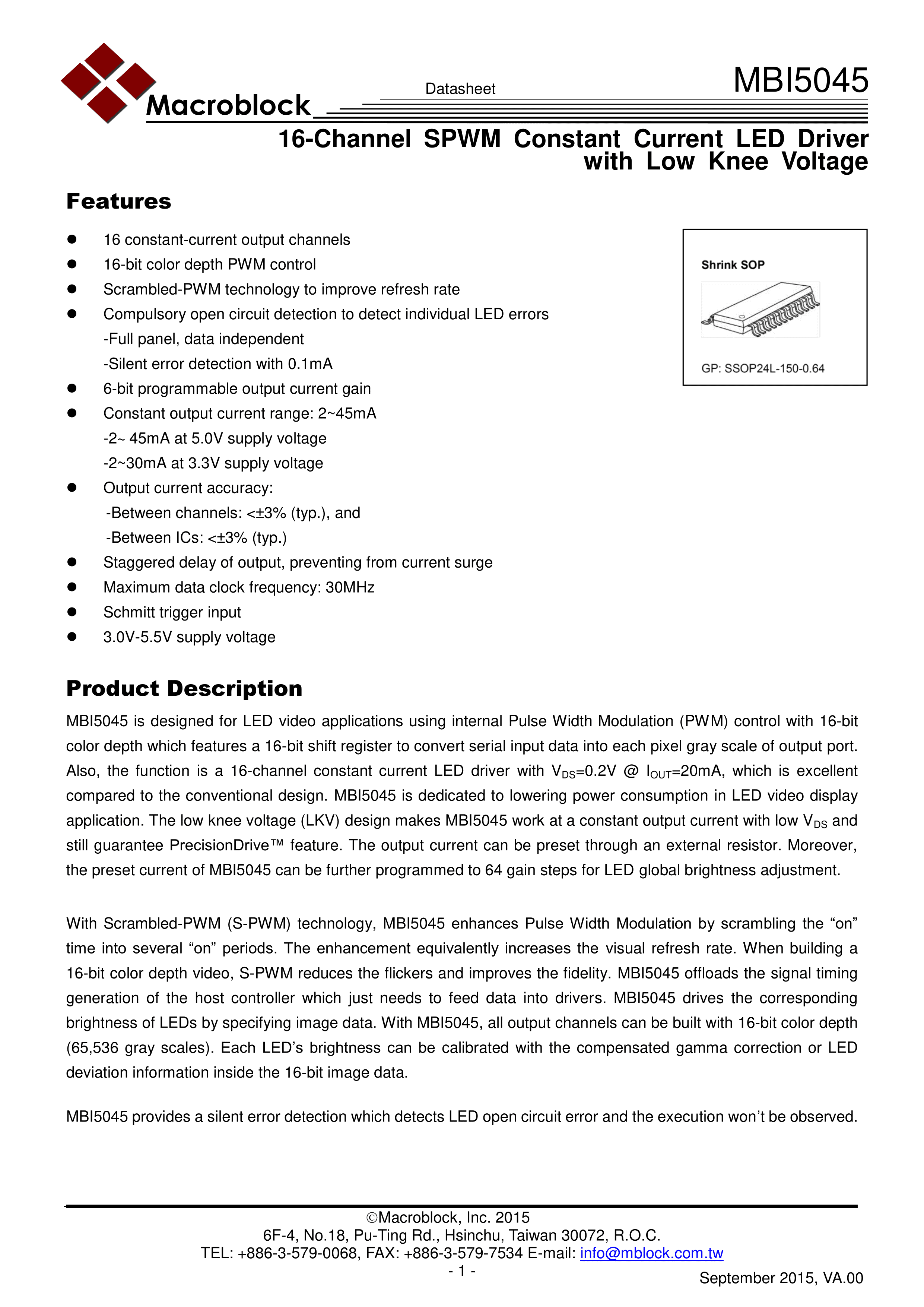 MBI5045GP-A数据手册SSOP-24L封装MBI(台湾聚积)PDF规格书,中英文下载