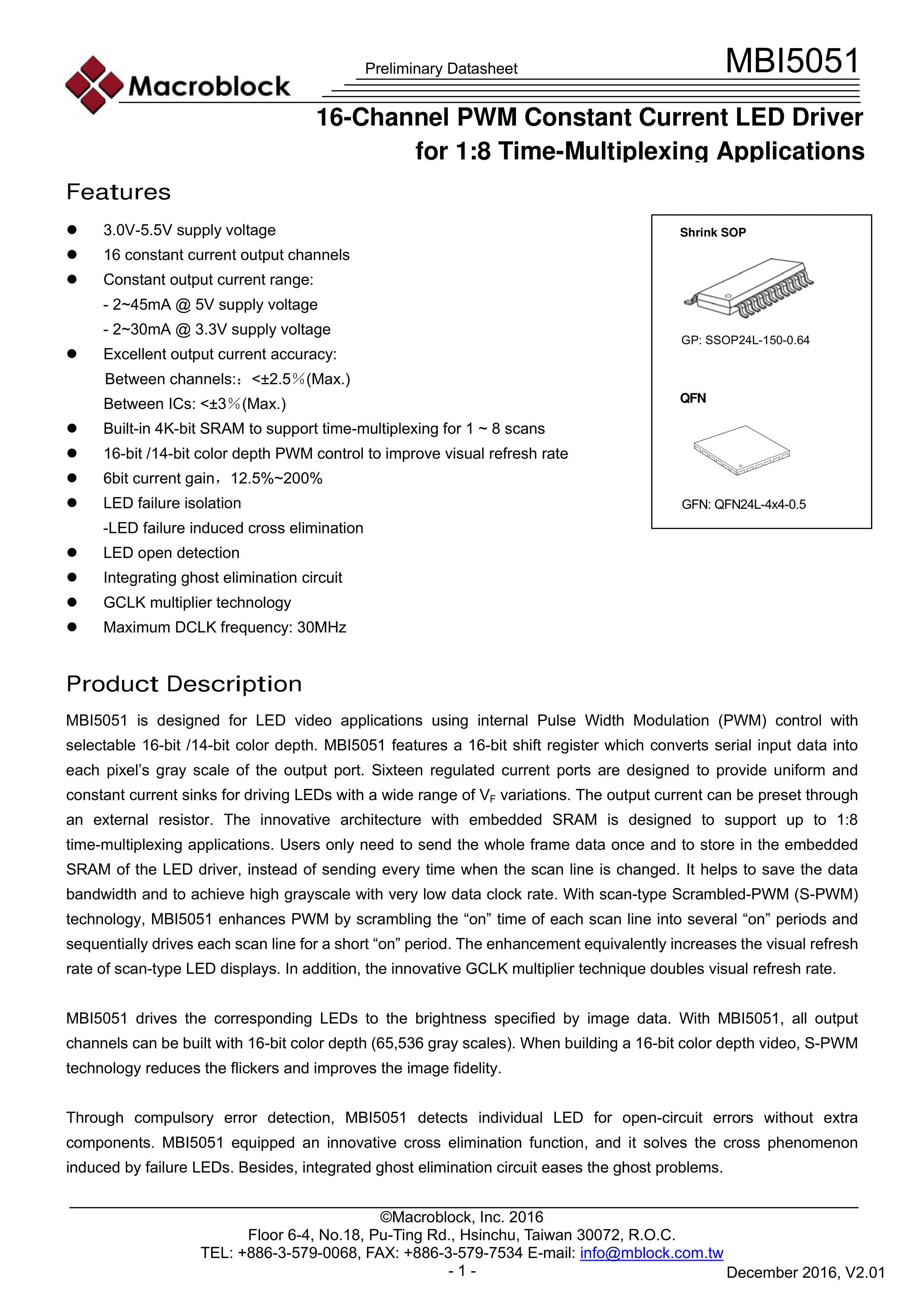 MBI5051GP-B数据手册SSOP-24L封装MBI(台湾聚积)PDF规格书,中英文下载