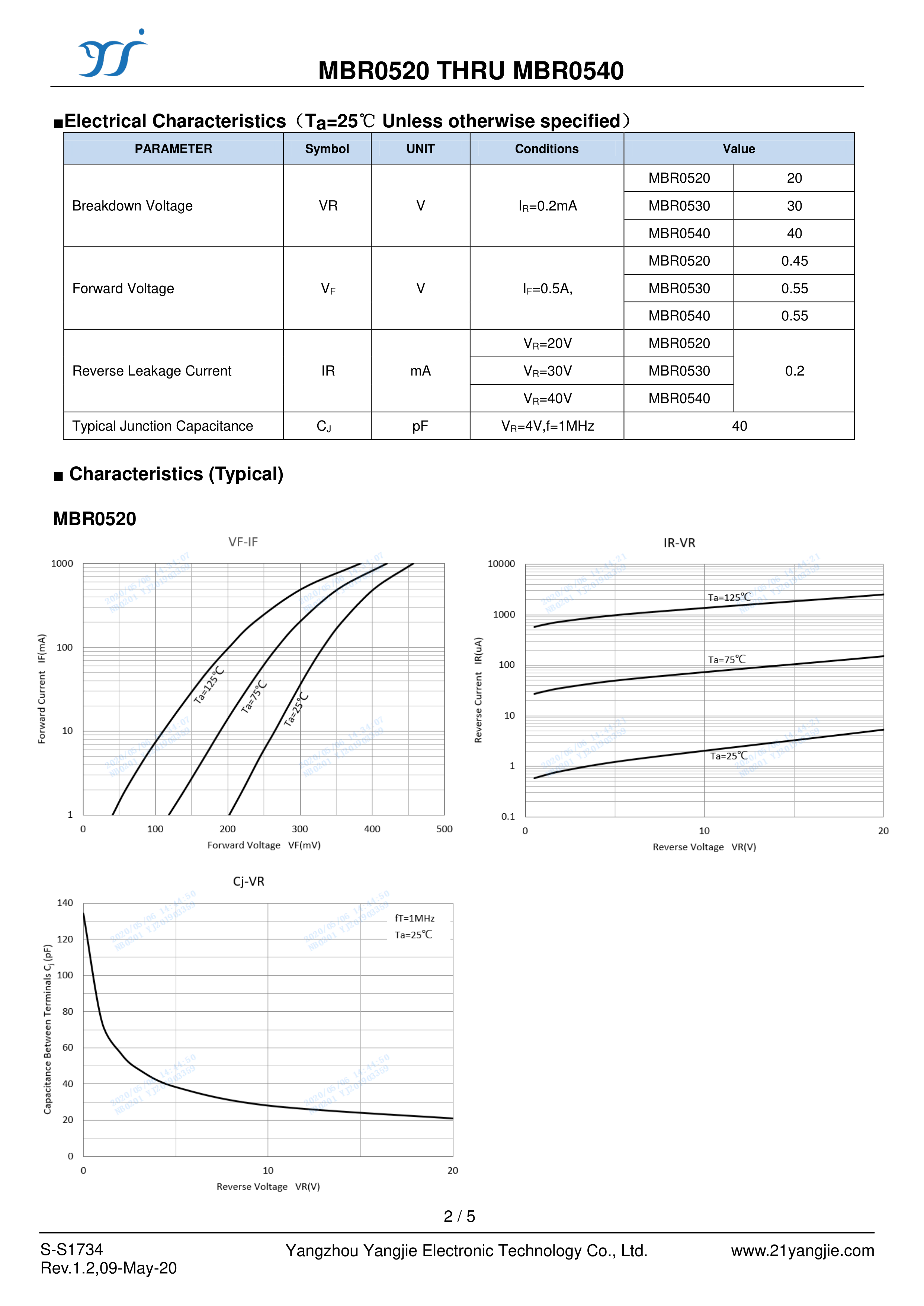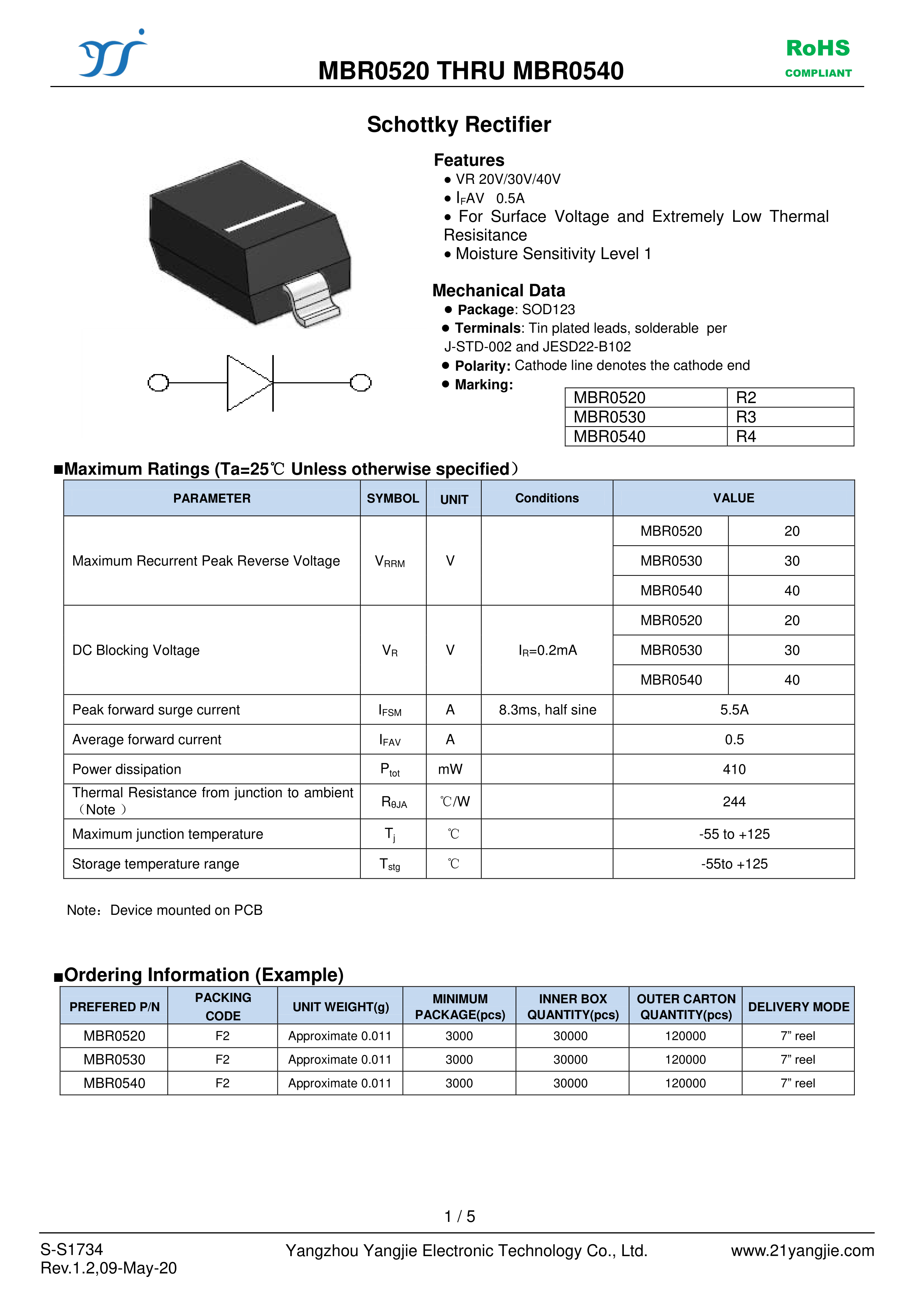 MBR0520数据手册SOD-123封装YANGJIE(扬杰)PDF规格书,中英文下载
