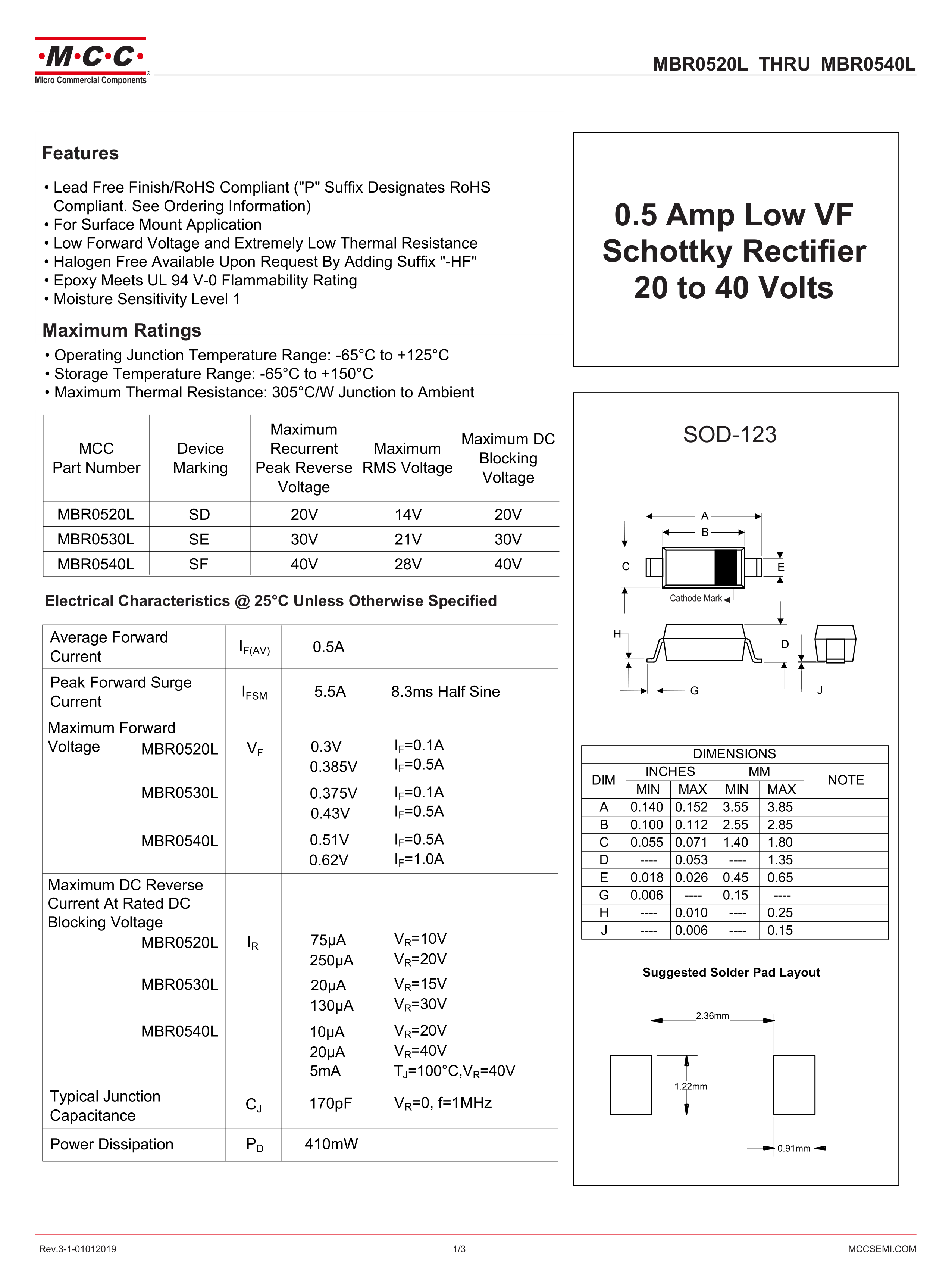 MBR0530L-TP数据手册SOD-123封装MCC(美微科)PDF规格书,中英文下载