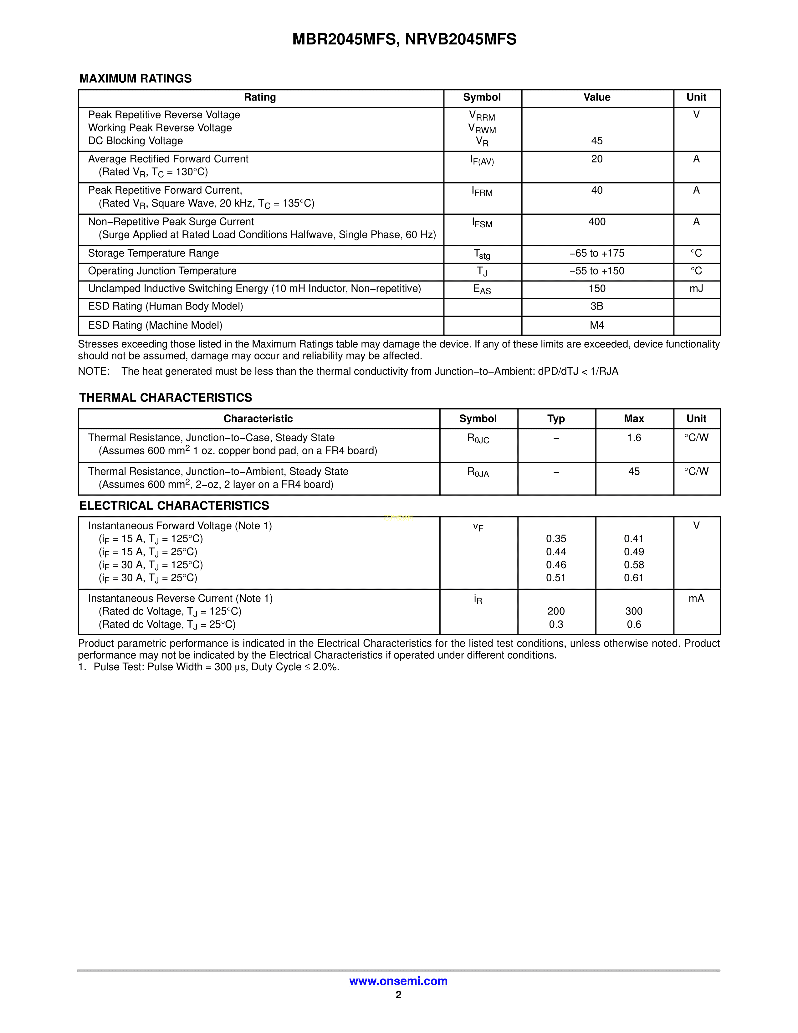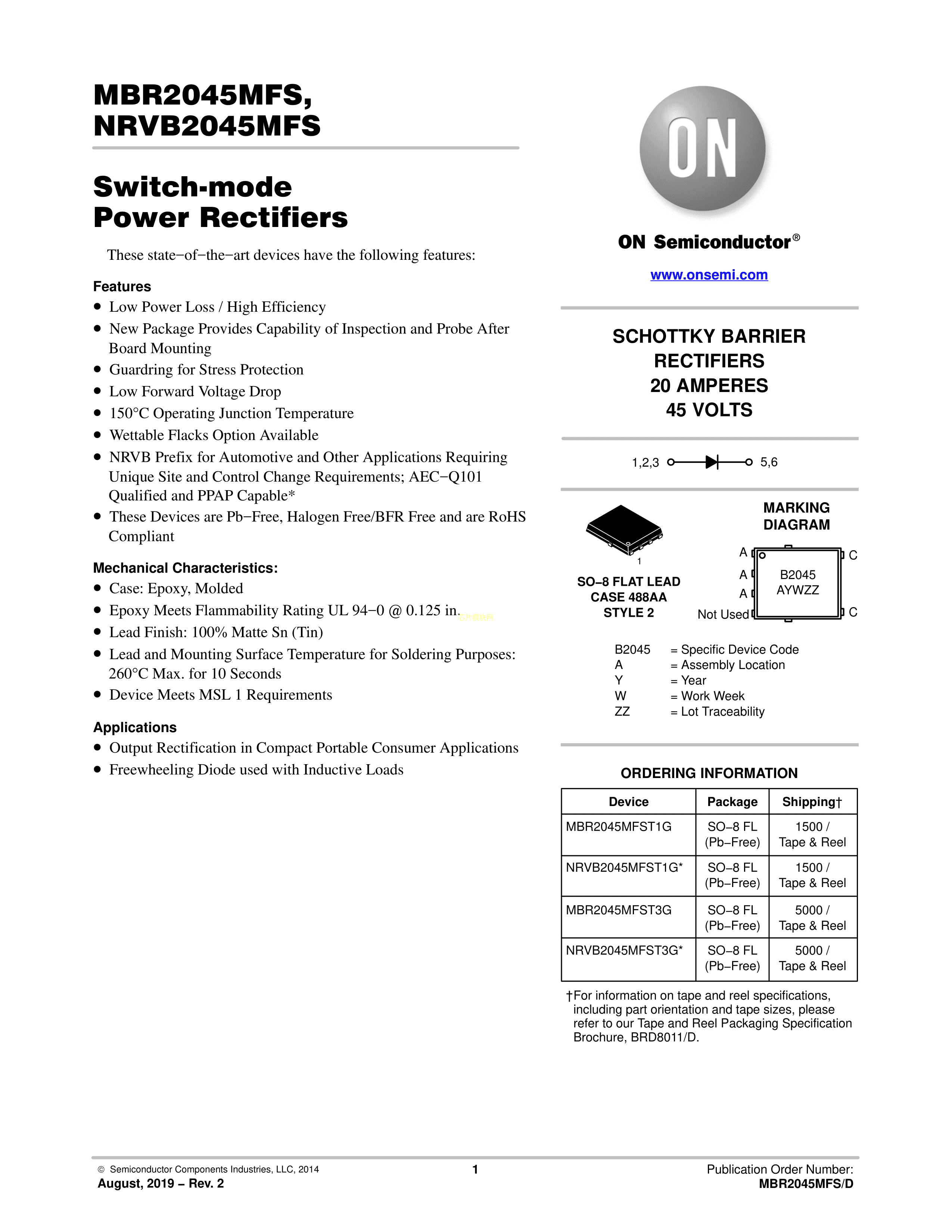 MBR2045MFST1G数据手册SO-8FL封装onsemi(安森美)PDF规格书,中英文下载