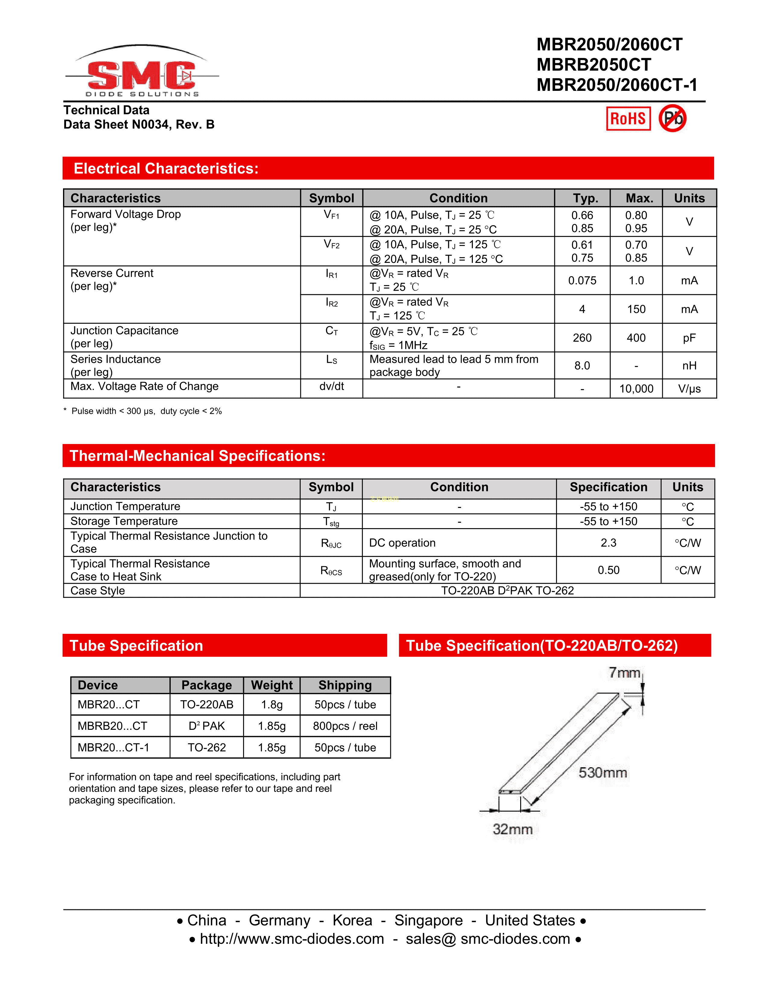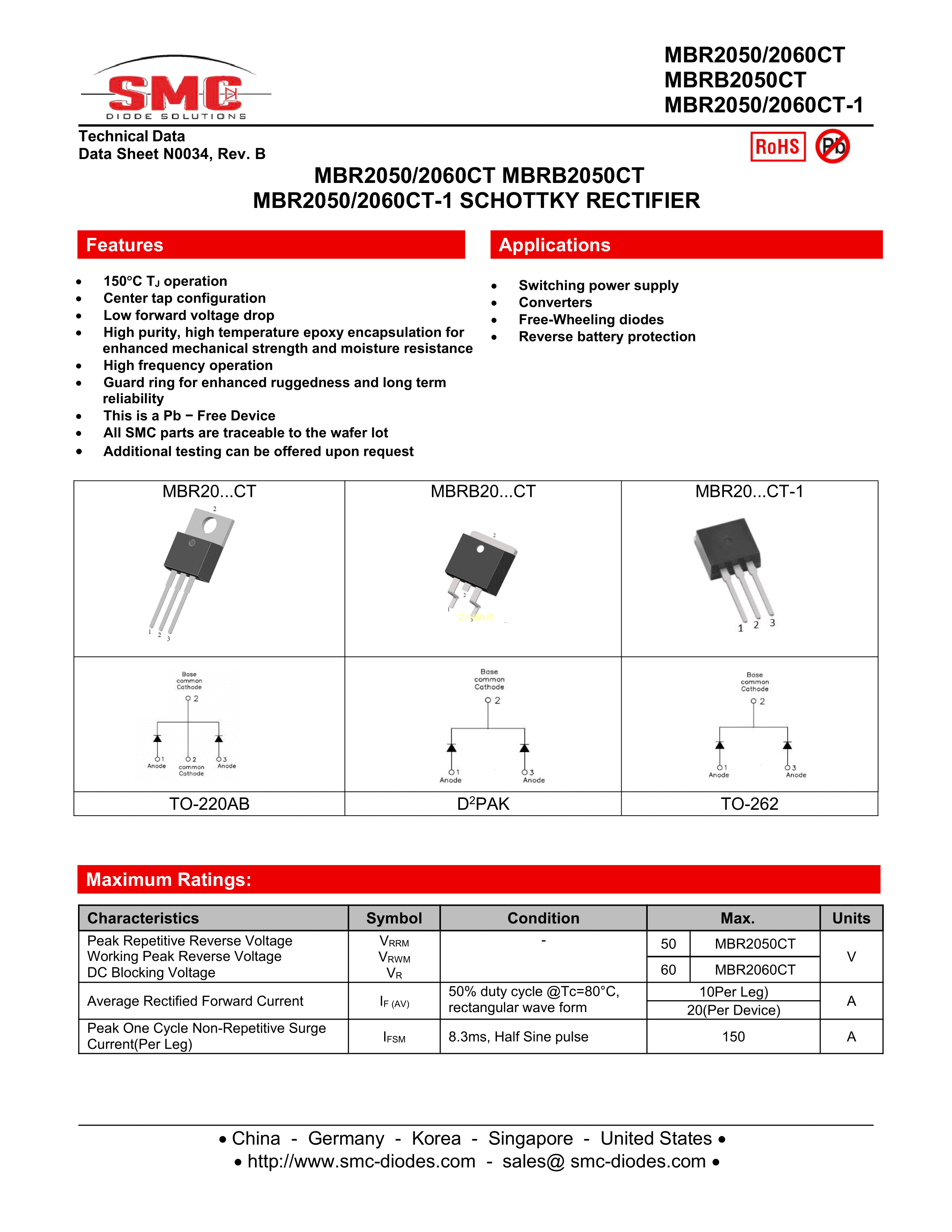 MBR2050CT数据手册TO-220AB封装SMC(桑德斯)PDF规格书,中英文下载