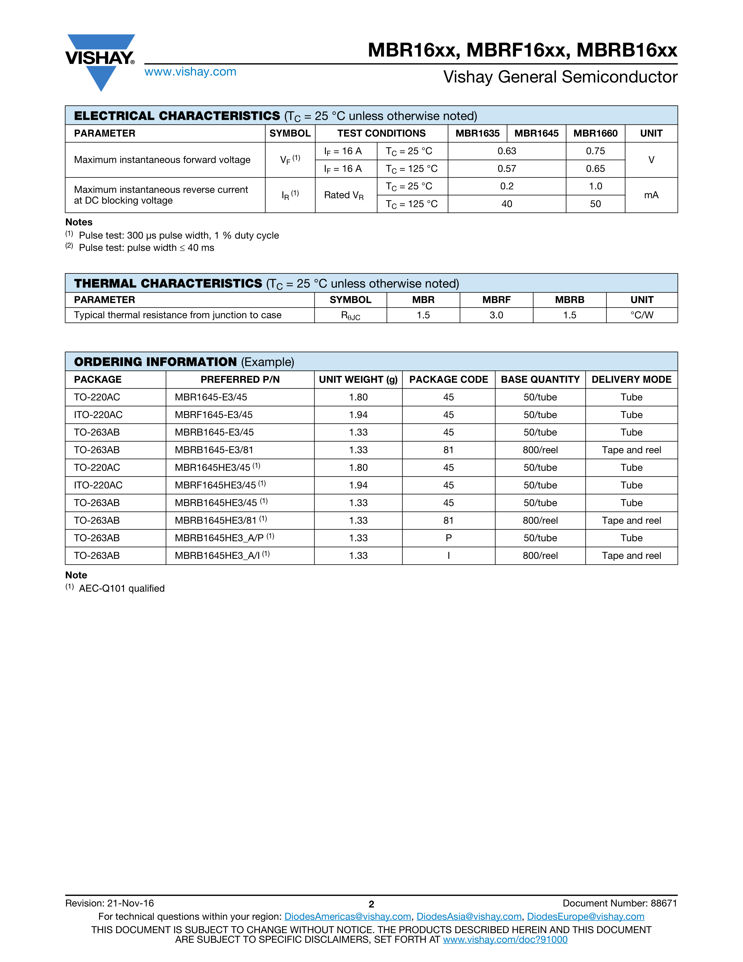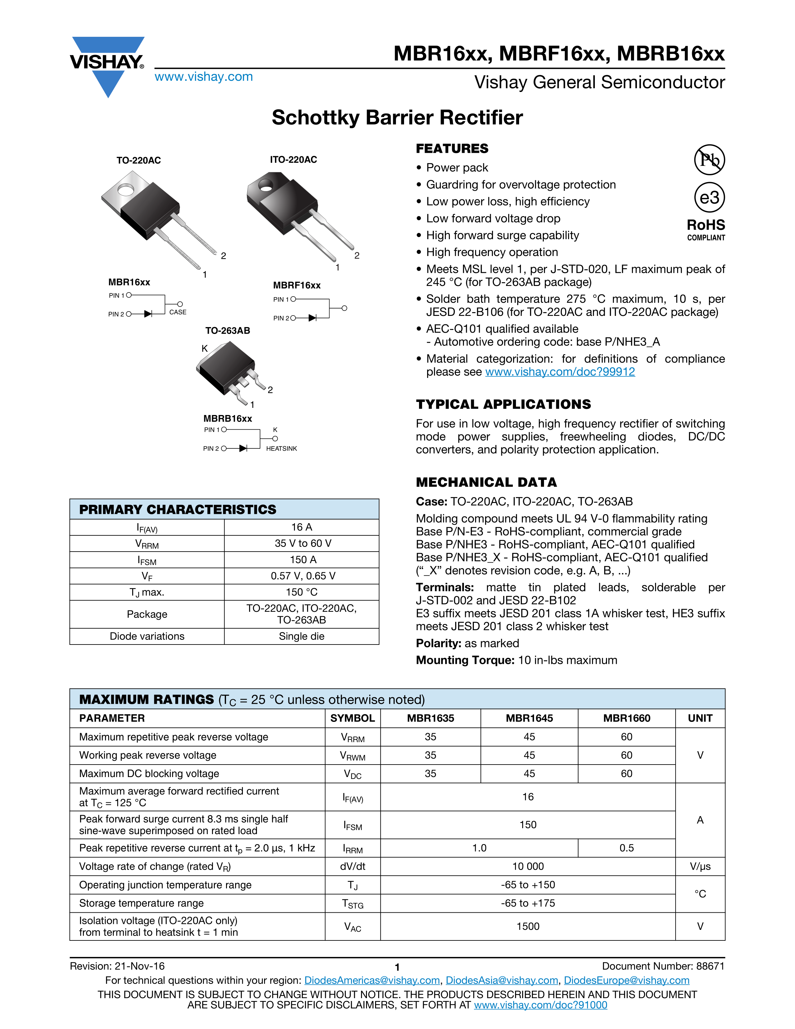 MBRB1660-E3-45数据手册TO-263AB封装VISHAY(威世)PDF规格书,中英文下载