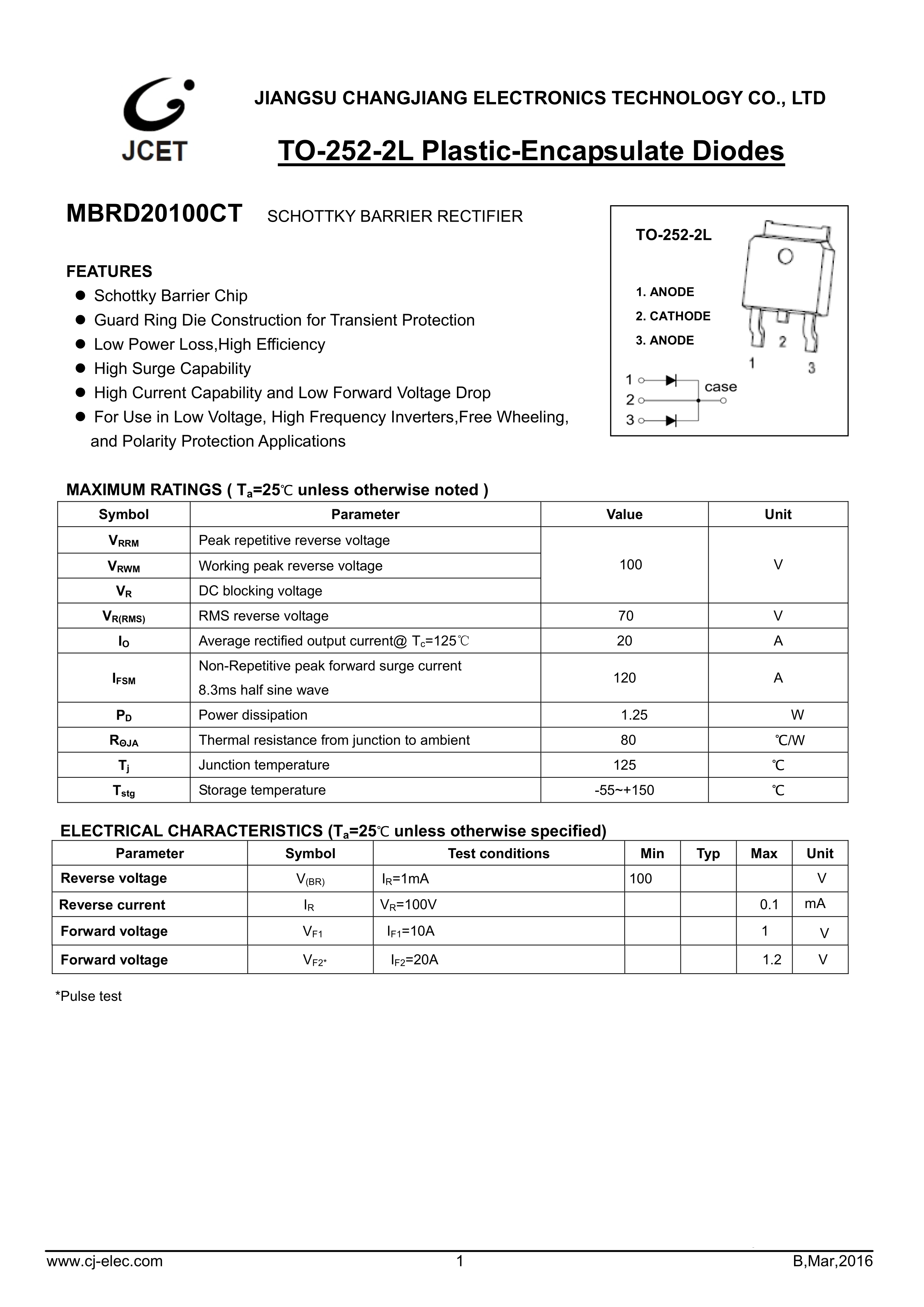MBRD20100CT数据手册TO-252-2(DPAK)封装CJ(江苏长电-长晶)PDF规格书,中