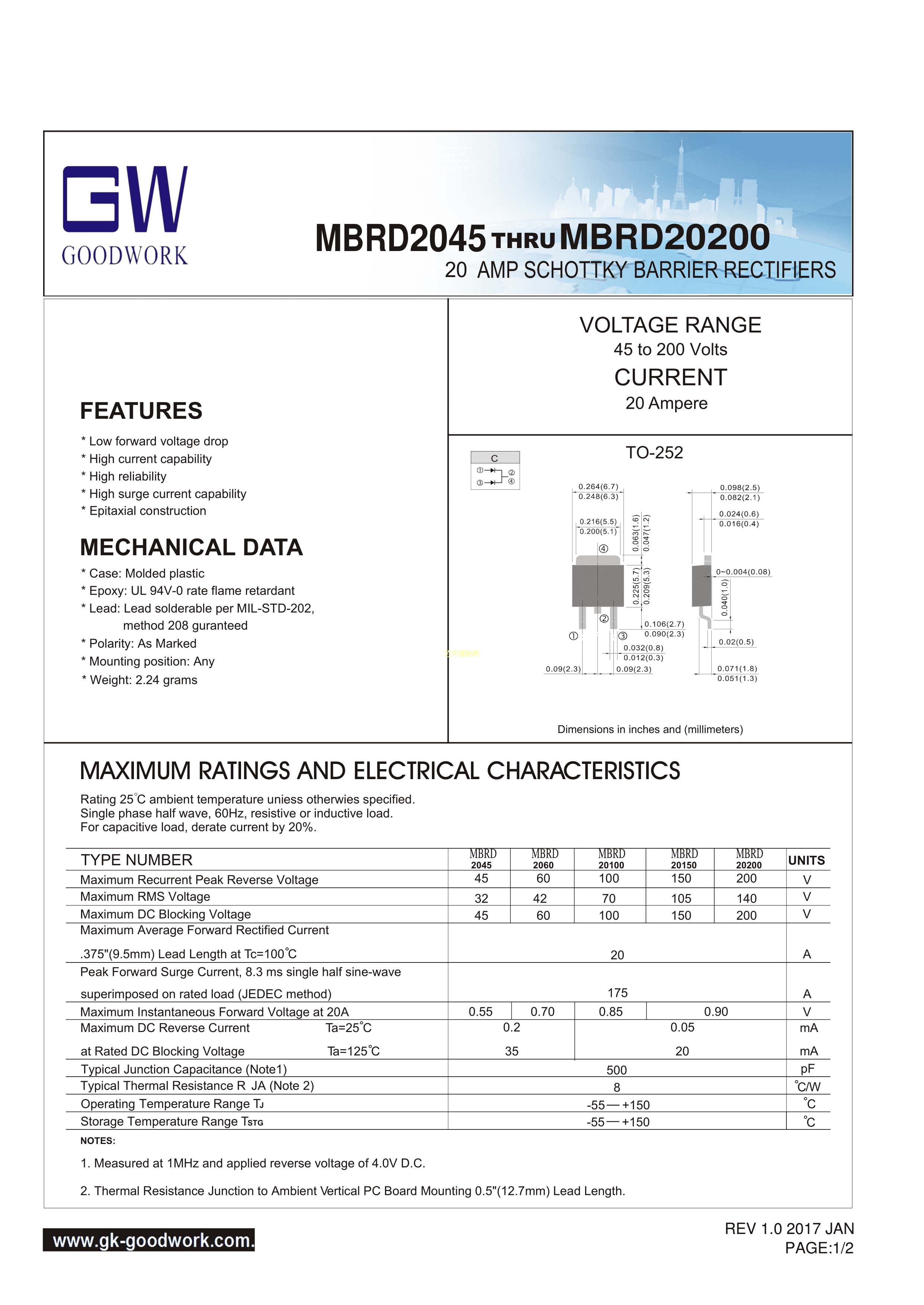 MBRD20150数据手册TO-252封装GOODWORK(固得沃克)PDF规格书,中英文下载
