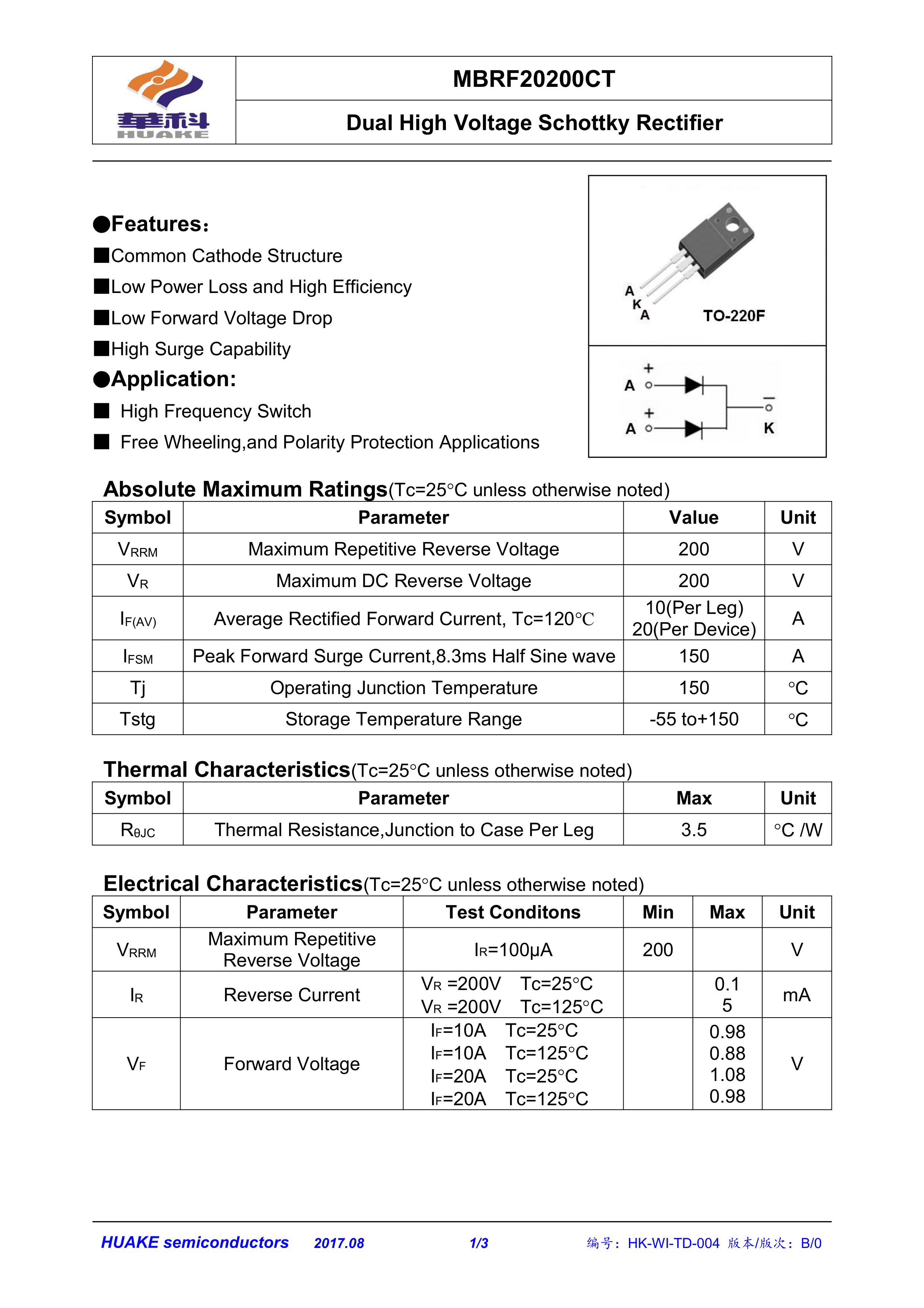MBRF20200CT数据手册TO-220F封装HUAKE(华科)PDF规格书,中英文下载